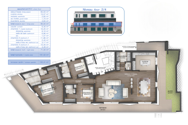 A beautiful, bright living room opens onto the dining room and a top-of-the-range, fully-equipped kitchen. The flat has 3 spacious bedrooms, each with its own shower room for your comfort.