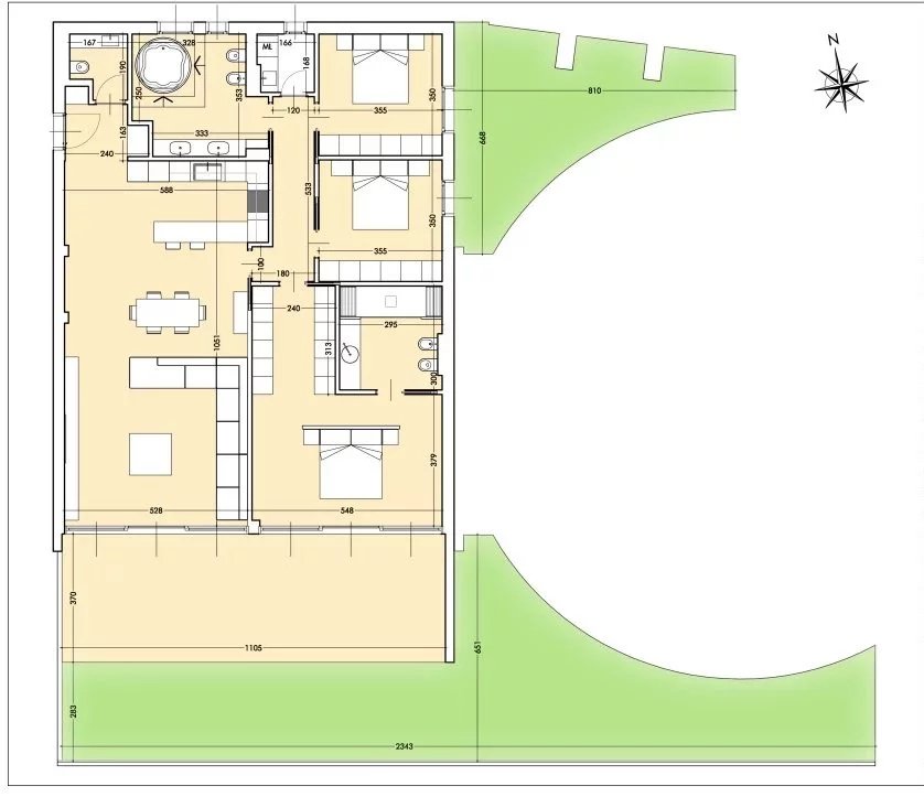 This 4-room apartment consists of a custom-made living/kitchen area, 3 beautiful bedrooms, and 2 bathrooms, as well as a terrace with an area of 41.35 m2 and a private garden of 107 m2.