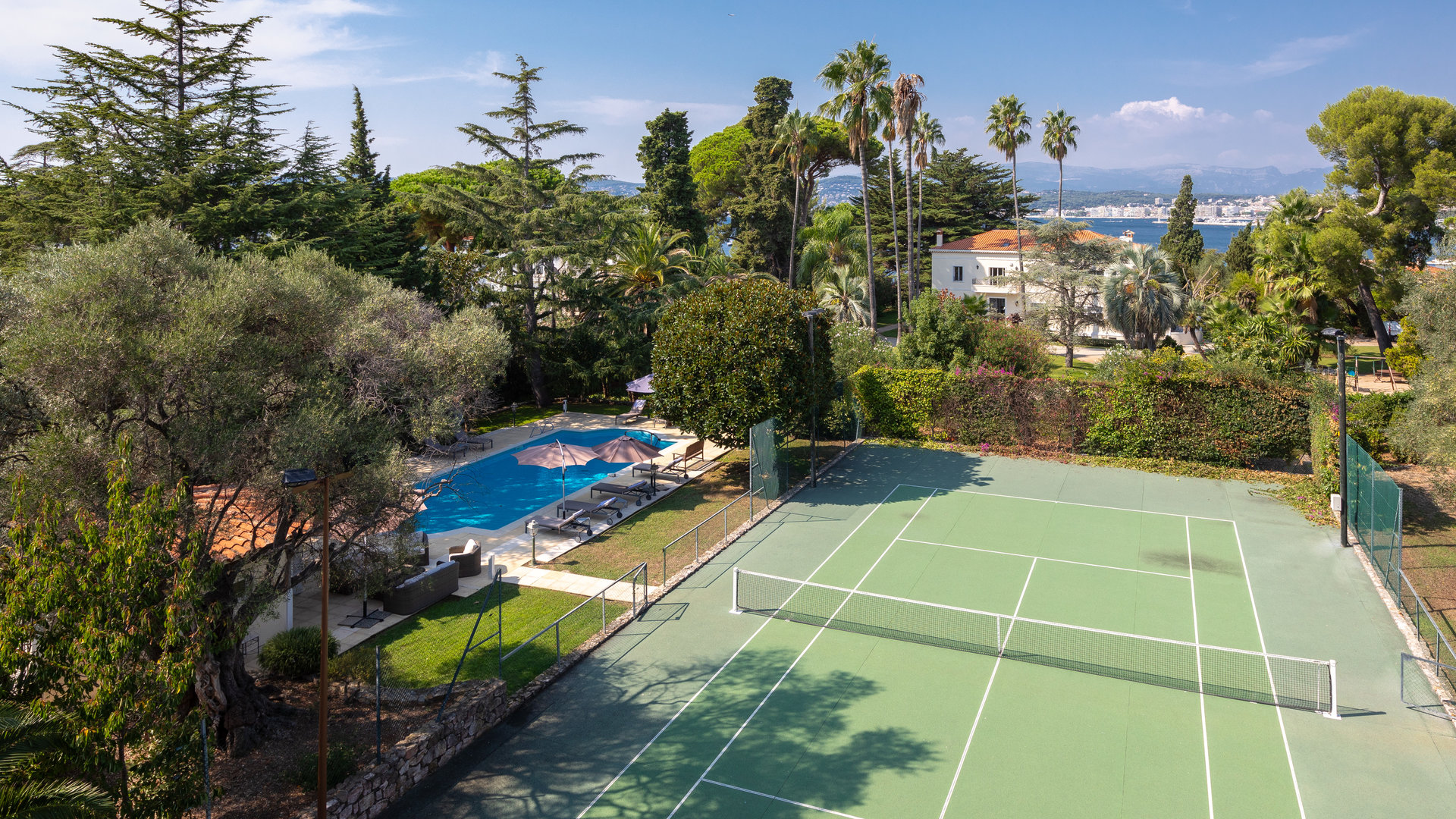 Three garages. Heated swimming pool. Tennis court.