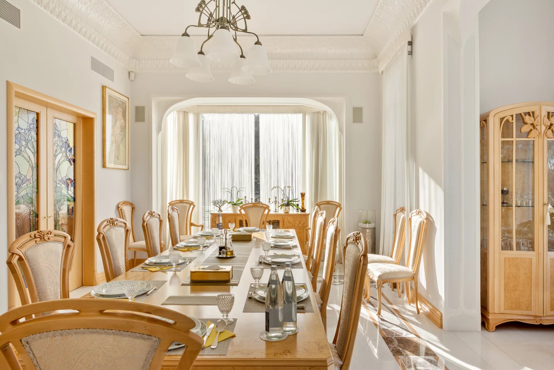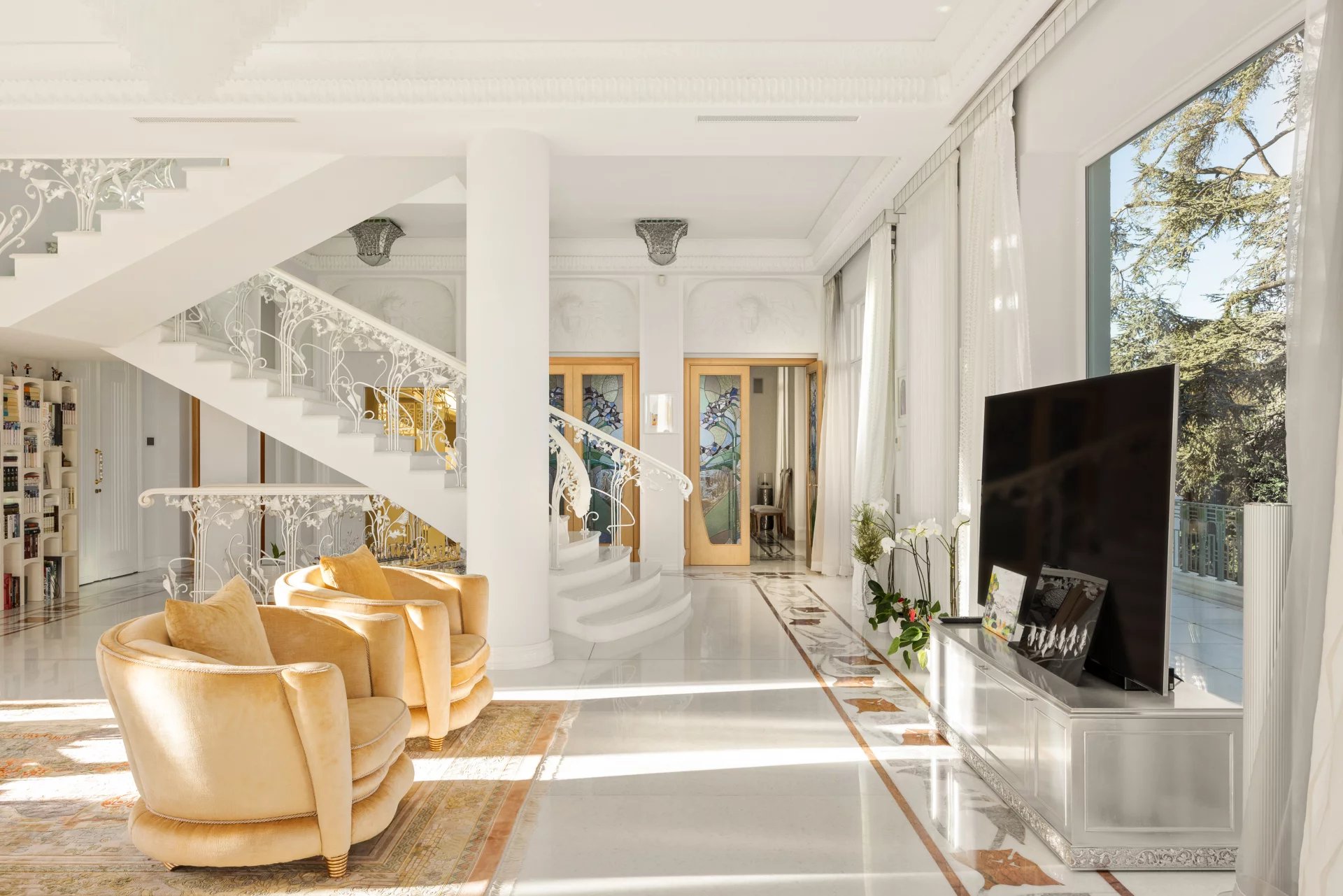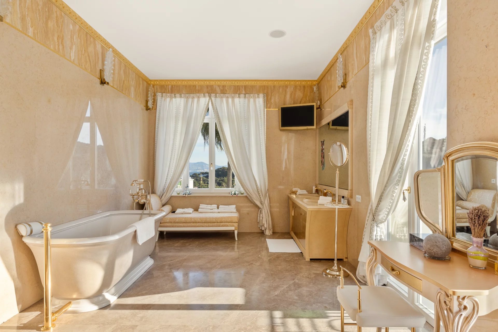 The main villa built on 3 levels includes a vast reception, dining room, master suite, four guest bedrooms, an office, dressing rooms, and a gym.