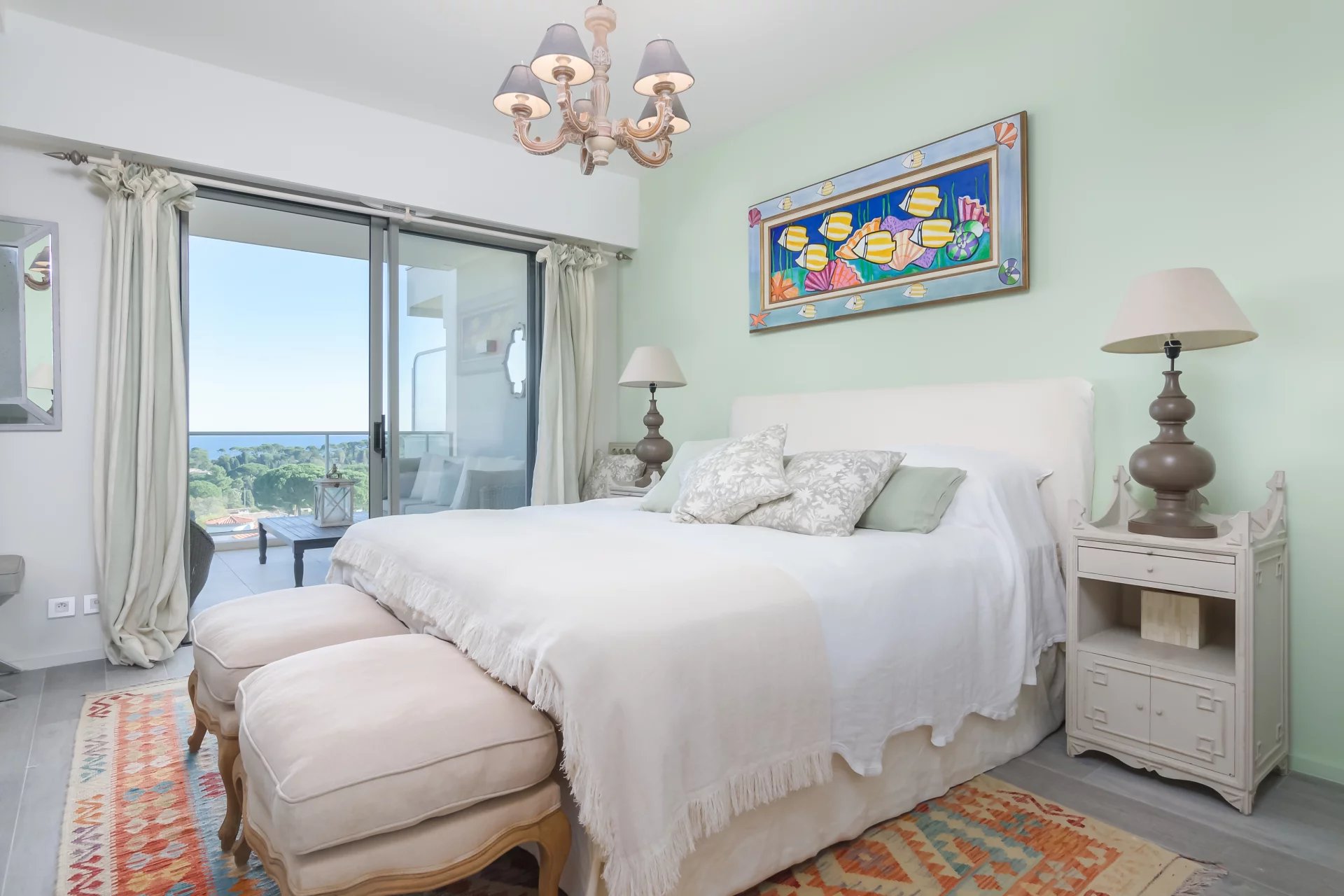 This unique apartment has a living area of around 170 m2. It comprises an entrance hall, a reception room with dining area opening onto a terrace, a fitted kitchen, two bedrooms with en suite shower rooms and sea views, an additional bedroom with separate shower room. All rooms enjoy panoramic sea views.