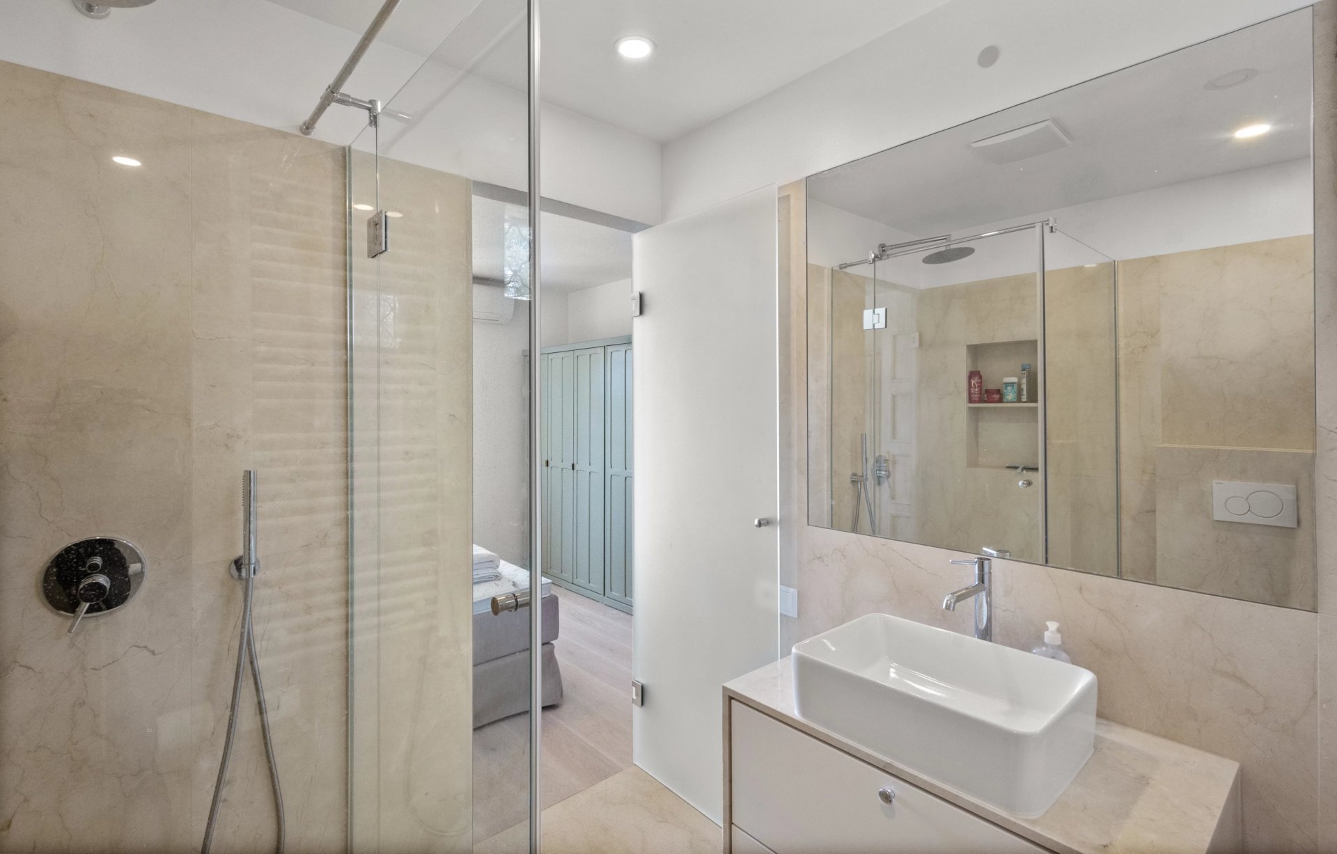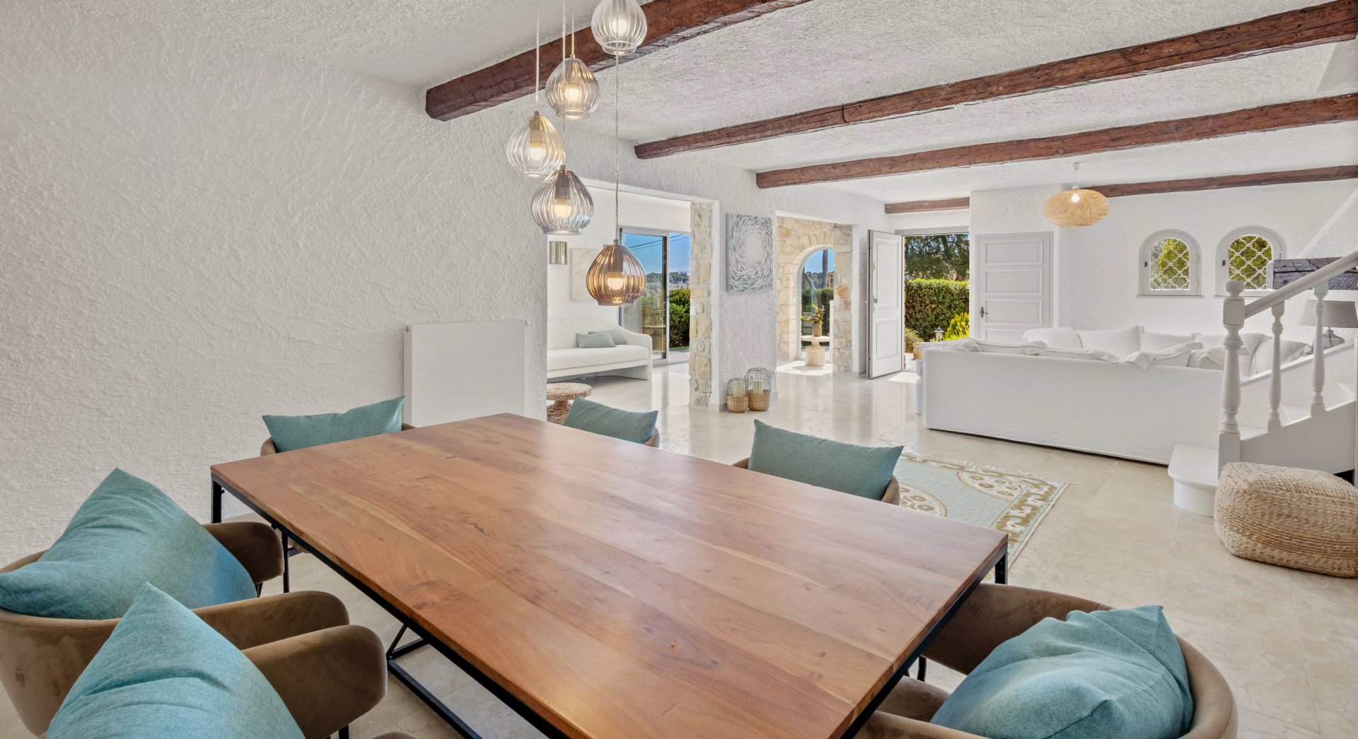 The outdoor areas are ideal for relaxation, with the pool on one side and, on the other, a large and deep terrace with sea view — perfect for convivial meals.
