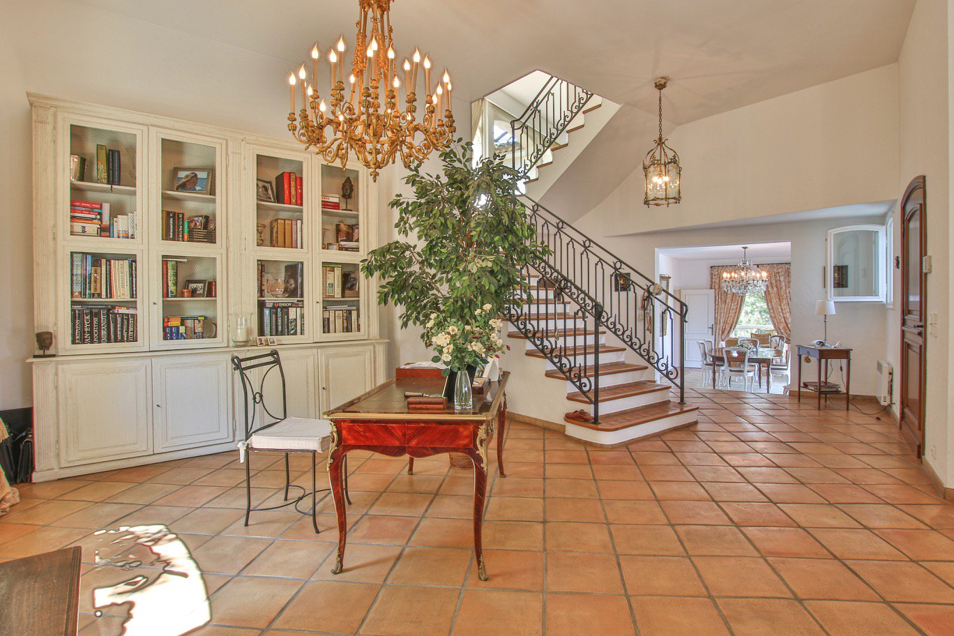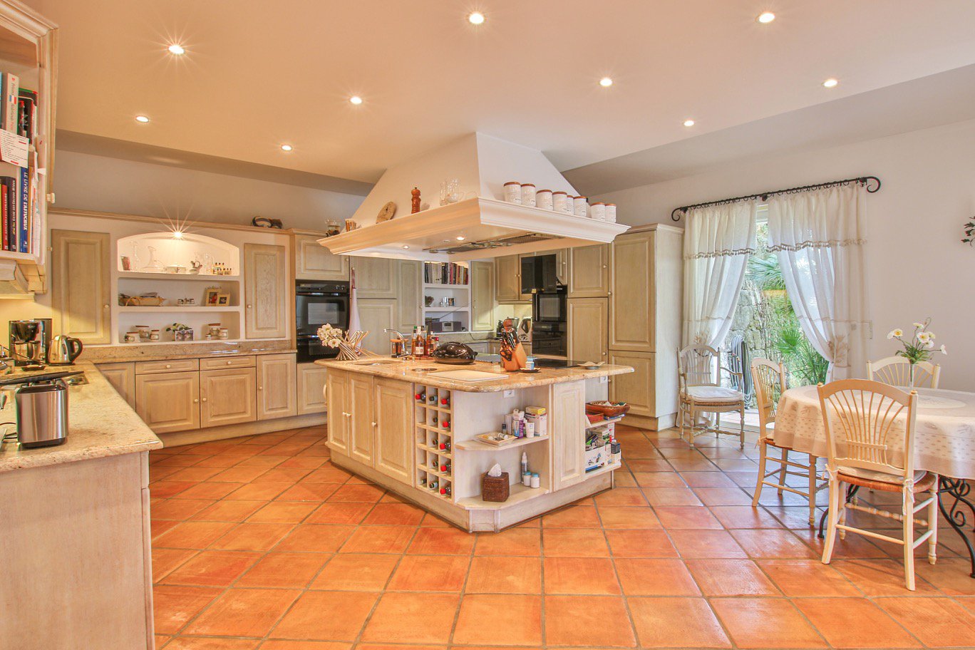 Made up of an entrance hall, spacious living room with fireplace and high ceilings 3.50 m, dining room, large kitchen, all opening onto the pool and garden. Guest toilet.
