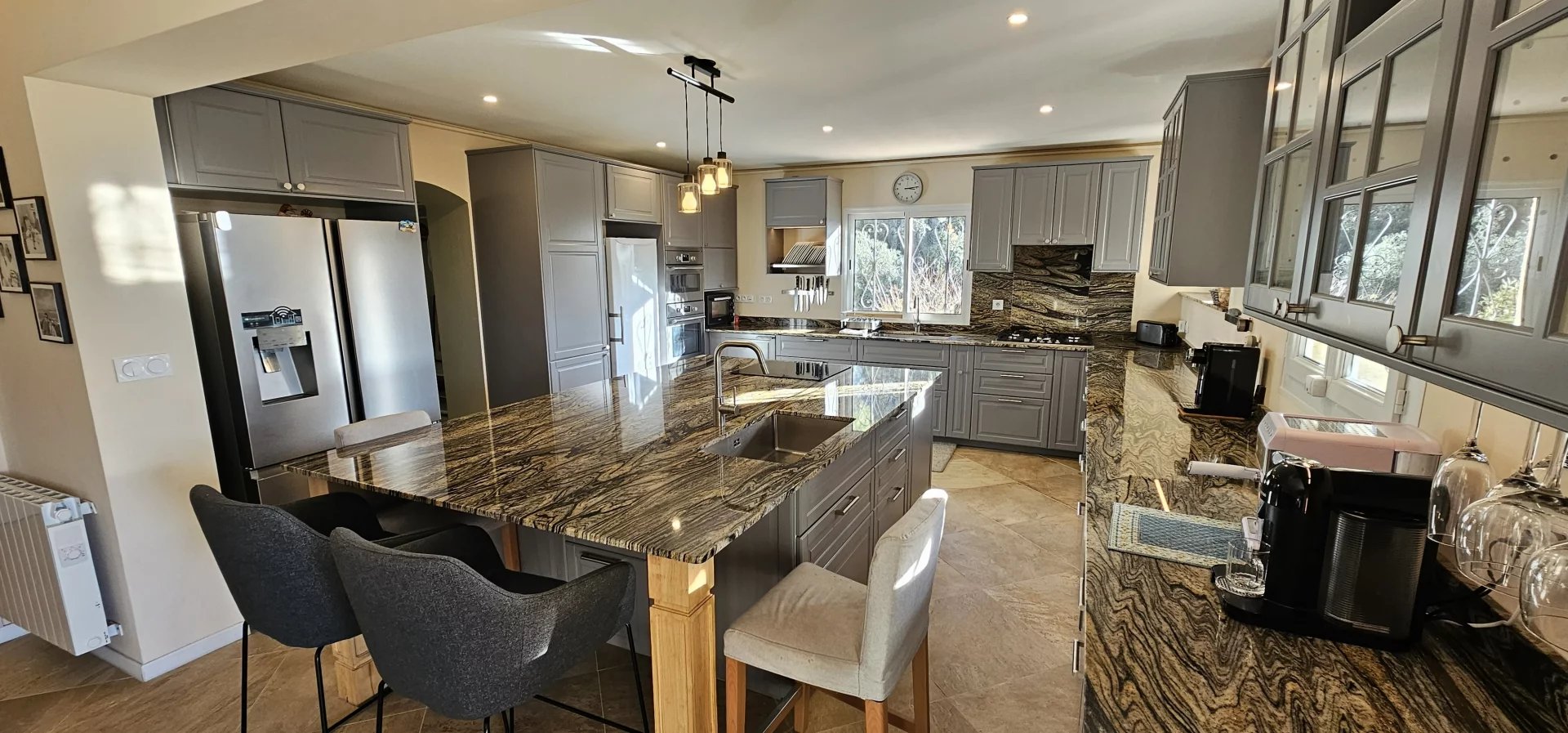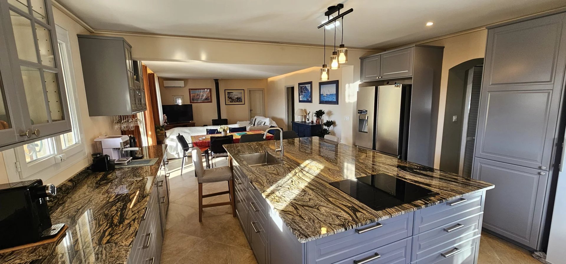 The property features a spacious living area with a large fully equipped open-plan kitchen, designed for comfortable everyday living and entertaining. The villa includes four bedrooms, one bathroom, and three shower rooms, as well as a large laundry room, an atelier, and an independent 20 m² space ideal for a studio, office, or guest accommodation.