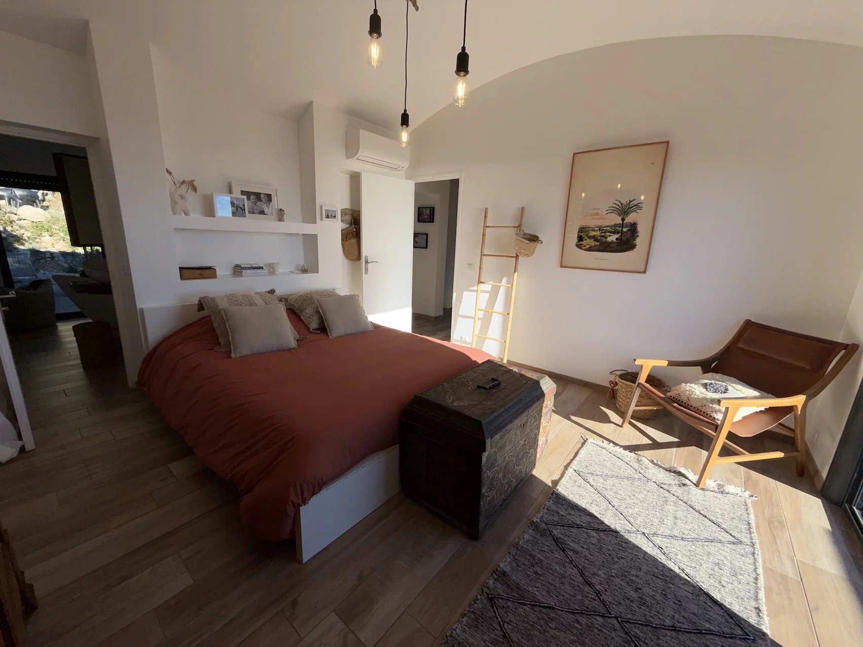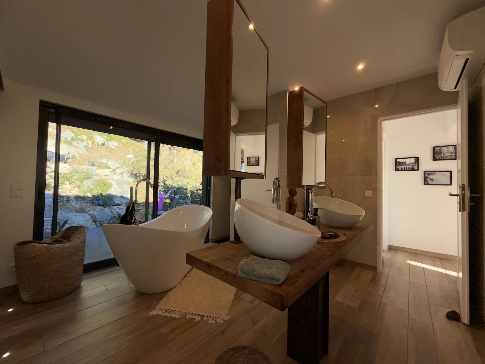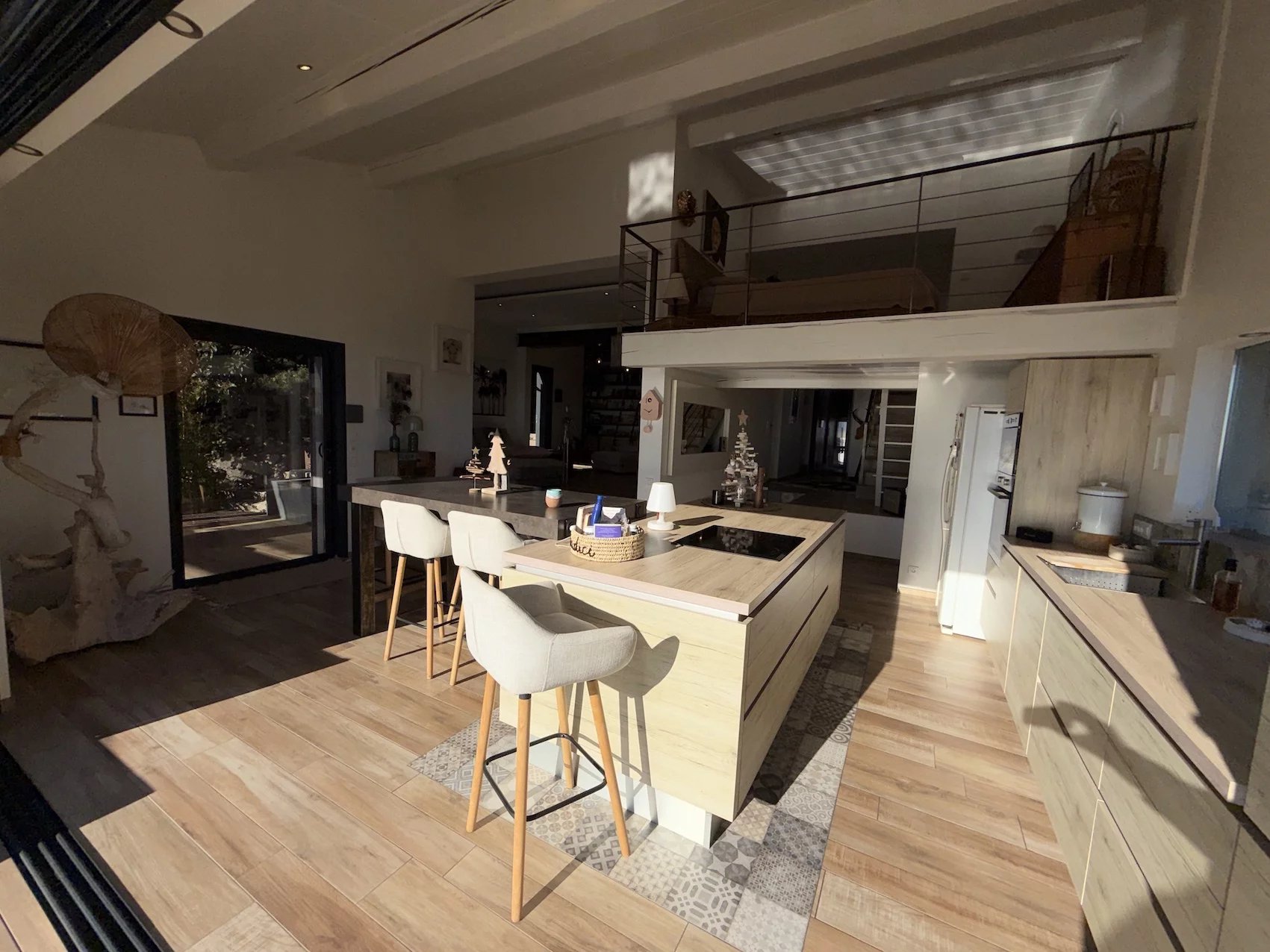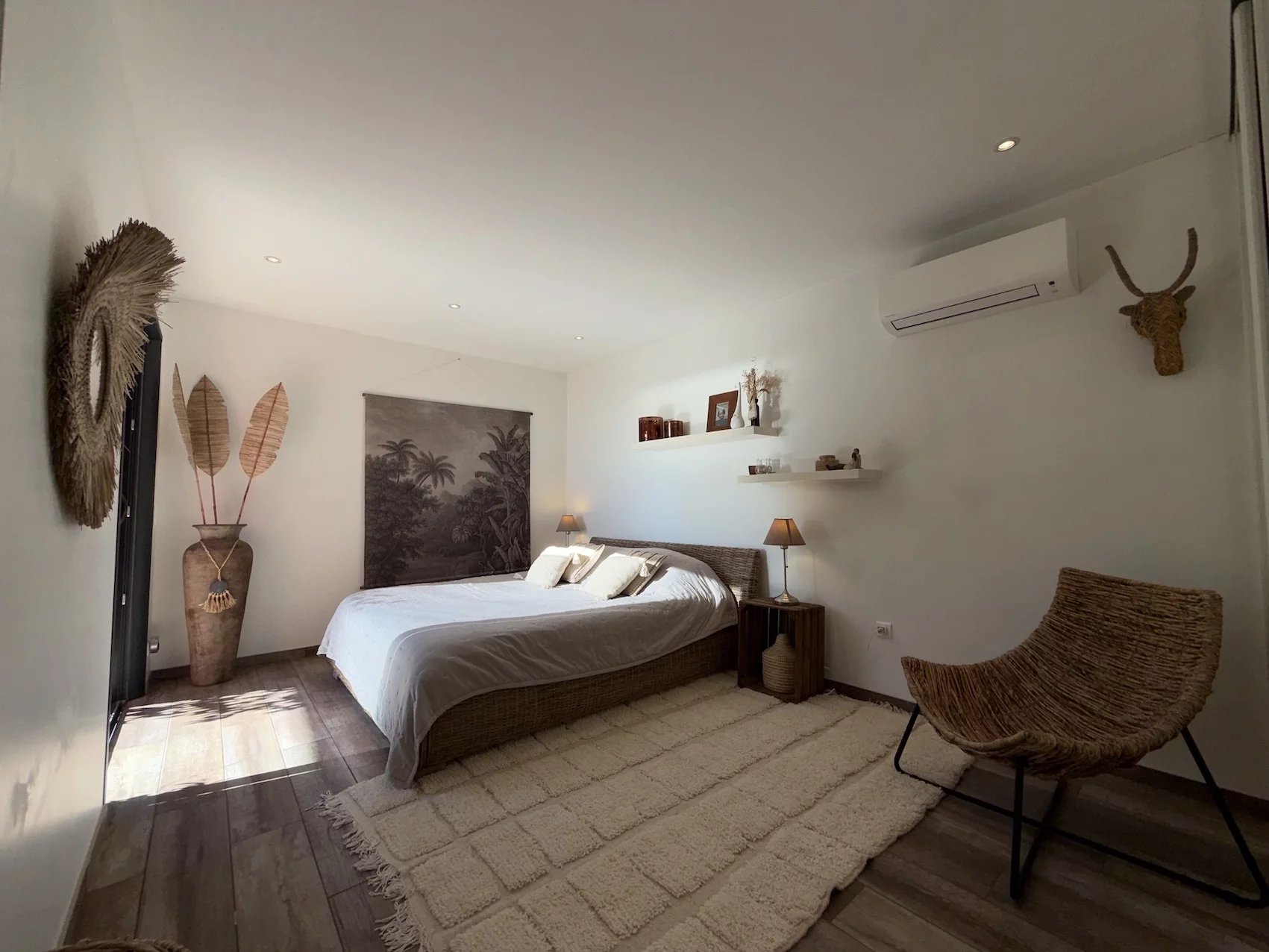 Cosy yet elegant, the villa showcases high-quality materials, carefully chosen to create a warm and refined atmosphere. A grand entrance with high ceilings welcomes visitors, offering remarkable volume. A discreet and functional cloakroom and a pleasant resting area provide a perfect space to enjoy the ambiance.
