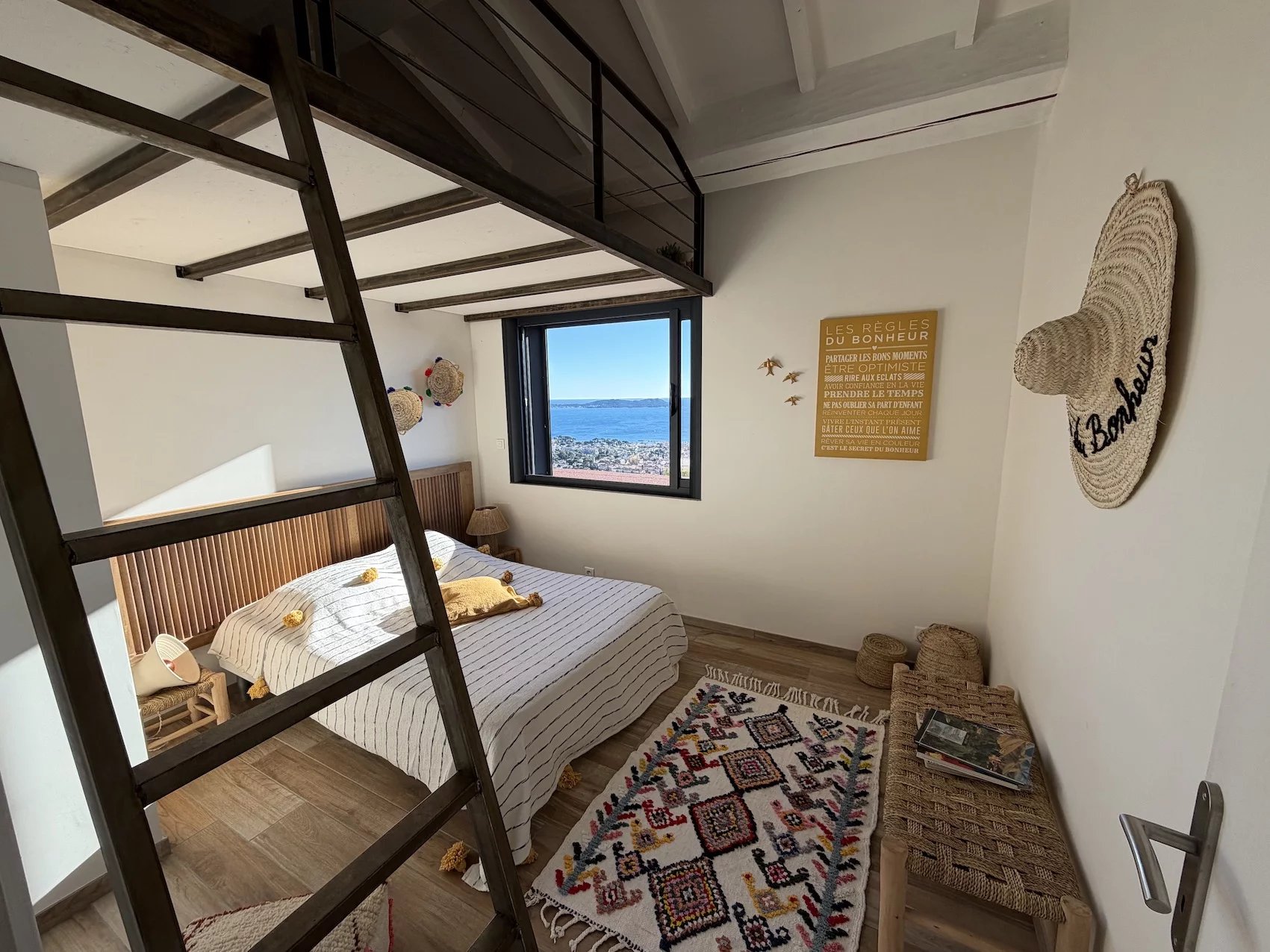 On the same level, a second south-facing bedroom with mezzanine is ideal for comfortably hosting family and guests. On the lower level, an independent bedroom with private shower and WC, along with a spacious room with kitchenette, offers autonomous accommodation for friends or visitors (accessible via the villa’s internal elevator). This level also allows for a home office or playroom.