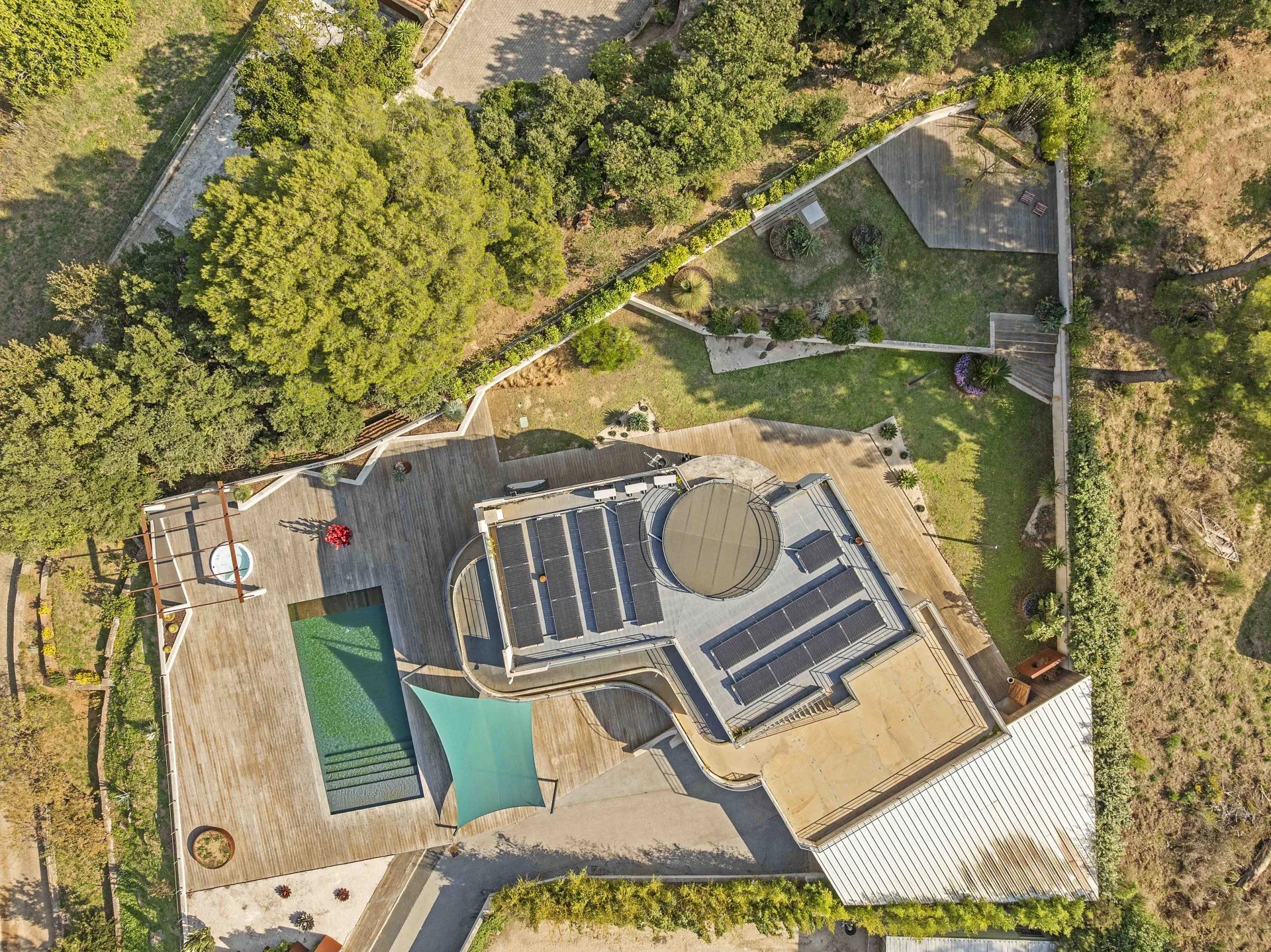 Additional features include reversible air conditioning, water softener, Miele appliances, an insert fireplace, thermal blinds, a thermal cover for the glass roof, shading sails, an indoor/outdoor alarm system with thermal and motion-detection cameras, a large garage for six cars, and a secondary garage.