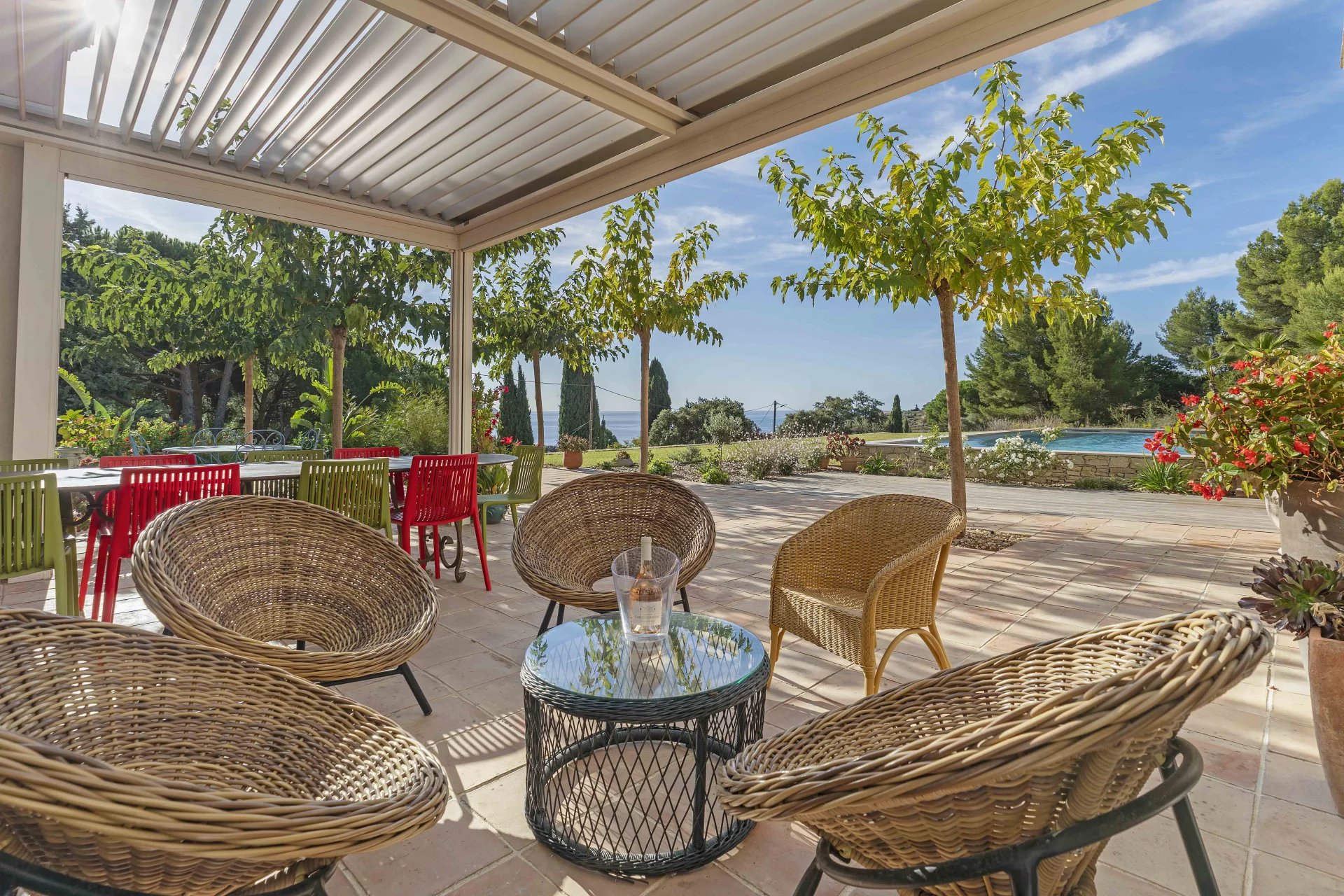 The garden, designed as a living Mediterranean landscape, unfolds in harmonious terraces and secret corners, featuring palms and oleanders. A bioclimatic pergola, cellars, a pantry, and a workshop complete this exceptional setting, creating a lifestyle where serenity, privacy, and natural beauty coexist perfectly.