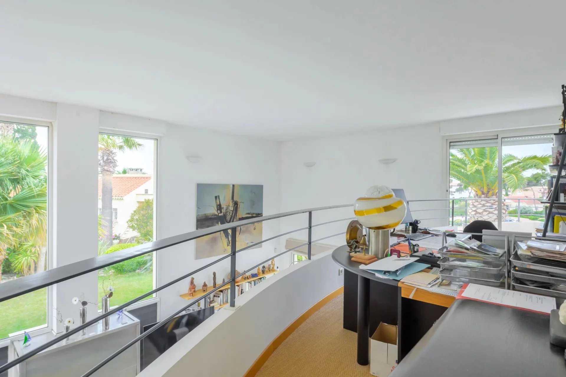 On the upper floor, a mezzanine converted into a home office overlooks the living area, creating a functional and luminous workspace. A corridor leads to three spacious bedrooms, two of which open onto a shared terrace. A modern shower room and ample storage spaces complete this level, perfectly suited for family living.
