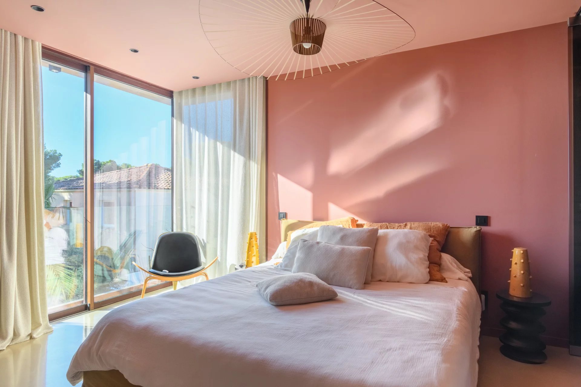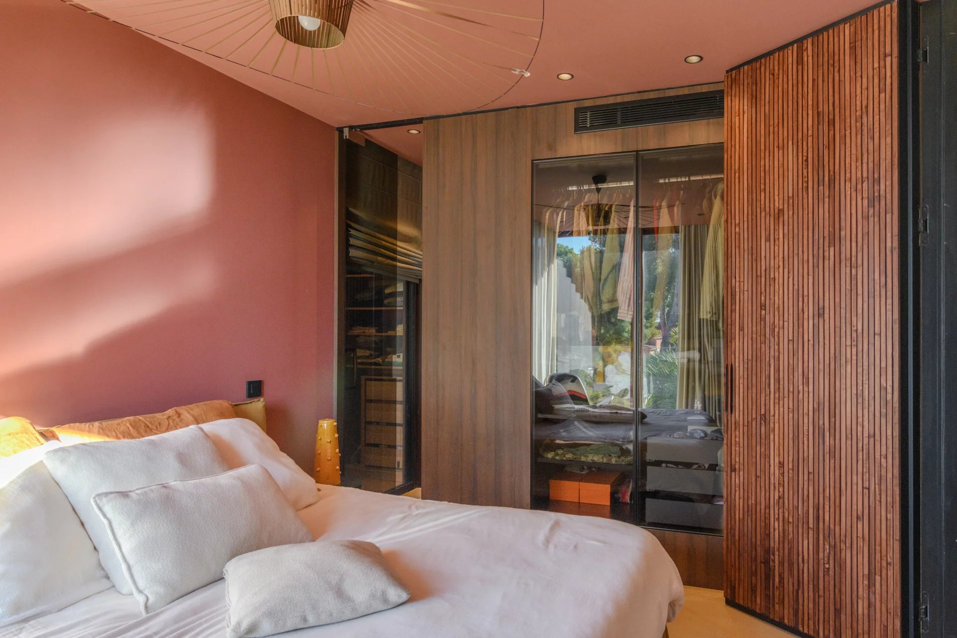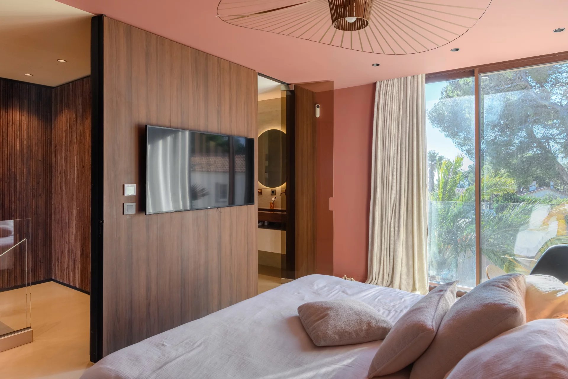 The entrance leads to a first bedroom with its own private shower room perfect for welcoming guests along with a laundry room and guest toilet. A few steps down, the home opens onto a stunning living area where floor-to-ceiling bay windows blur the lines between indoor and outdoor living, overlooking the landscaped garden and swimming pool.