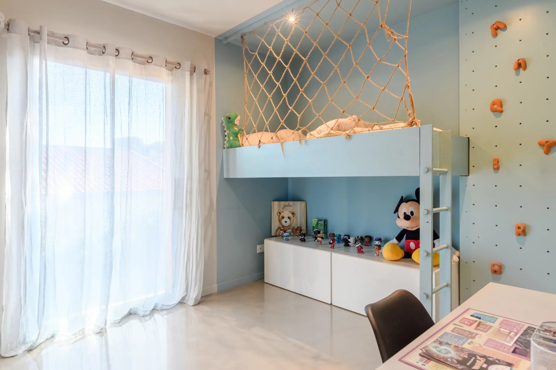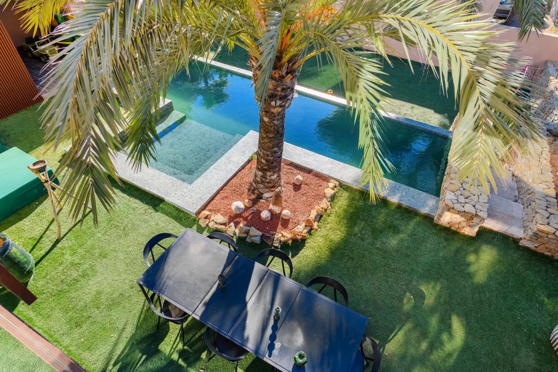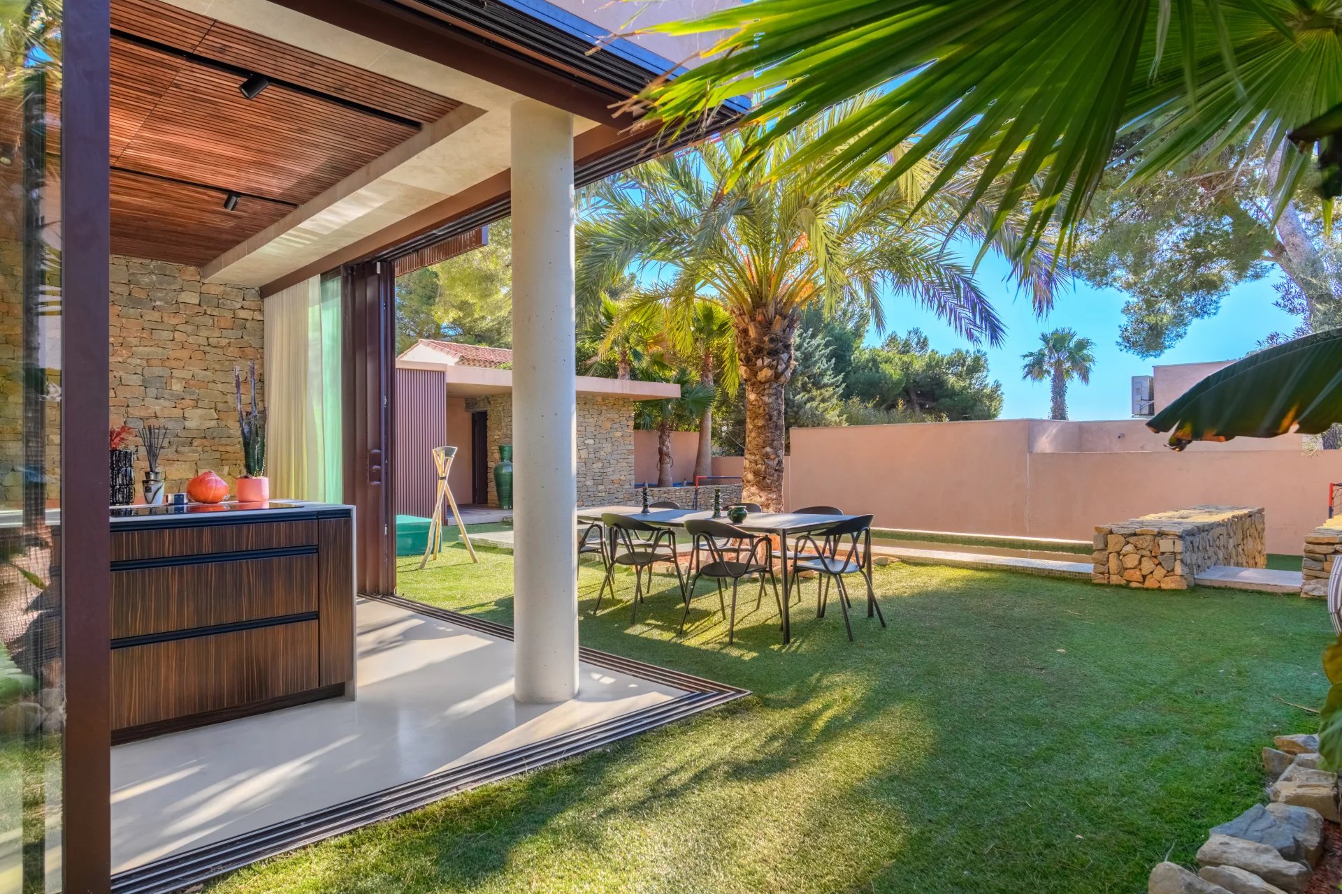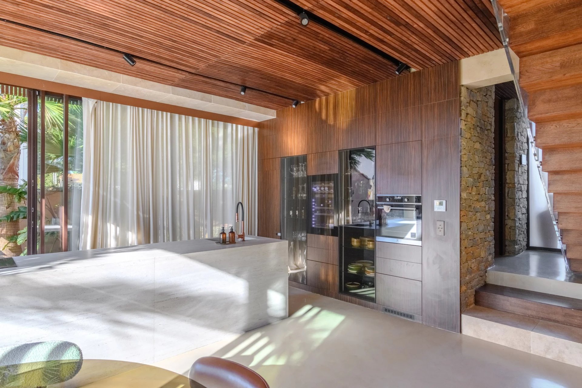 The entrance leads to a first bedroom with its own private shower room perfect for welcoming guests along with a laundry room and guest toilet. A few steps down, the home opens onto a stunning living area where floor-to-ceiling bay windows blur the lines between indoor and outdoor living, overlooking the landscaped garden and swimming pool.