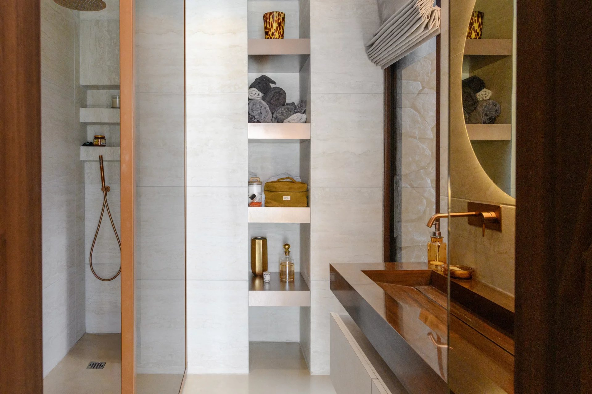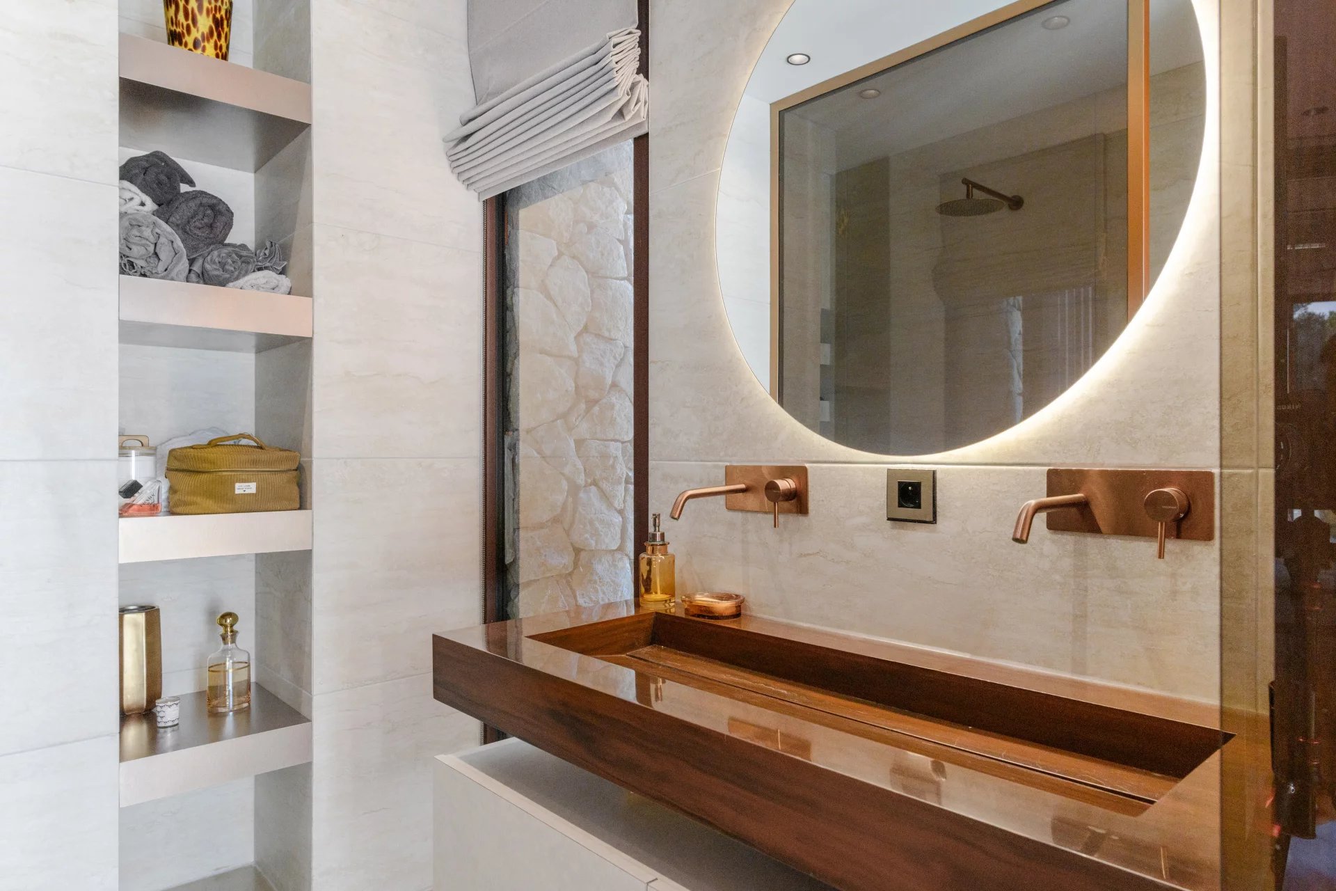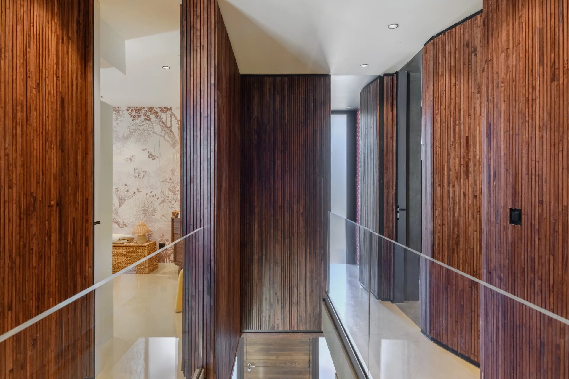 Upstairs, an elegant wooden-clad hallway discreetly conceals the entrances to two additional bedrooms, as well as the master suite featuring a dressing room and ensuite shower room. A separate bathroom and toilet complete this level.