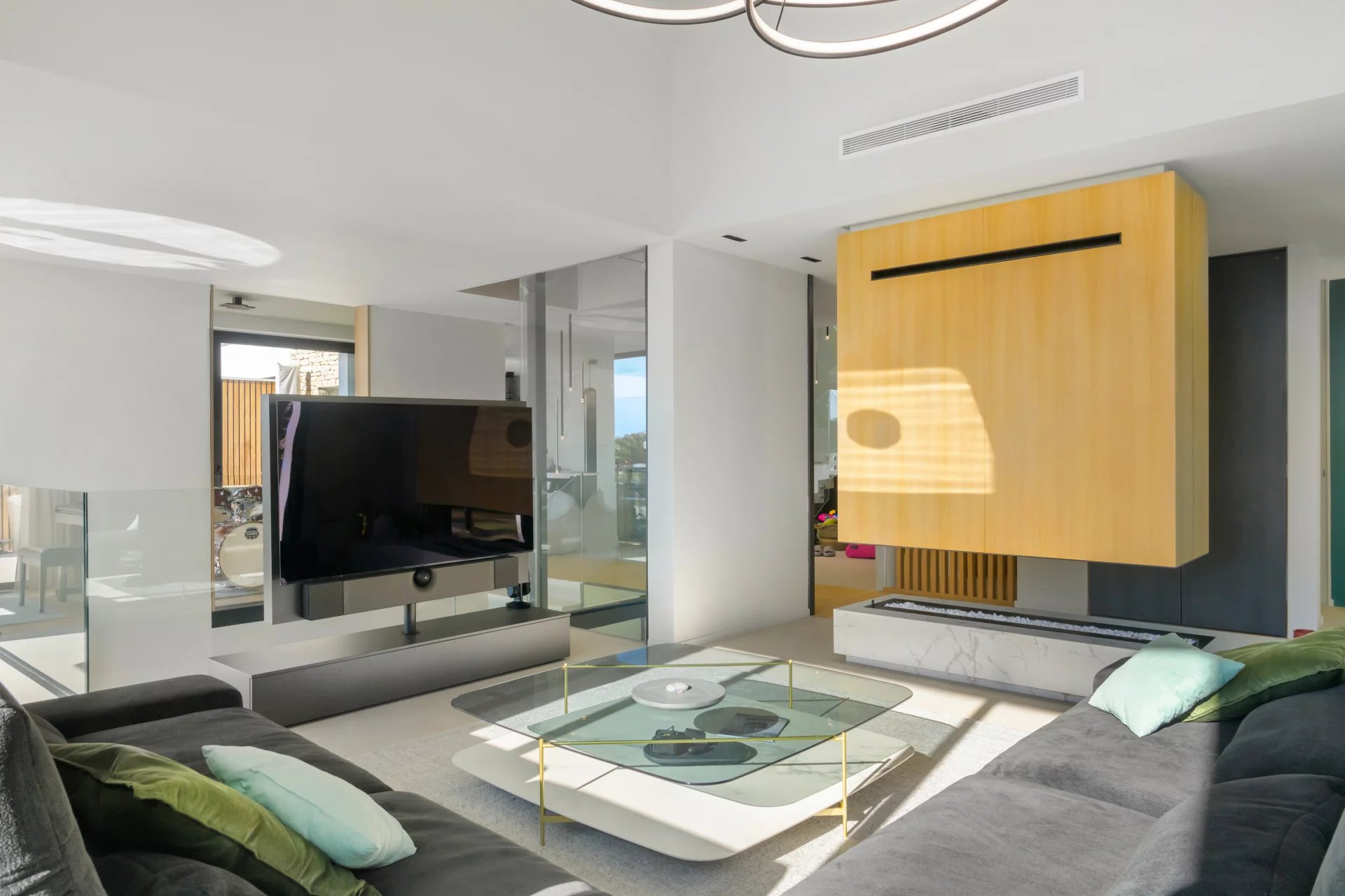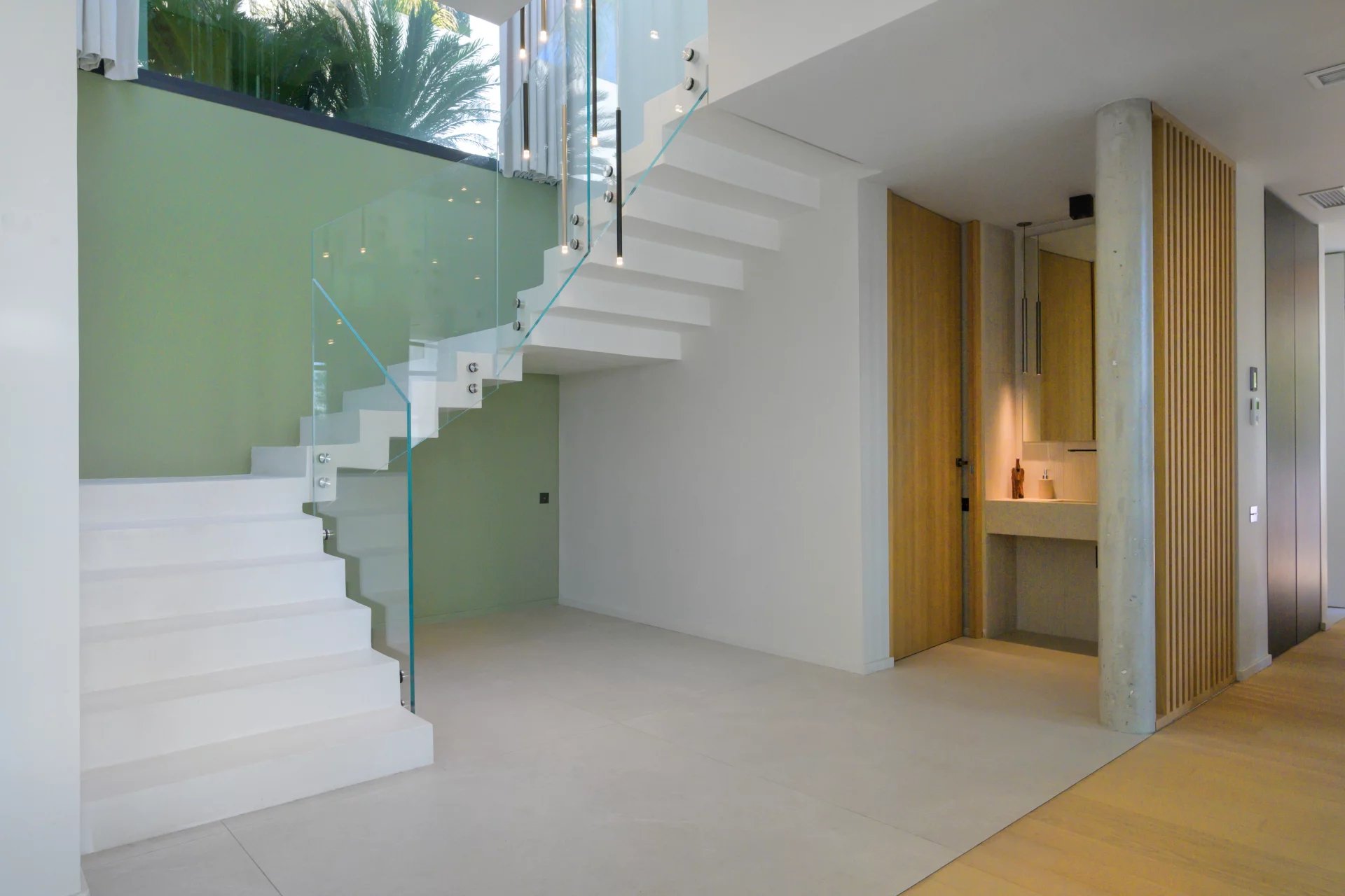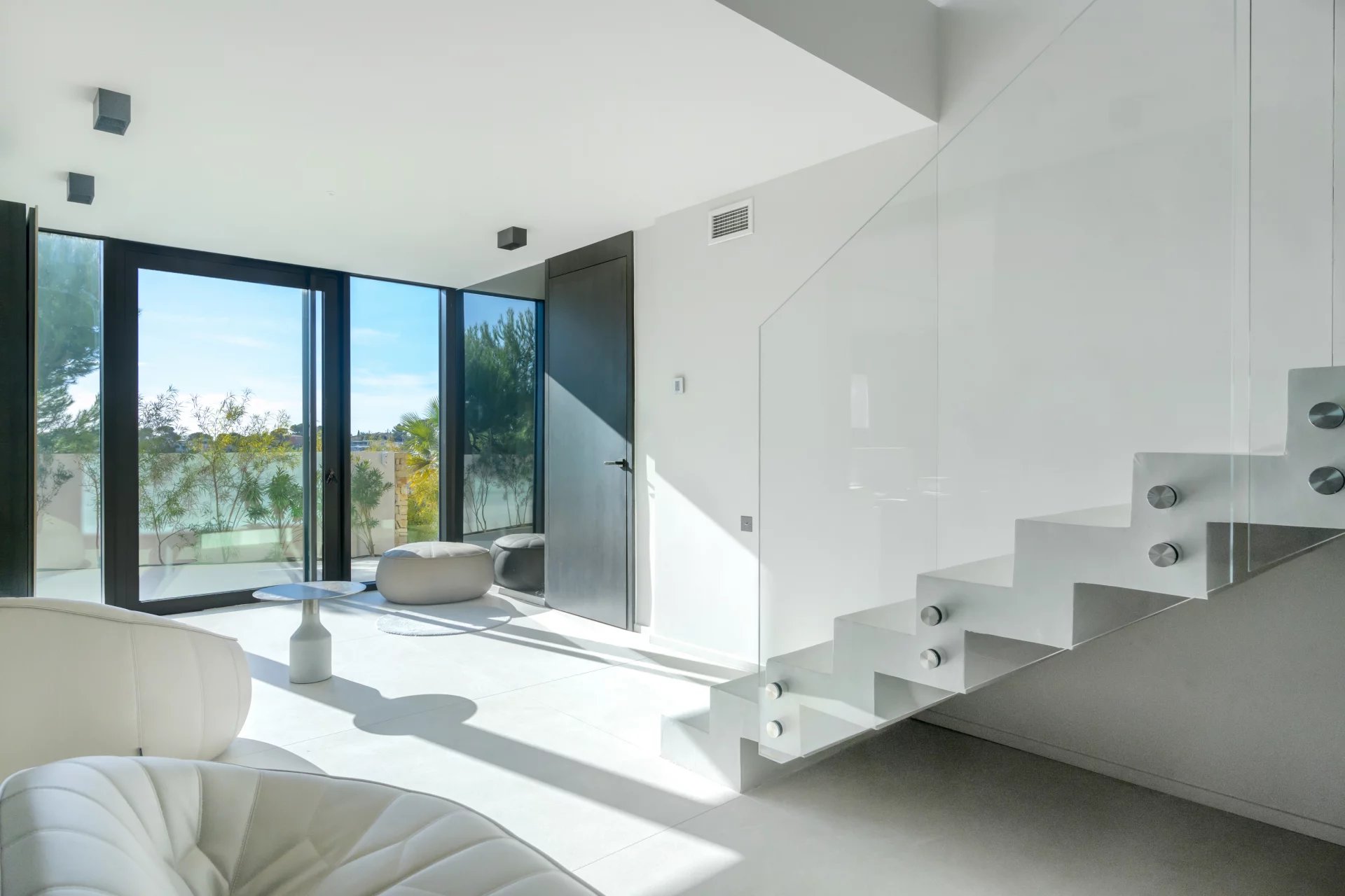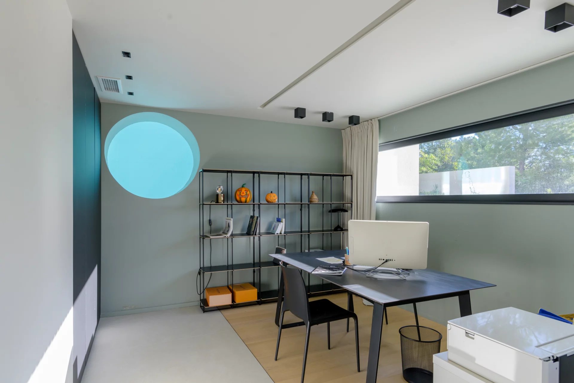 Once inside this stunning family home you are welcomed by a majestic entrance hall featuring a glass elevator shaft. This level includes a private office with a porthole overlooking the pool, a fully equipped gym with a dedicated spa area featuring a jacuzzi, sauna, and shower, a state-of-the-art home cinema with a retractable screen and large TV, a games room, and a spacious 50 m2 garage.