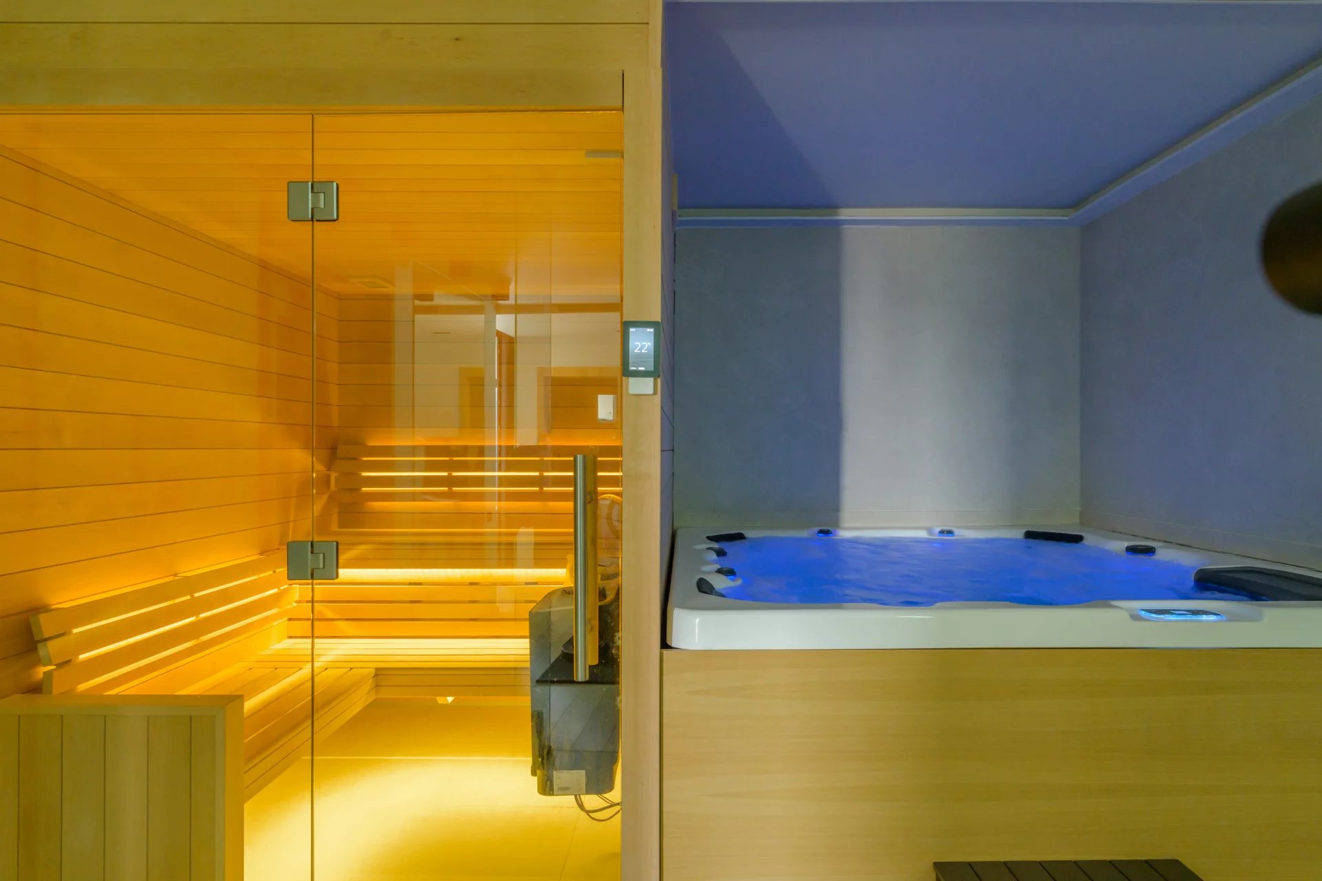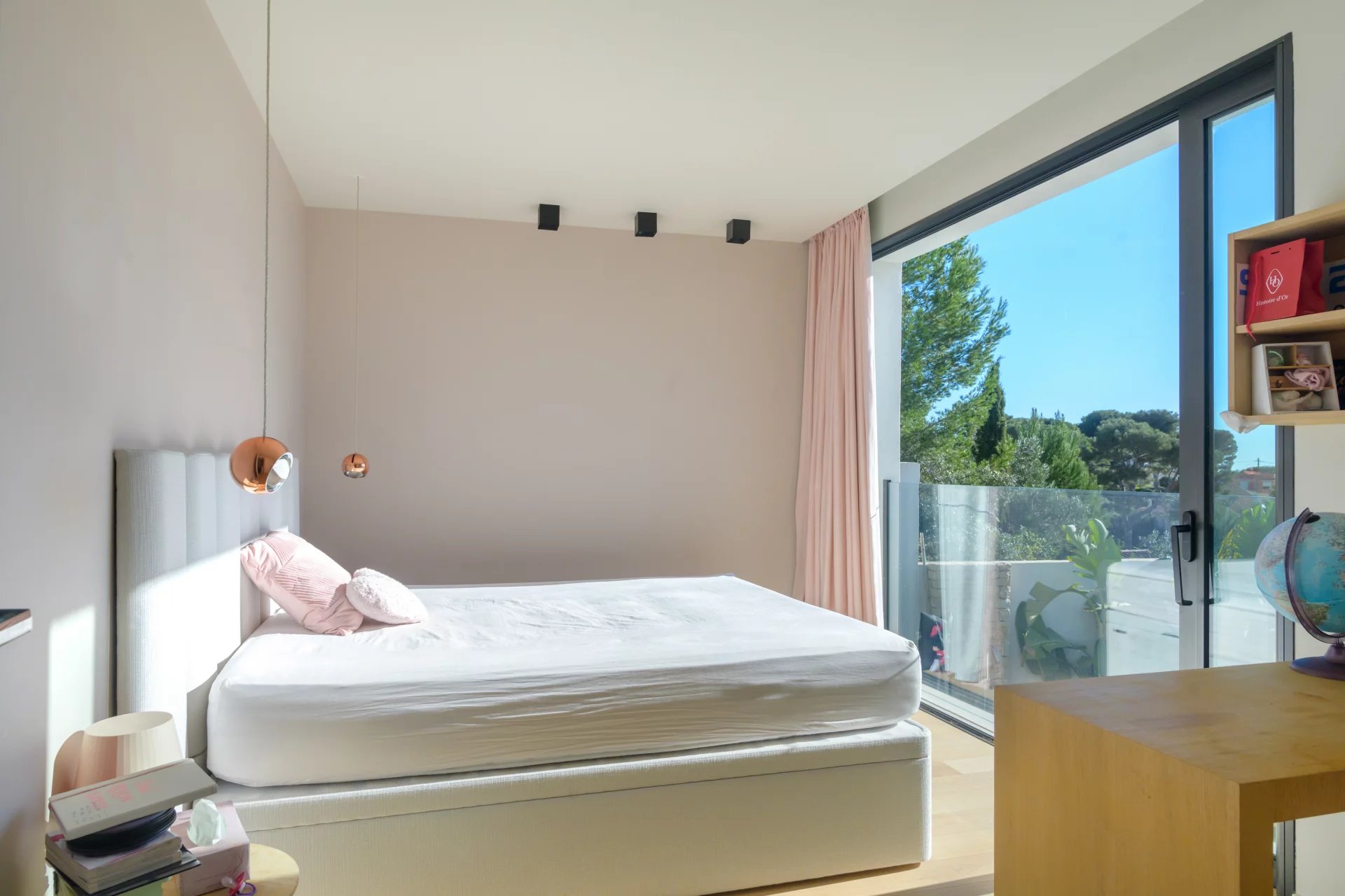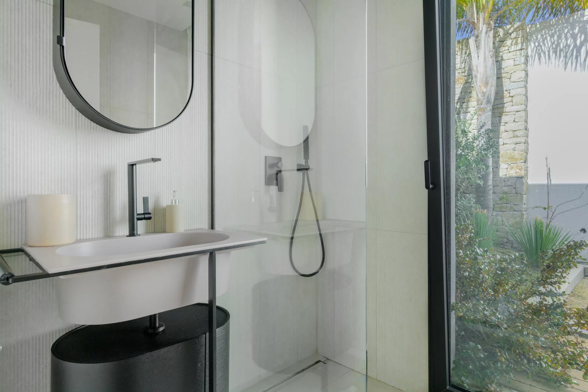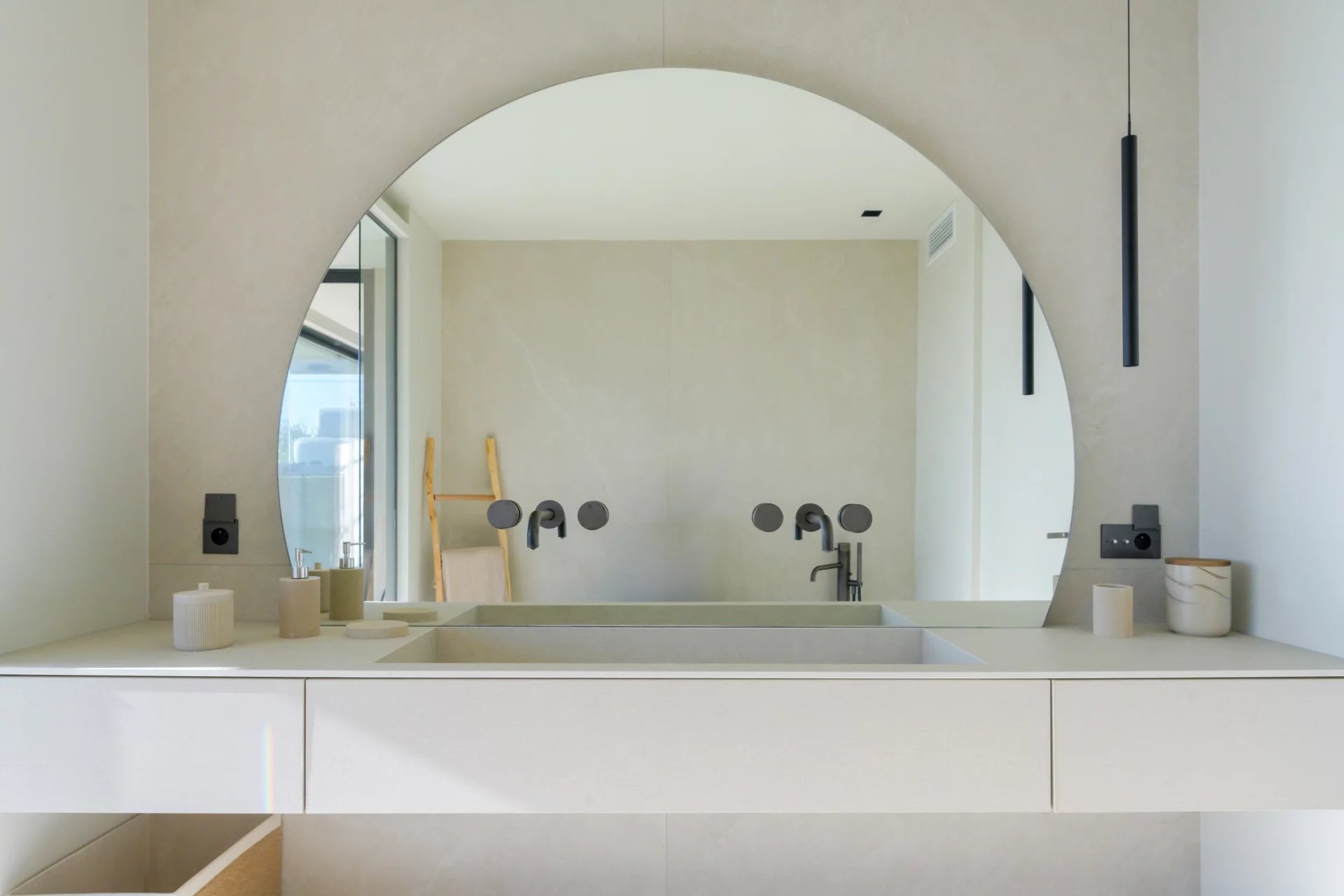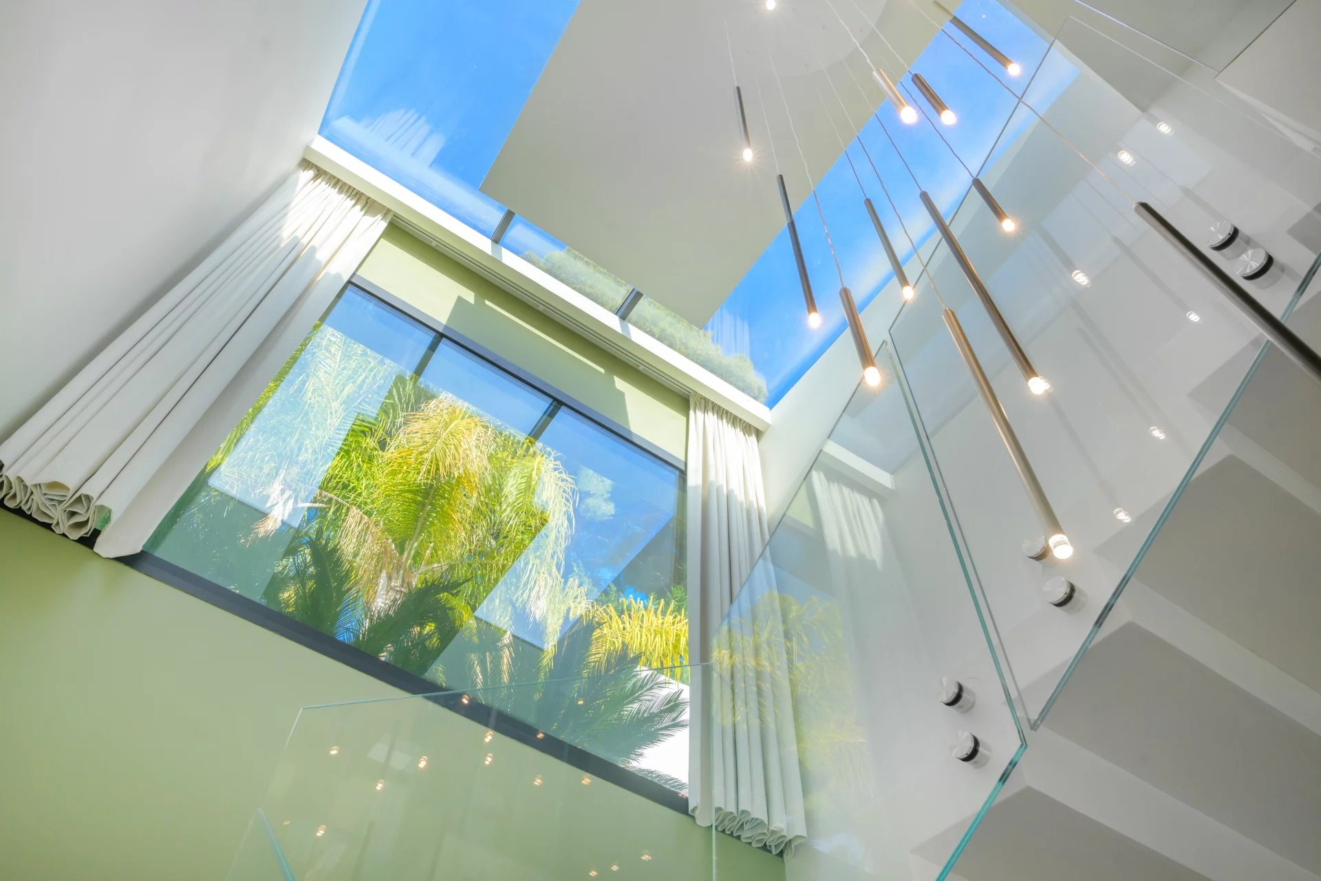Once inside this stunning family home you are welcomed by a majestic entrance hall featuring a glass elevator shaft. This level includes a private office with a porthole overlooking the pool, a fully equipped gym with a dedicated spa area featuring a jacuzzi, sauna, and shower, a state-of-the-art home cinema with a retractable screen and large TV, a games room, and a spacious 50 m2 garage.