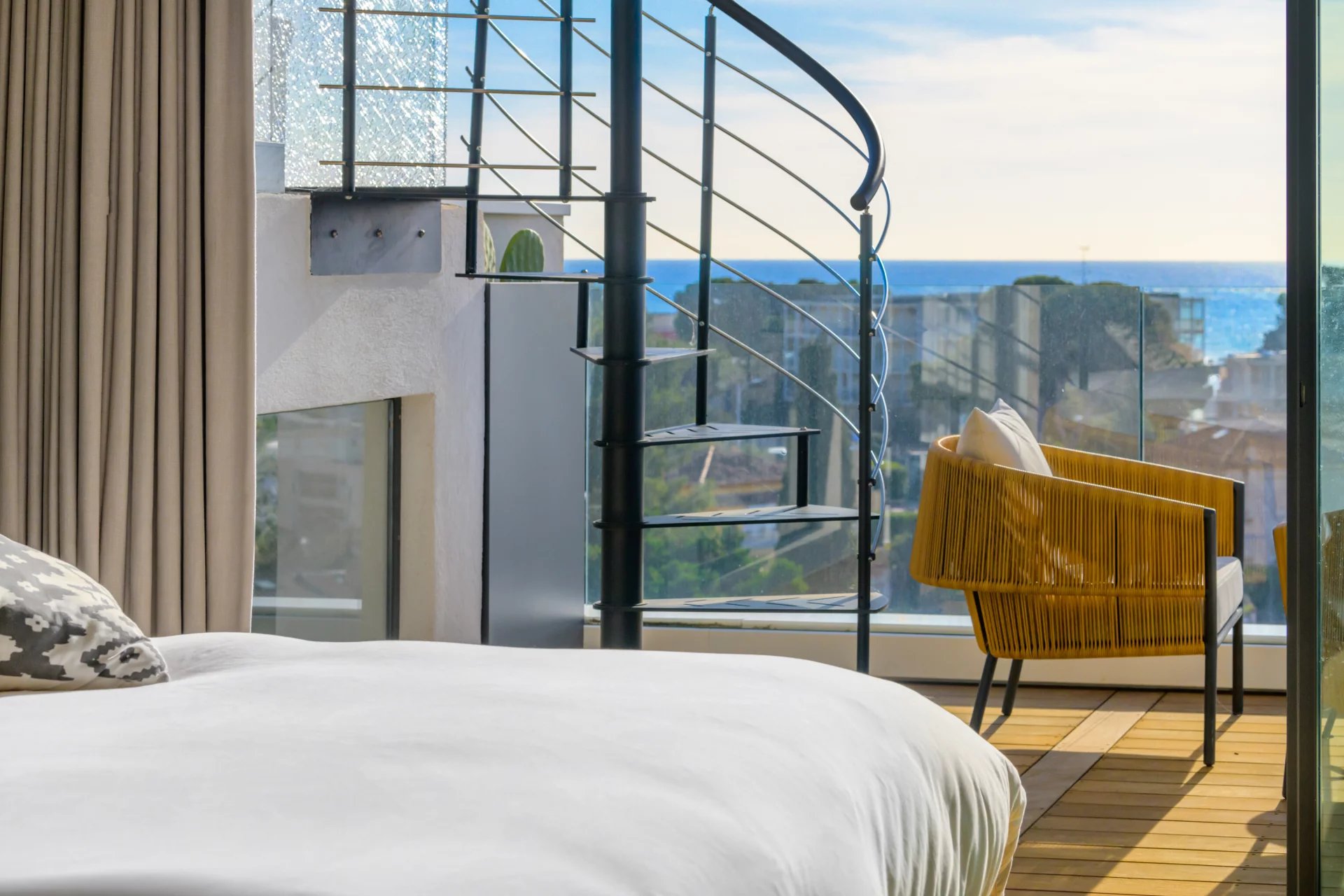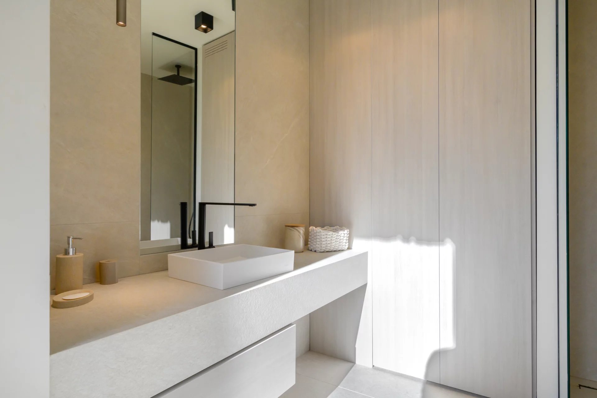 The first floor offers a seamless blend of open and distinct living spaces. It features a grand living room opening onto a terrace with a heated infinity pool, a dining room, a summer lounge, and a semi-open fully equipped kitchen that extends onto another terrace ideal for entertaining. This level also includes a laundry room and a guest suite with a private bathroom and toilet.