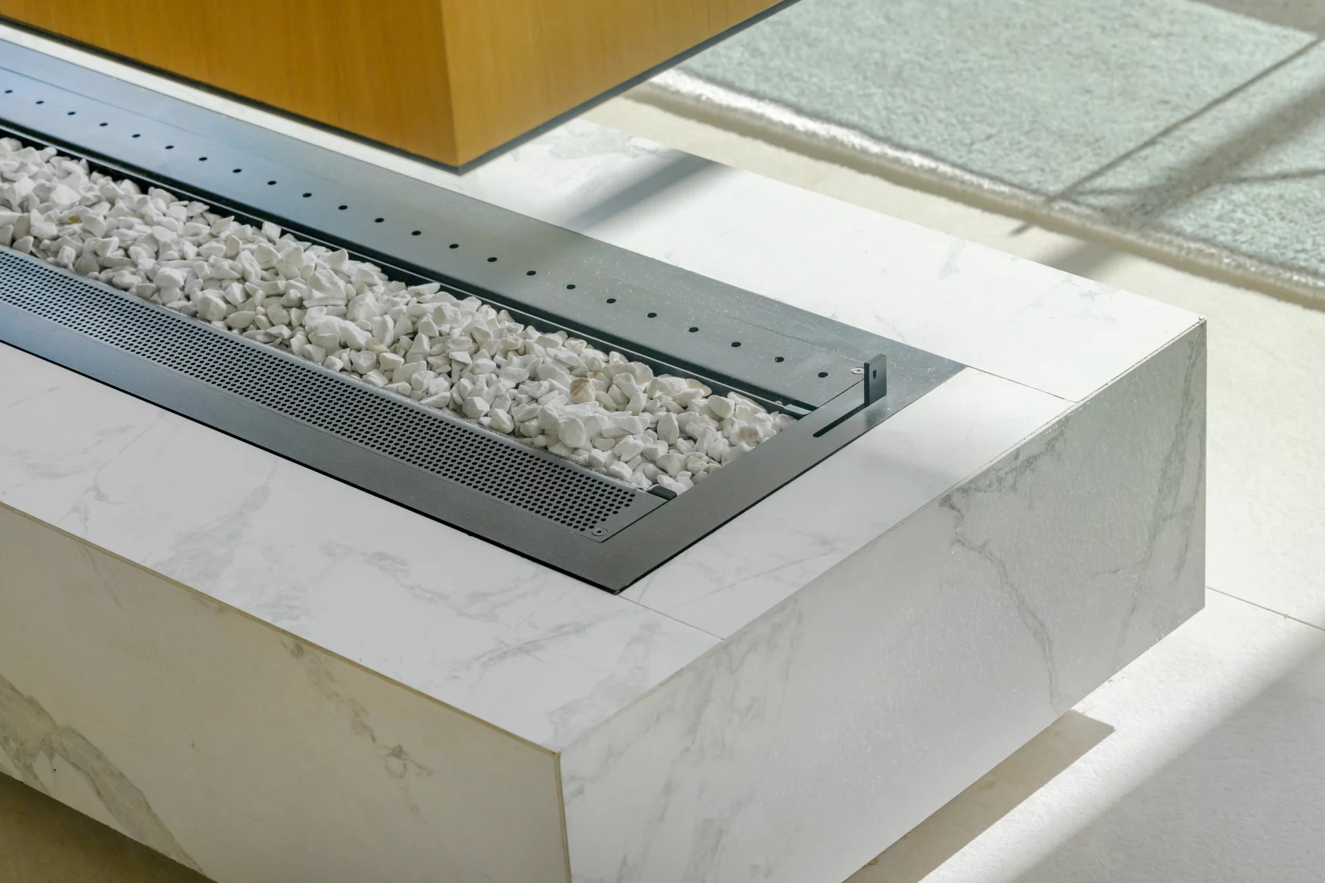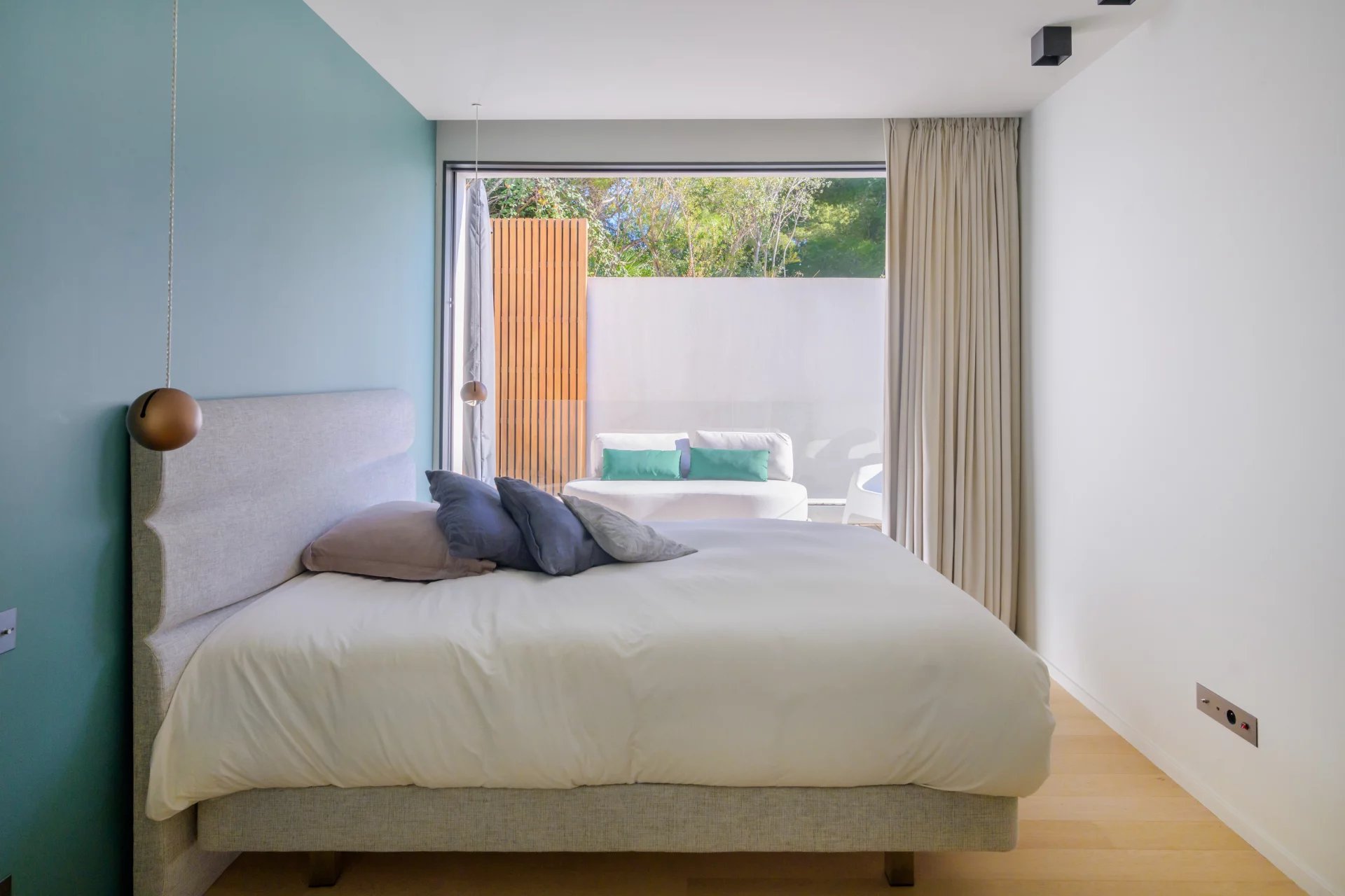Floor-to-ceiling sliding glass doors that fully open the home to its outdoor spaces