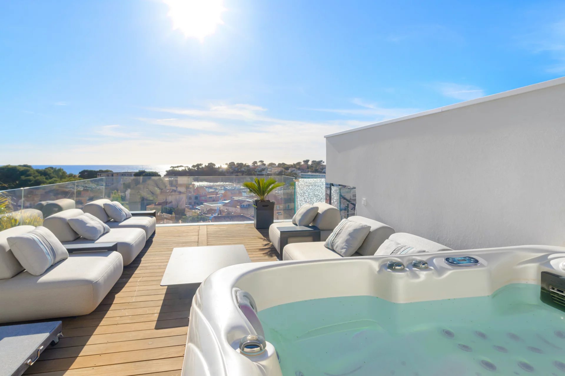 The second floor is dedicated to the luxurious master suite, which includes a bathroom with both bathtub and shower, a walk-in closet, a dressing area, a private terrace, and access to the rooftop. The rooftop features a relaxation space and a Jacuzzi with breathtaking sea views.