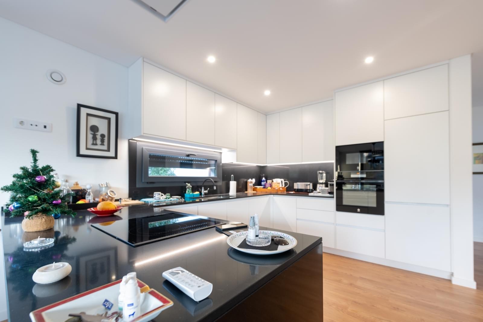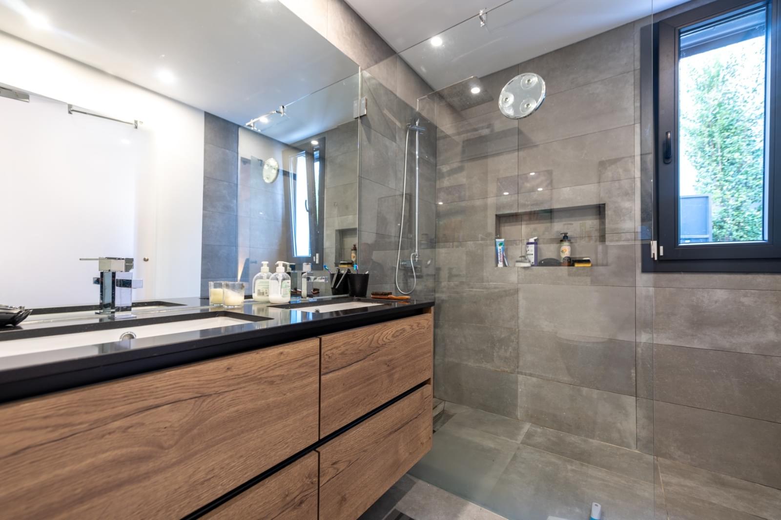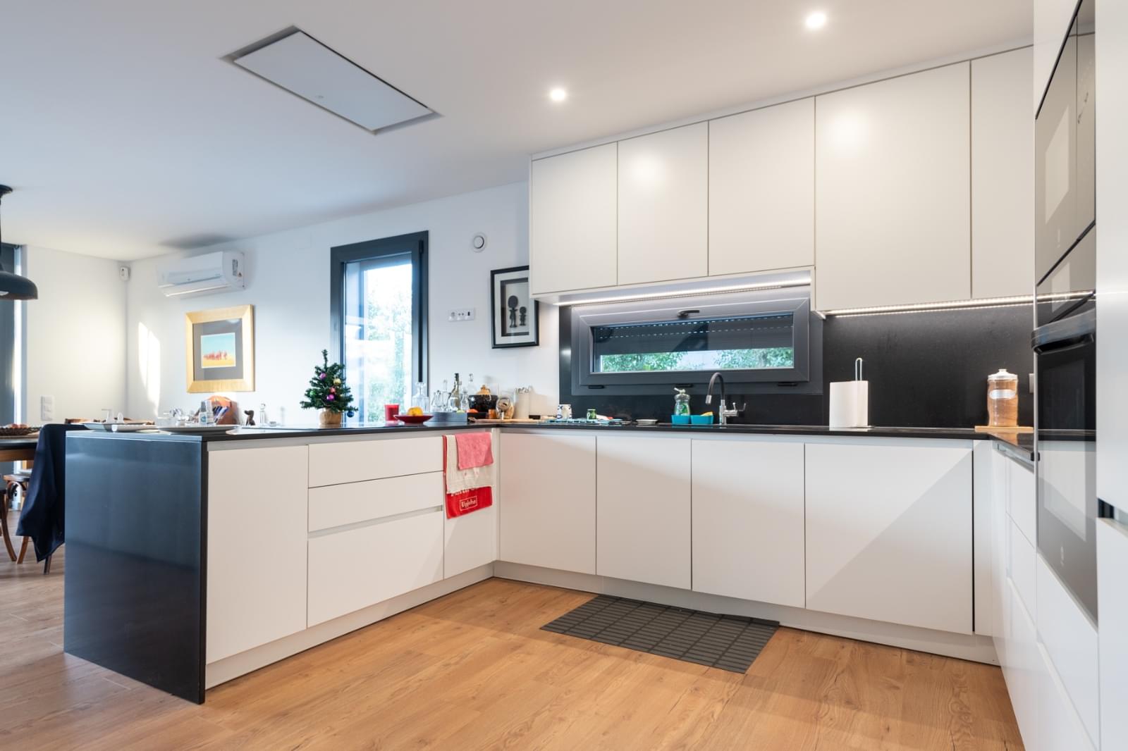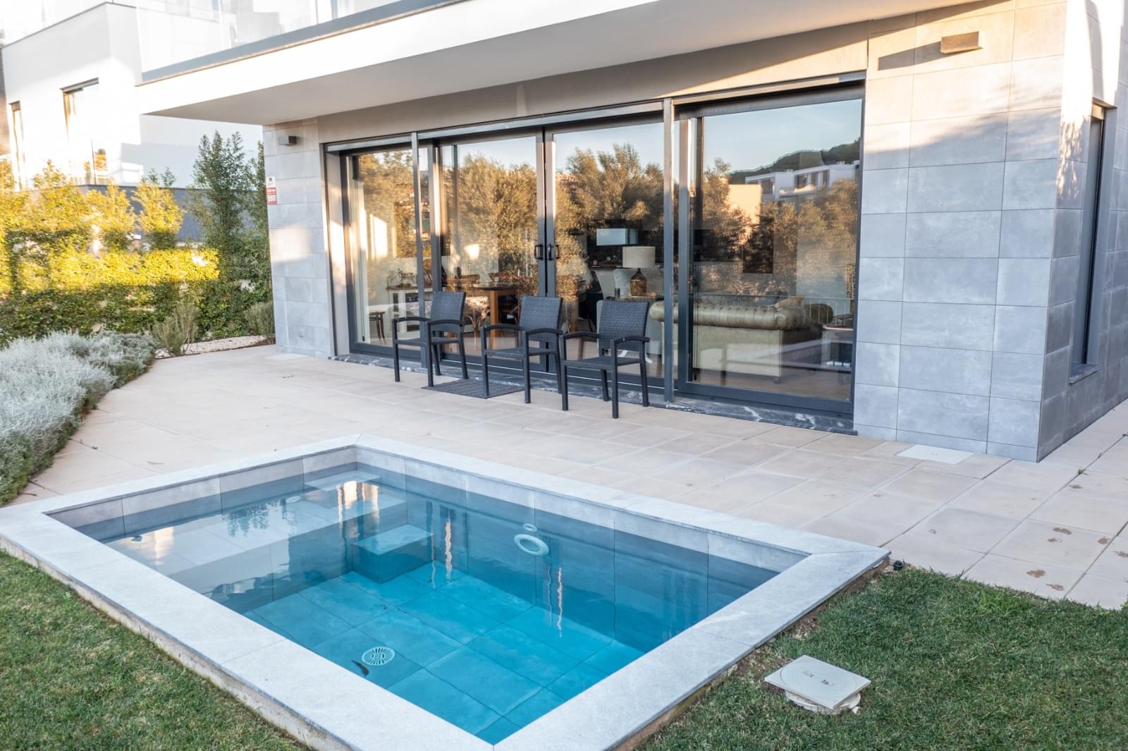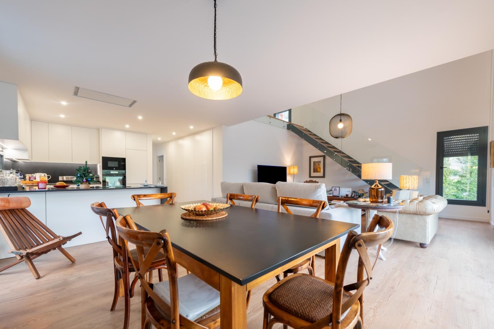 The lower floor comprises a spacious 41 sqm living room with direct access to a 36 sqm outdoor deck, perfect for entertaining and enjoying sunny days. The 12 sqm open-plan kitchen is fully equipped with built-in Balay appliances, including a fridge, oven, hob, extractor fan, washing machine, dishwasher, and microwave. A 3 sqm hallway connects to two additional suites, measuring 10 sqm and 18 sqm, both with direct access to the garden.