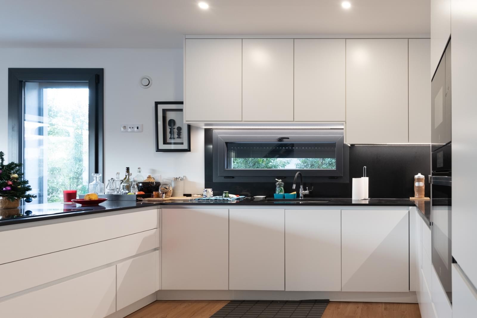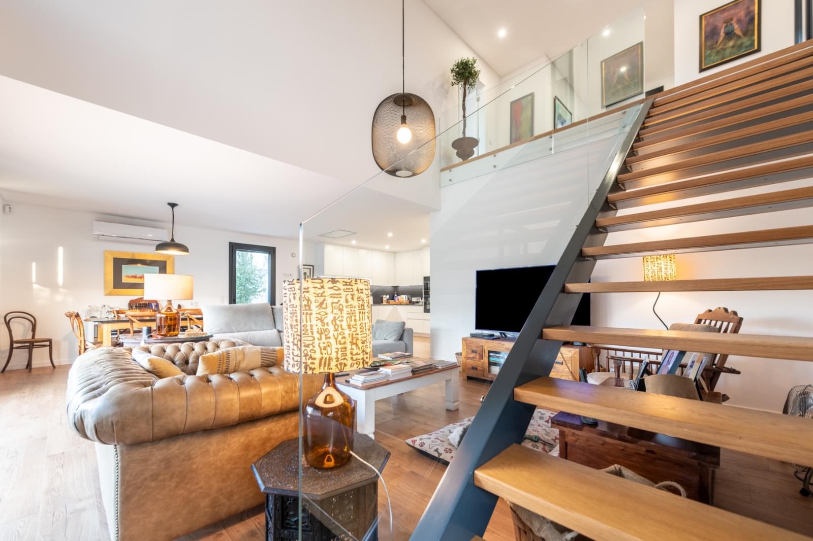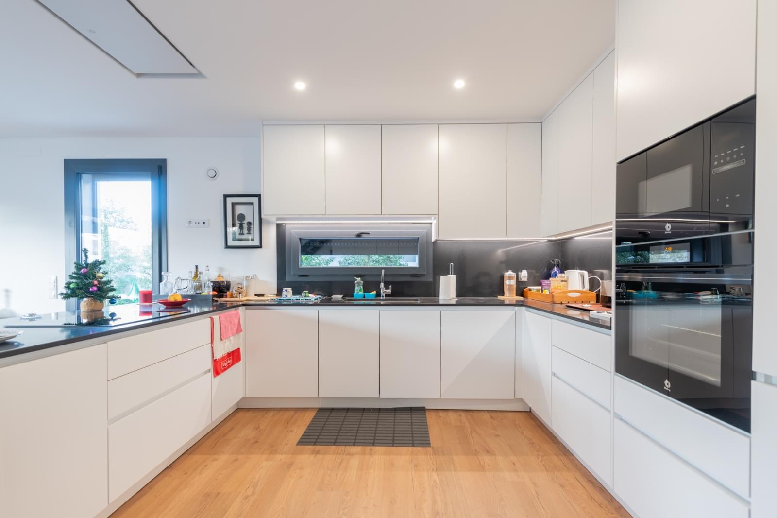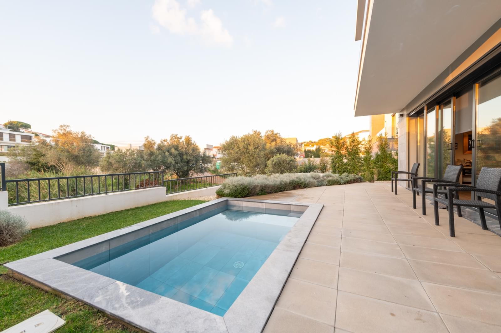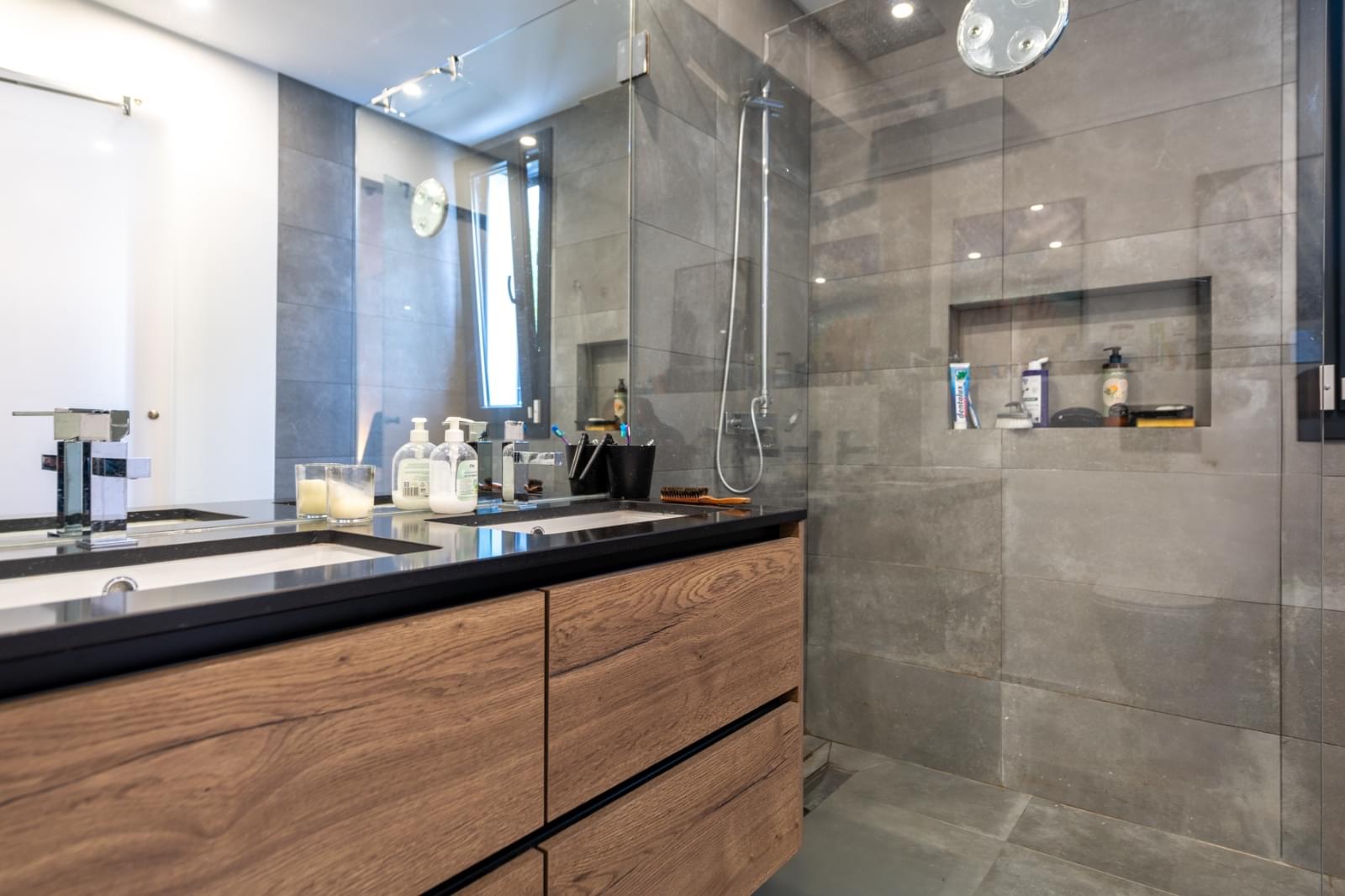 The lower floor comprises a spacious 41 sqm living room with direct access to a 36 sqm outdoor deck, perfect for entertaining and enjoying sunny days. The 12 sqm open-plan kitchen is fully equipped with built-in Balay appliances, including a fridge, oven, hob, extractor fan, washing machine, dishwasher, and microwave. A 3 sqm hallway connects to two additional suites, measuring 10 sqm and 18 sqm, both with direct access to the garden.