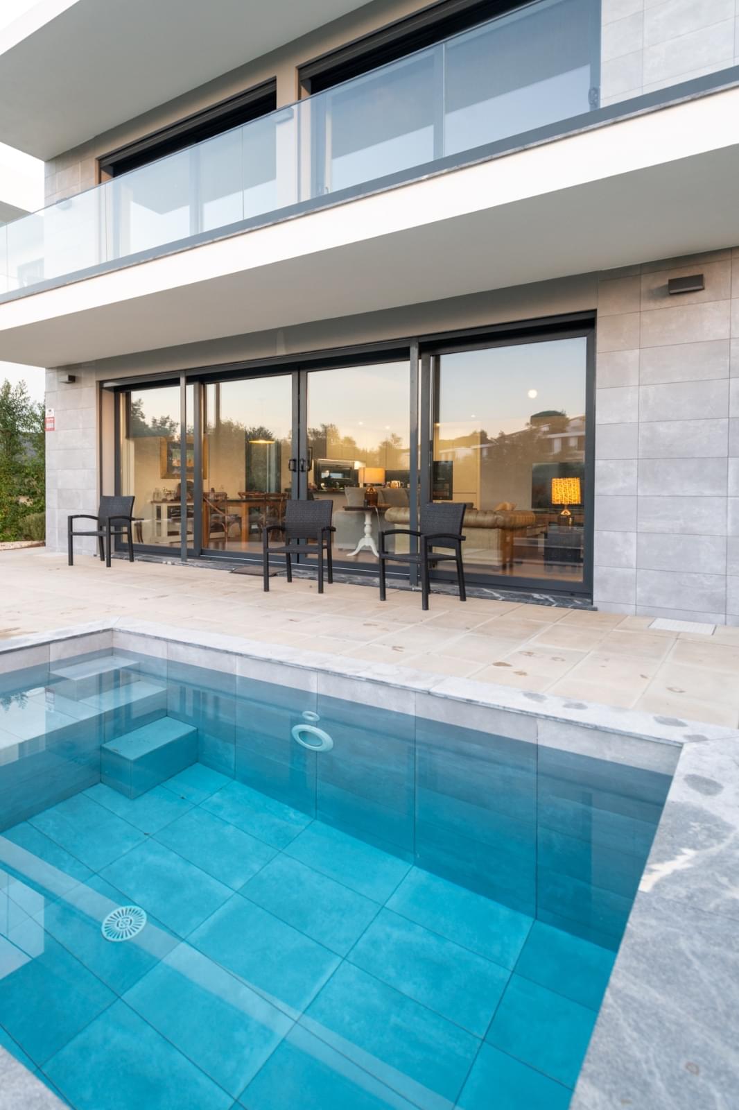 On the upper floor, you will find an 8 sqm entrance hall, a 4 sqm guest bathroom, and a 17 sqm master suite featuring a 9 sqm walk-in closet, a 6 sqm bathroom with walk-in shower, and a 16 sqm private balcony with open views.