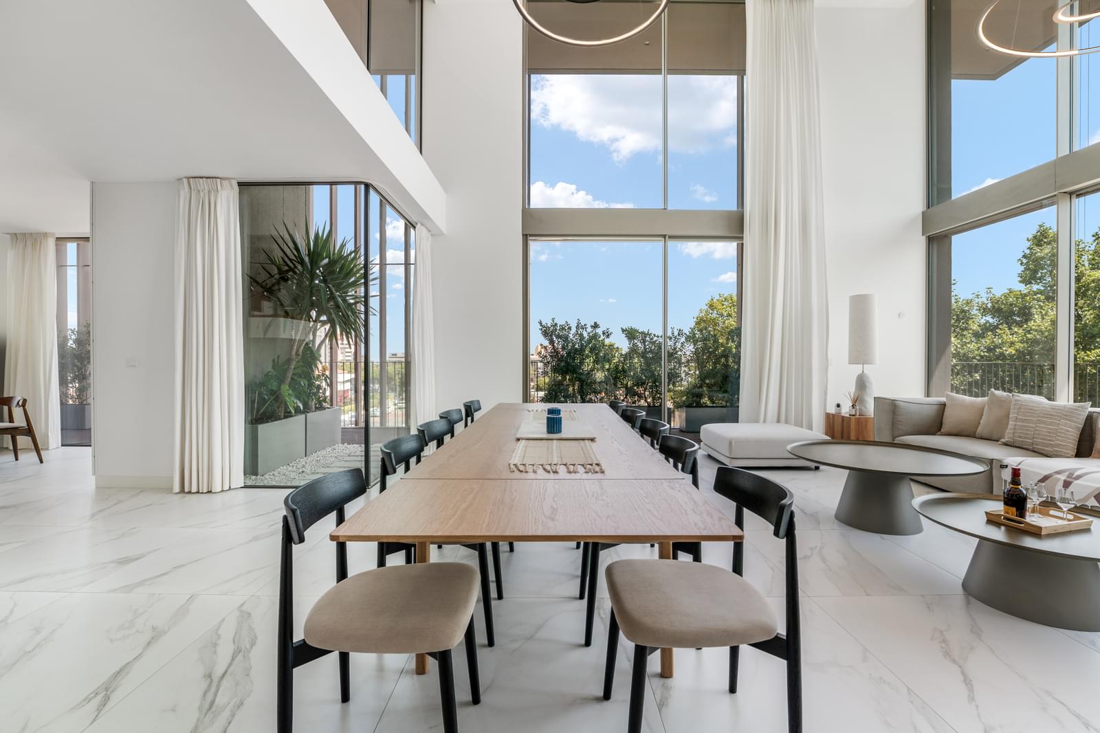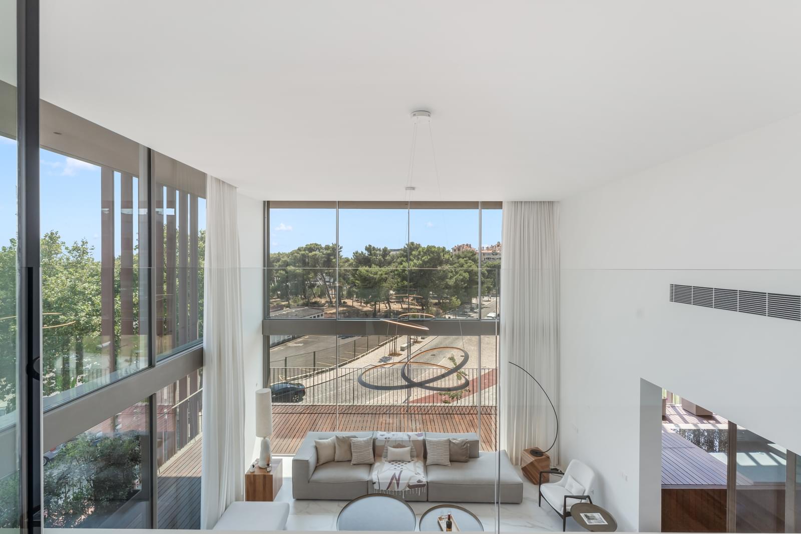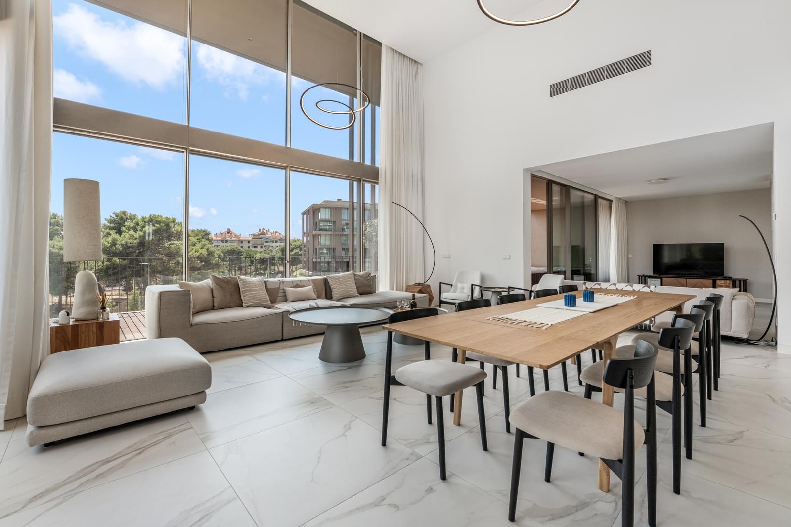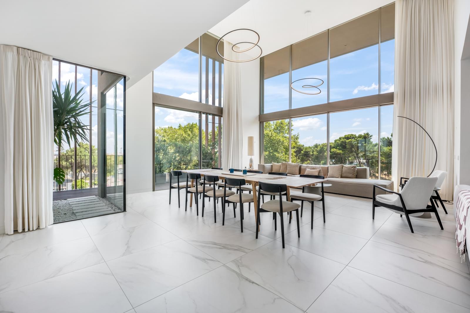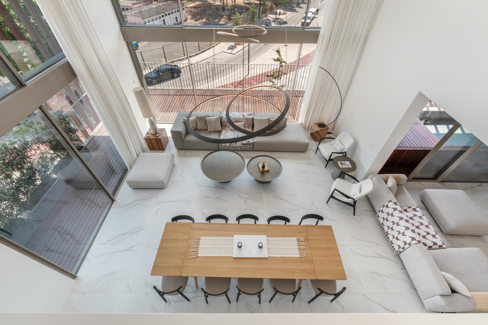 With double-height ceilings in the living room and large window openings, the layout is as follows: