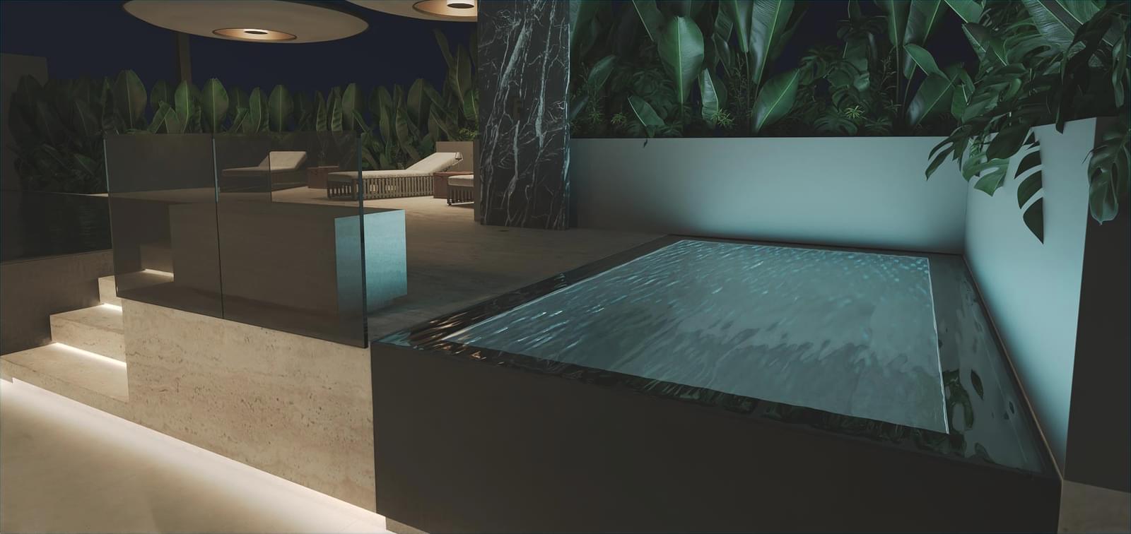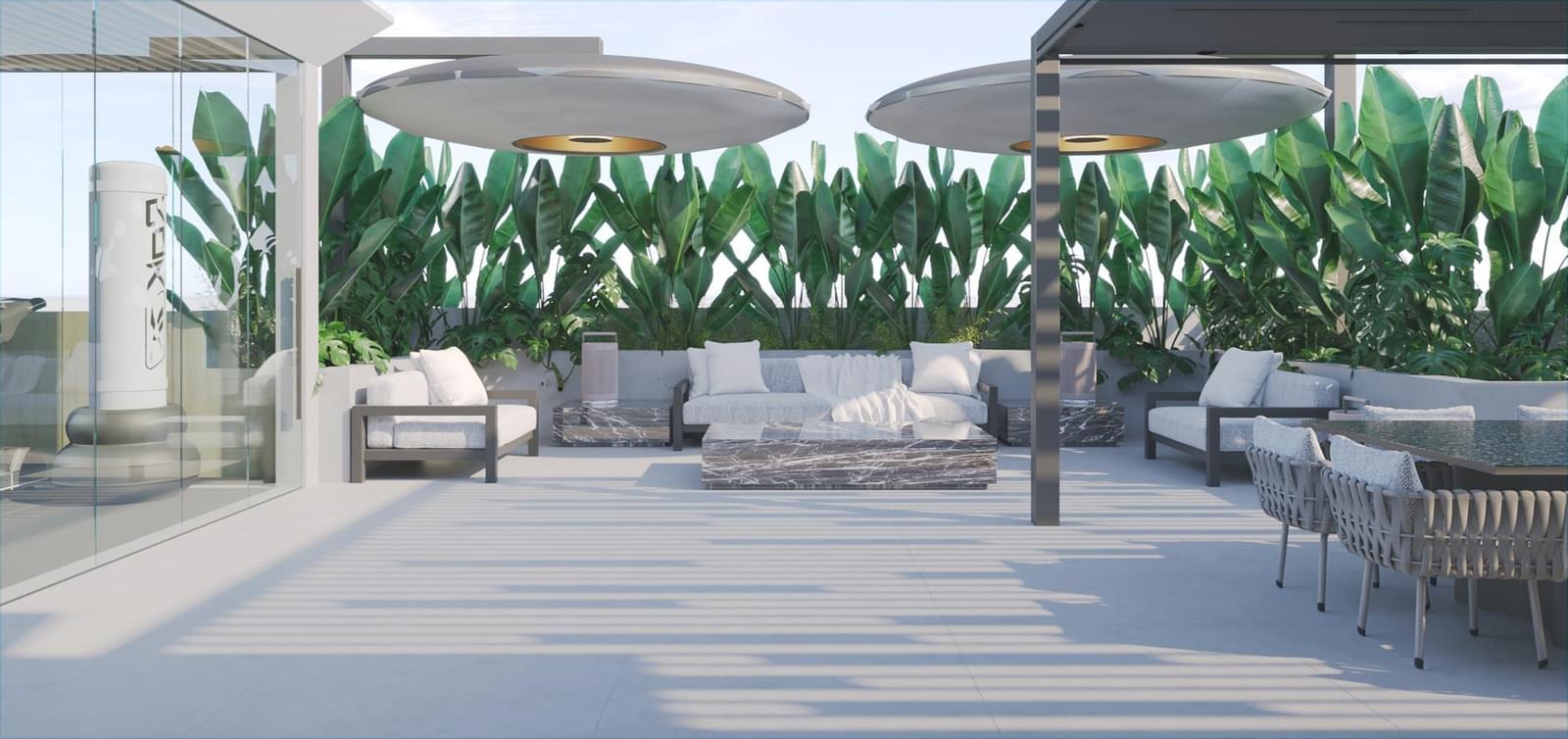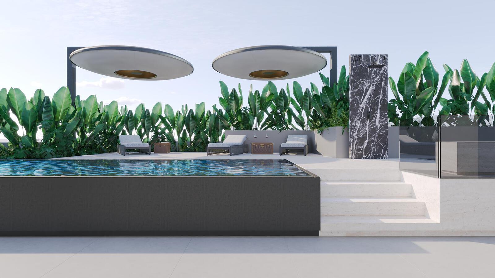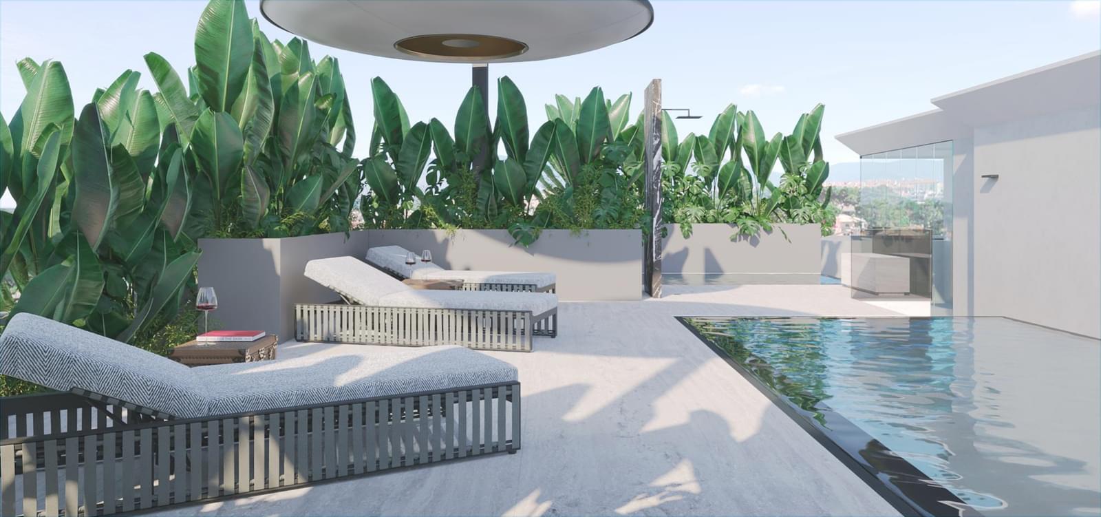 . Private rooftop featuring a heated pool clad in Estremoz marble, jacuzzi, dining area, barbecue, sauna, and full gym – a true seaside urban retreat.