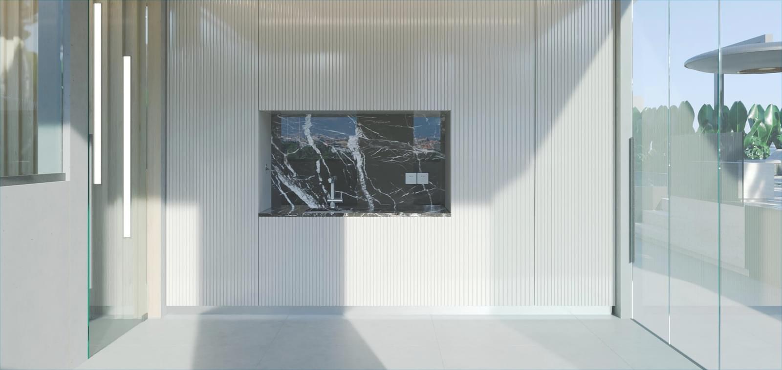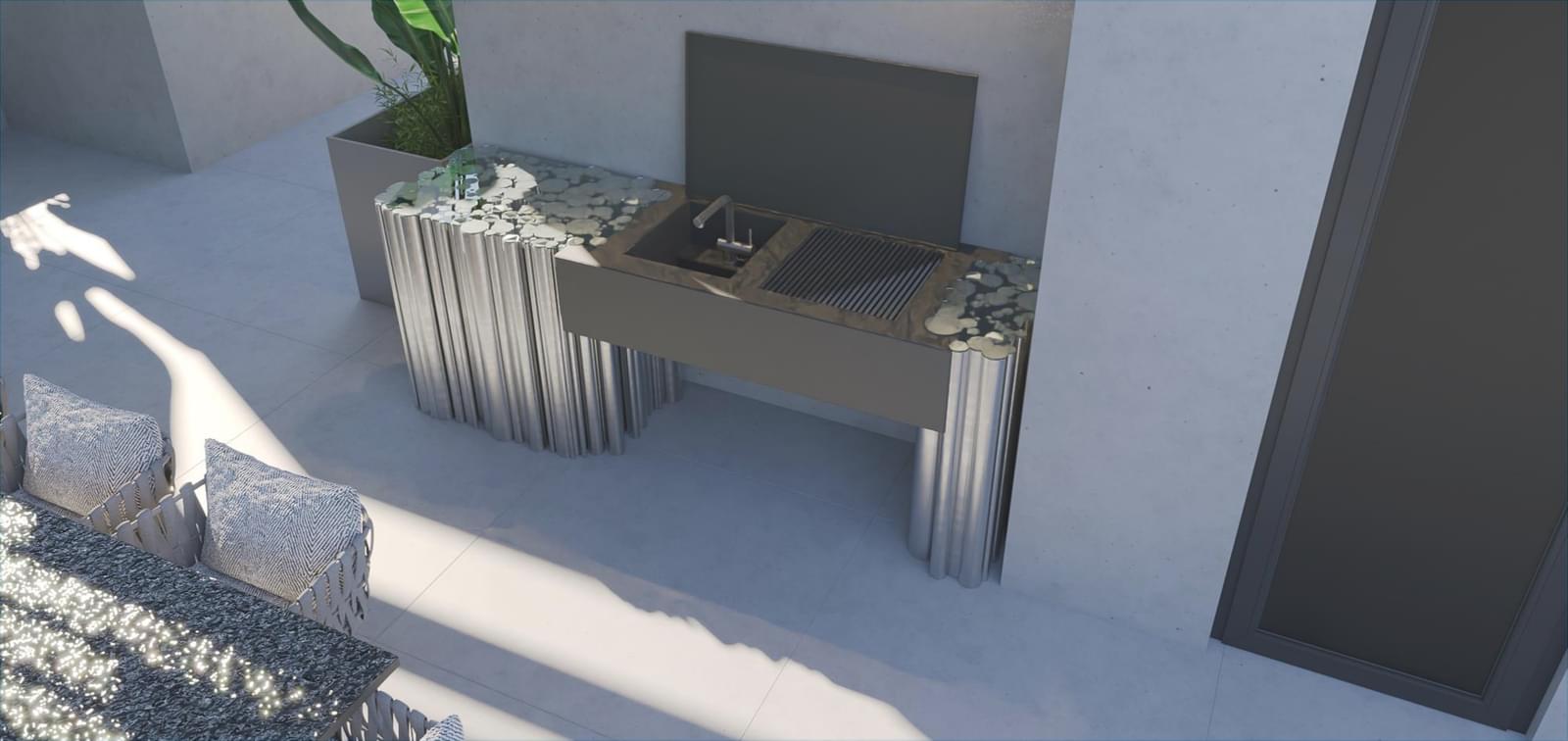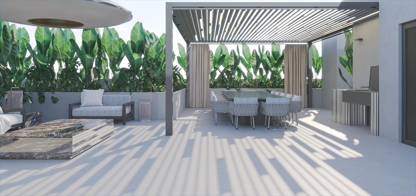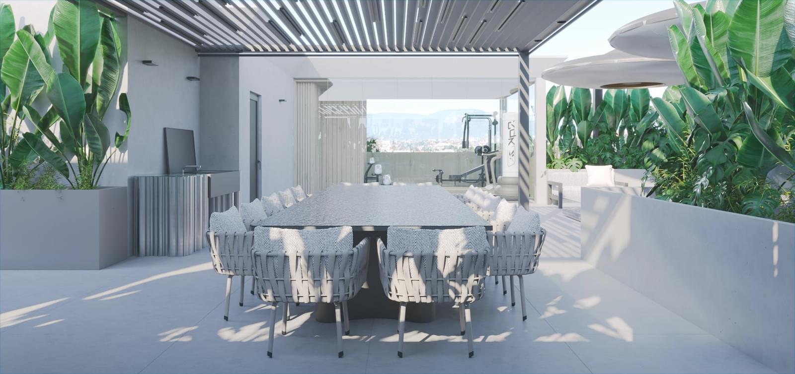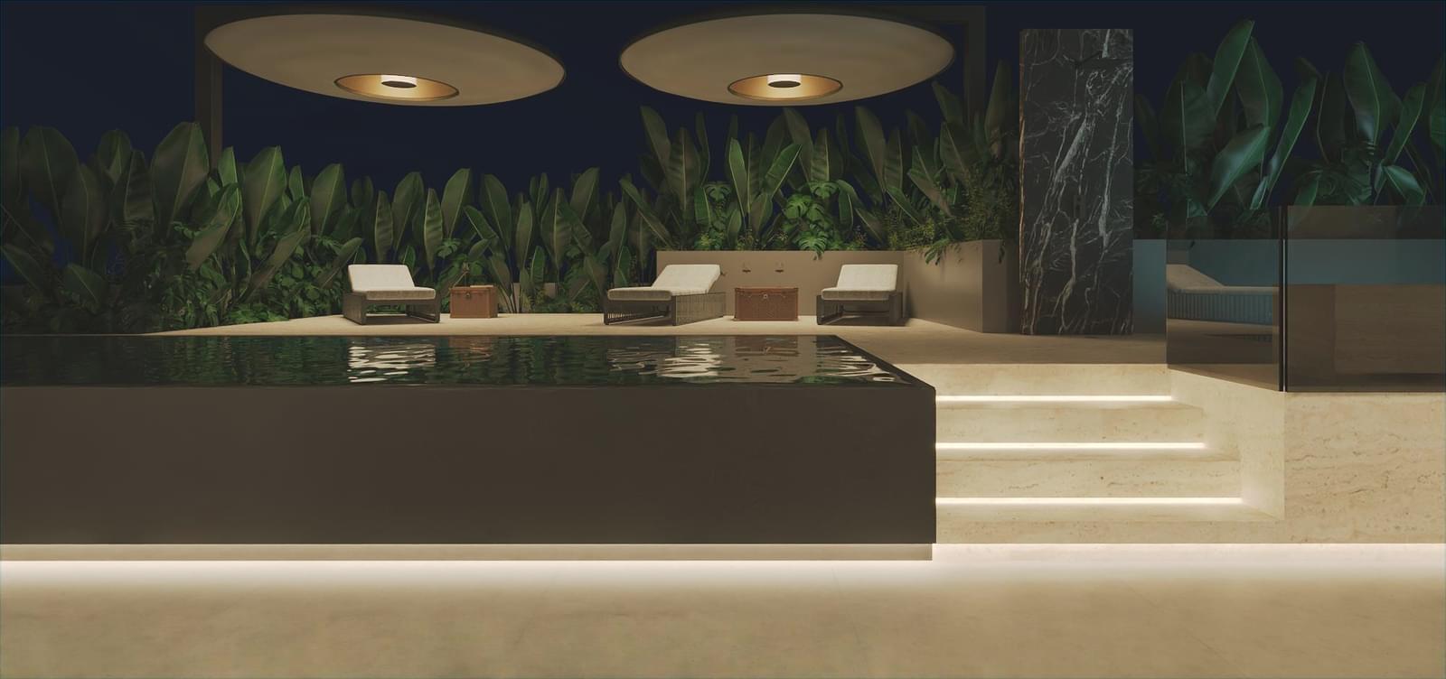 . Private rooftop featuring a heated pool clad in Estremoz marble, jacuzzi, dining area, barbecue, sauna, and full gym – a true seaside urban retreat.
