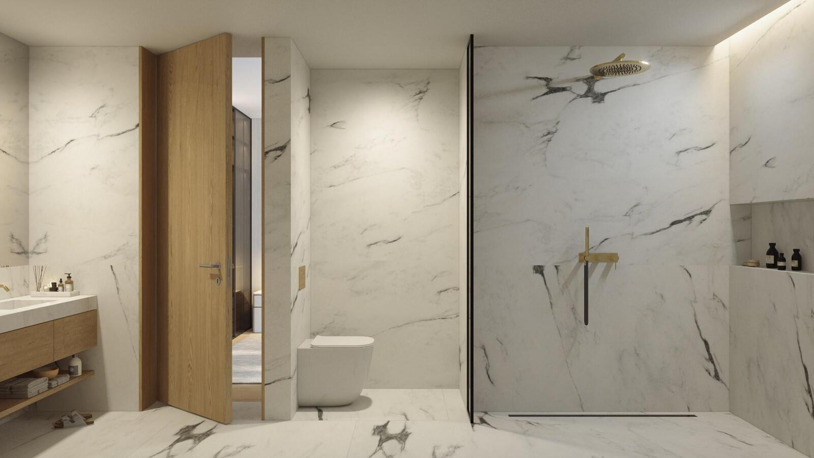 Bathrooms with Estremoz marble and Onyx Guatemala finishes, Hansgrohe sanitary ware, and Gessi fixtures