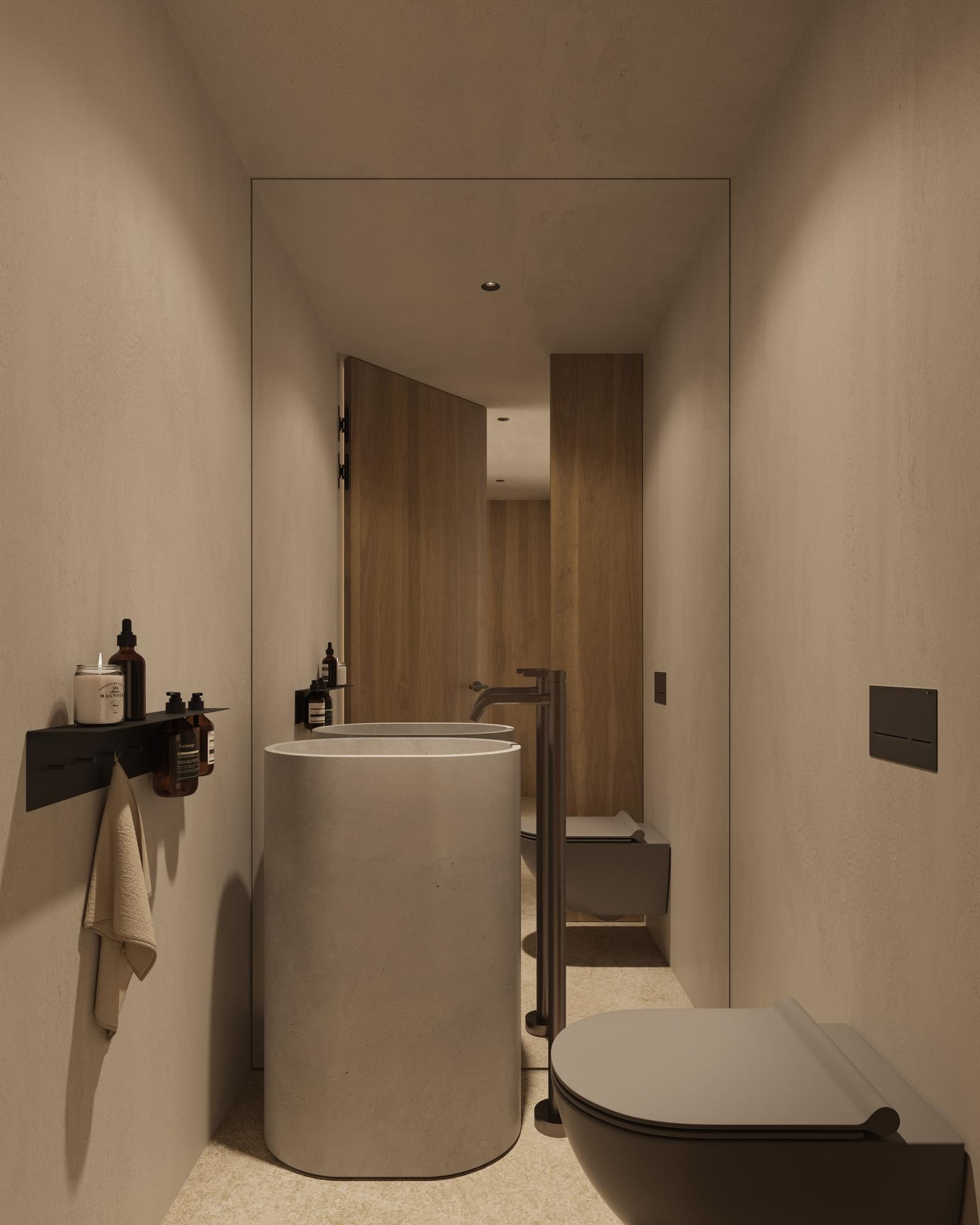 Ground Floor: Spacious living room, kitchen, and guest bathroom.
