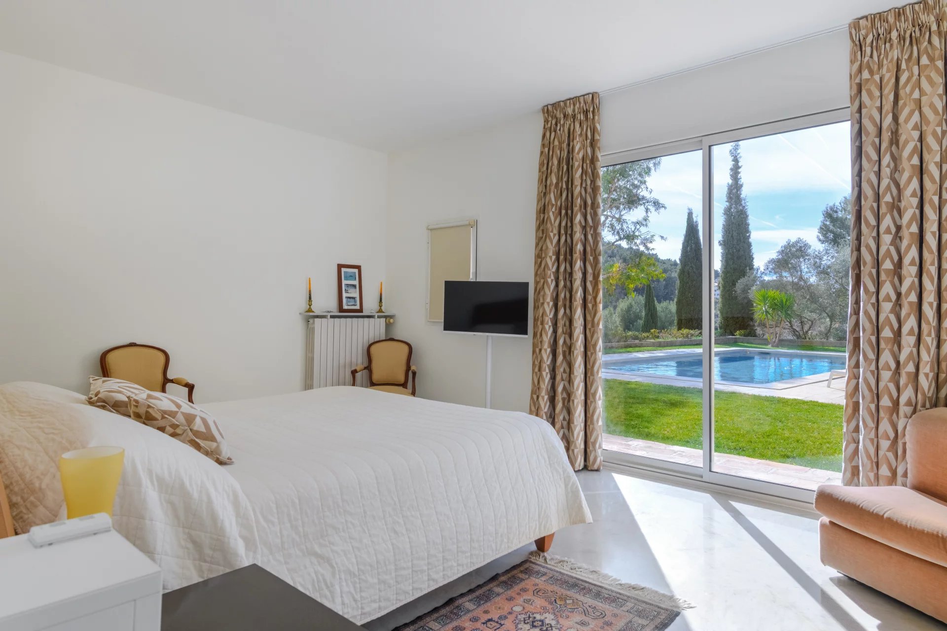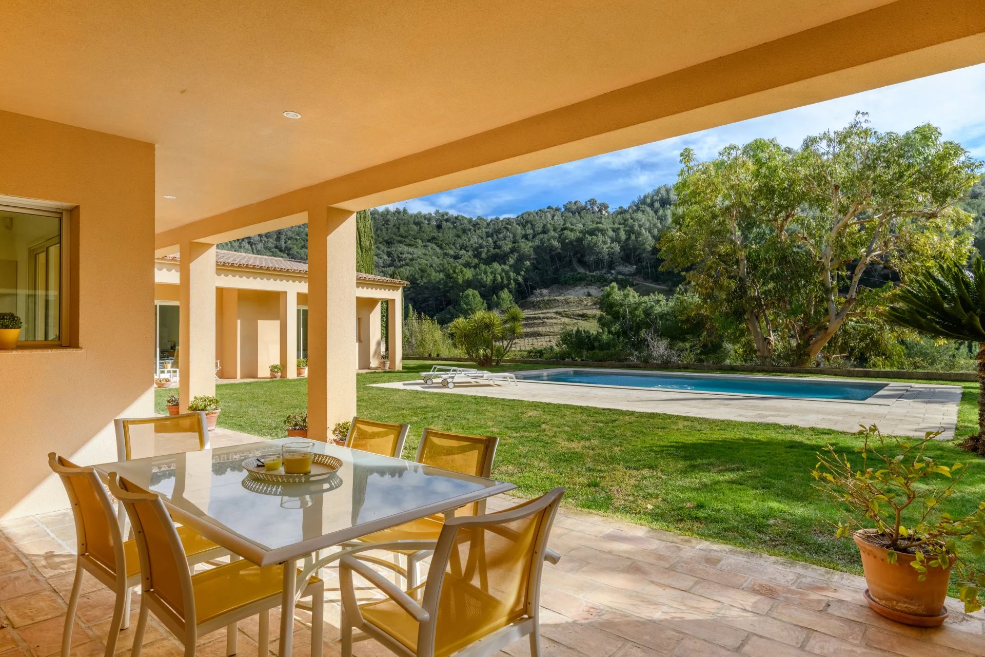 The meticulously landscaped gardens feature Mediterranean plants, multiple terraces, a summer kitchen, a covered terrace with barbecue, and a 5 × 10 m masonry pool seamlessly integrated into the surroundings. A petanque court completes the outdoor space.
