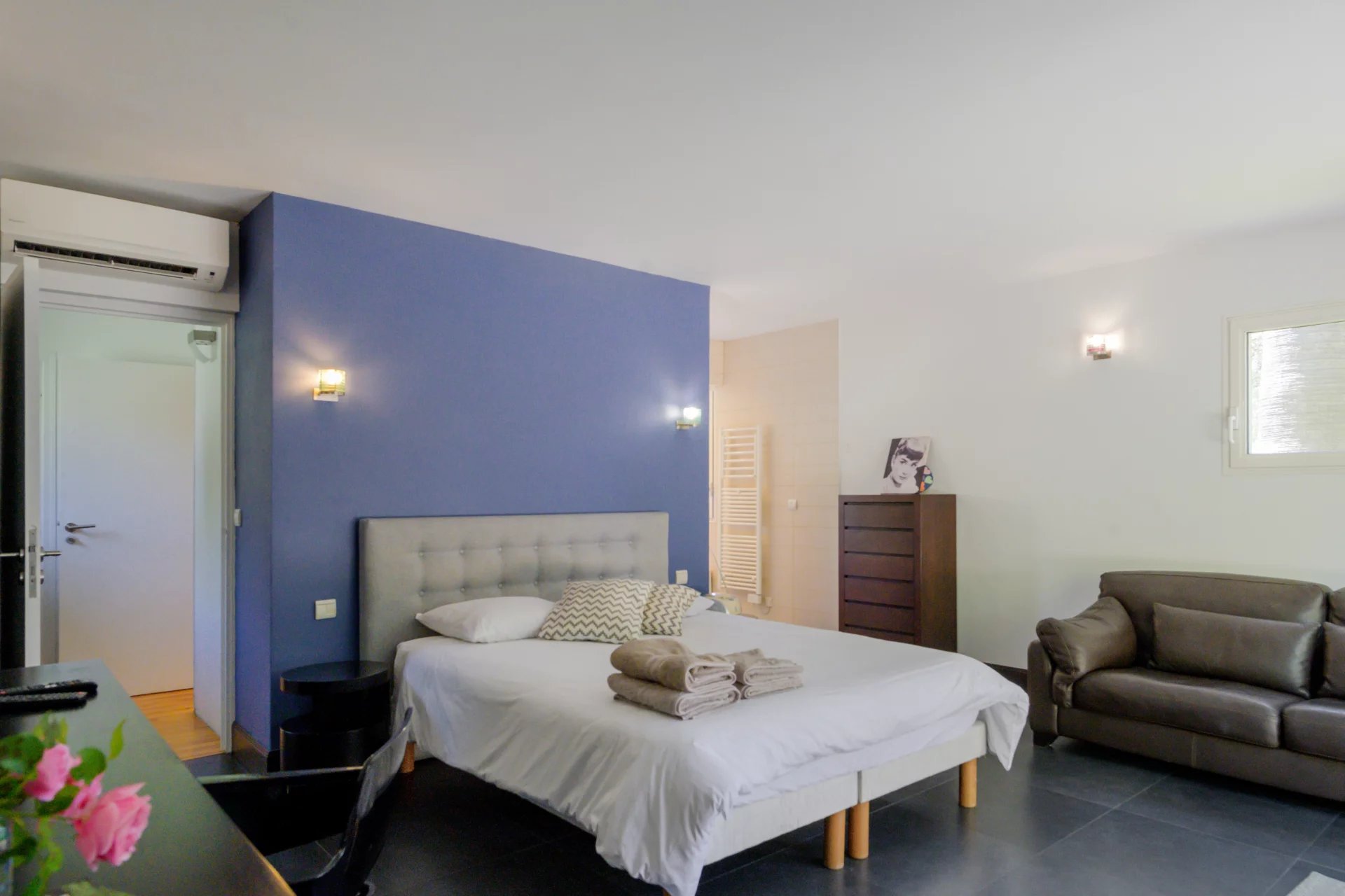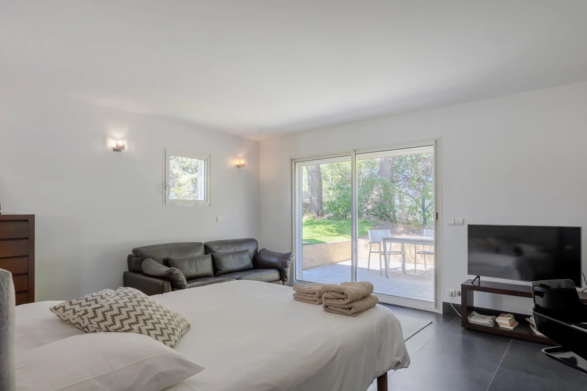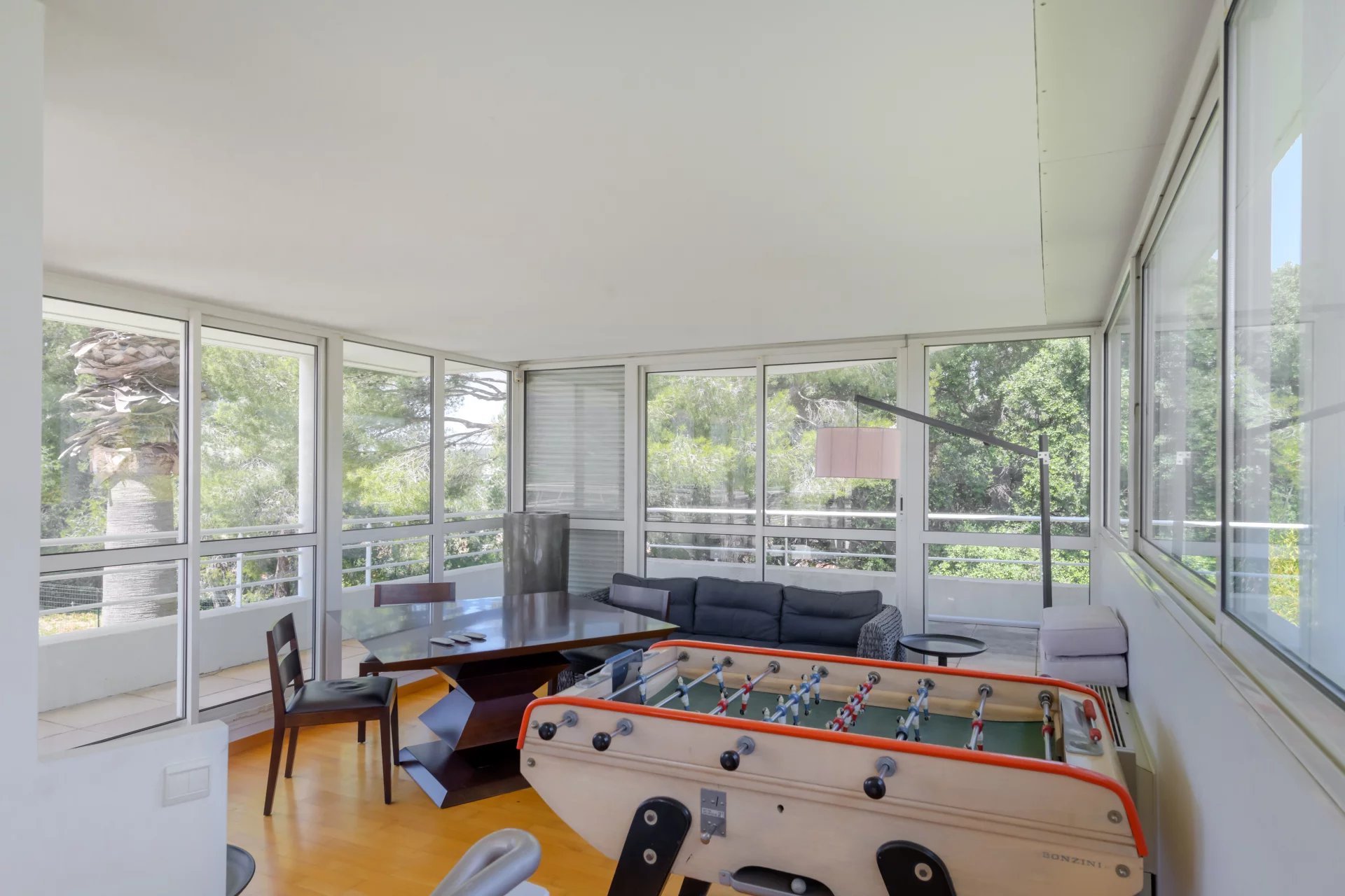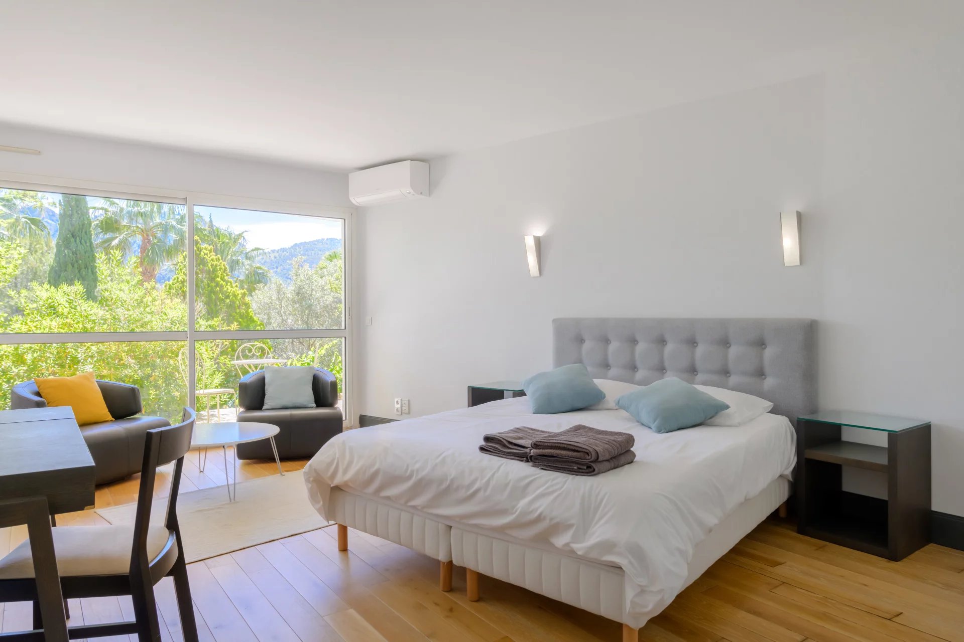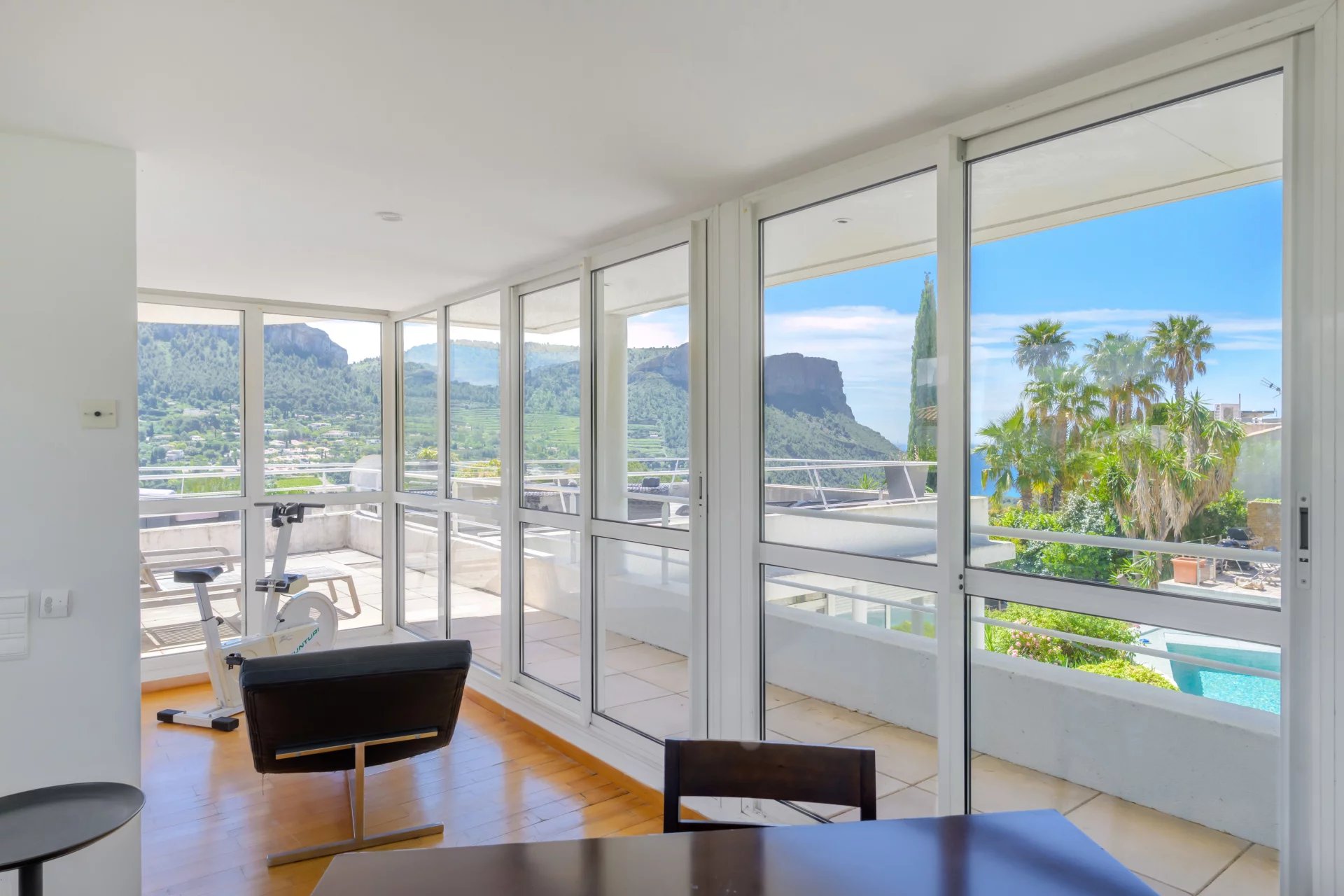 Crowning the property is a spectacular top-floor room framed by floor-to-ceiling windows, leading to a private solarium with uninterrupted 360-degree views of Cassis, the sea, and the surrounding natural landmarks—a true sanctuary in the sky.