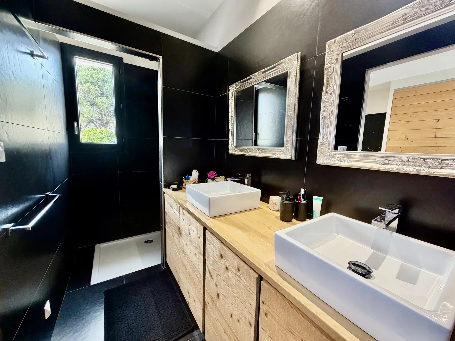 Upstairs, the sleeping area features two beautiful en-suite bedrooms, each with a shower room and walk-in wardrobe, offering access to a pleasant sunny terrace, ideal for enjoying the mild Mediterranean climate.