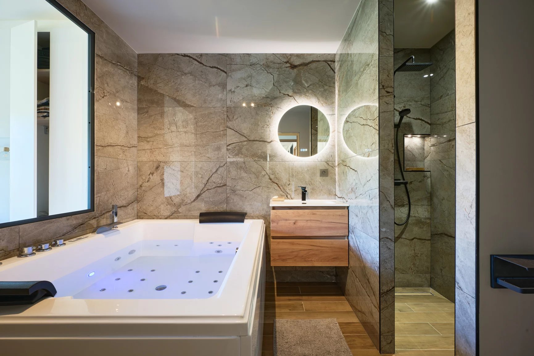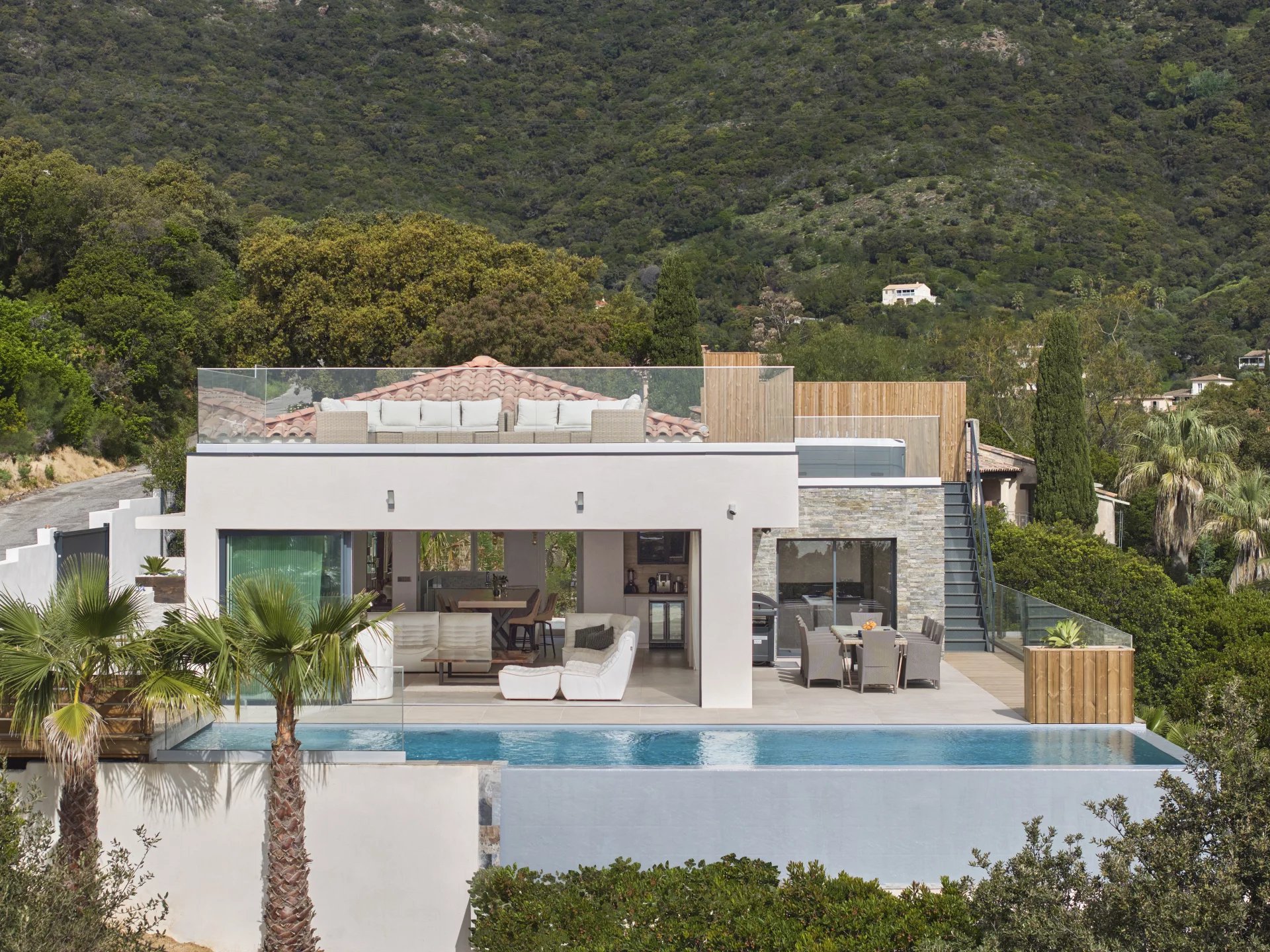A roof terrace with a private Jacuzzi dominates the surroundings, offering a magnificent panoramic view.