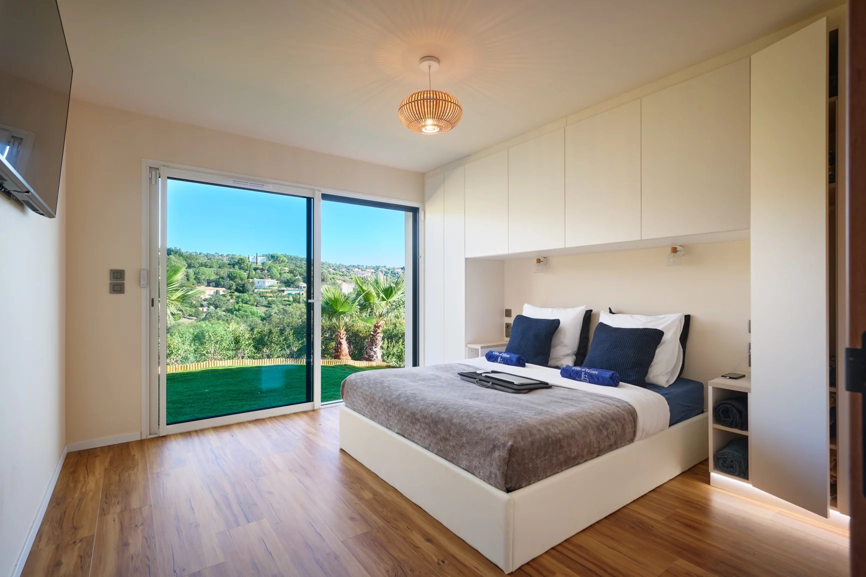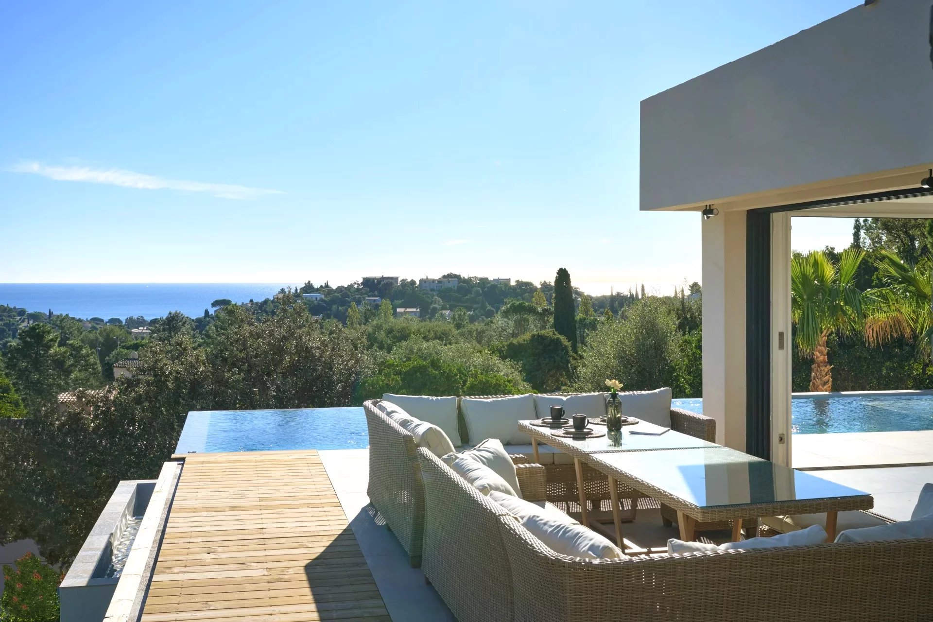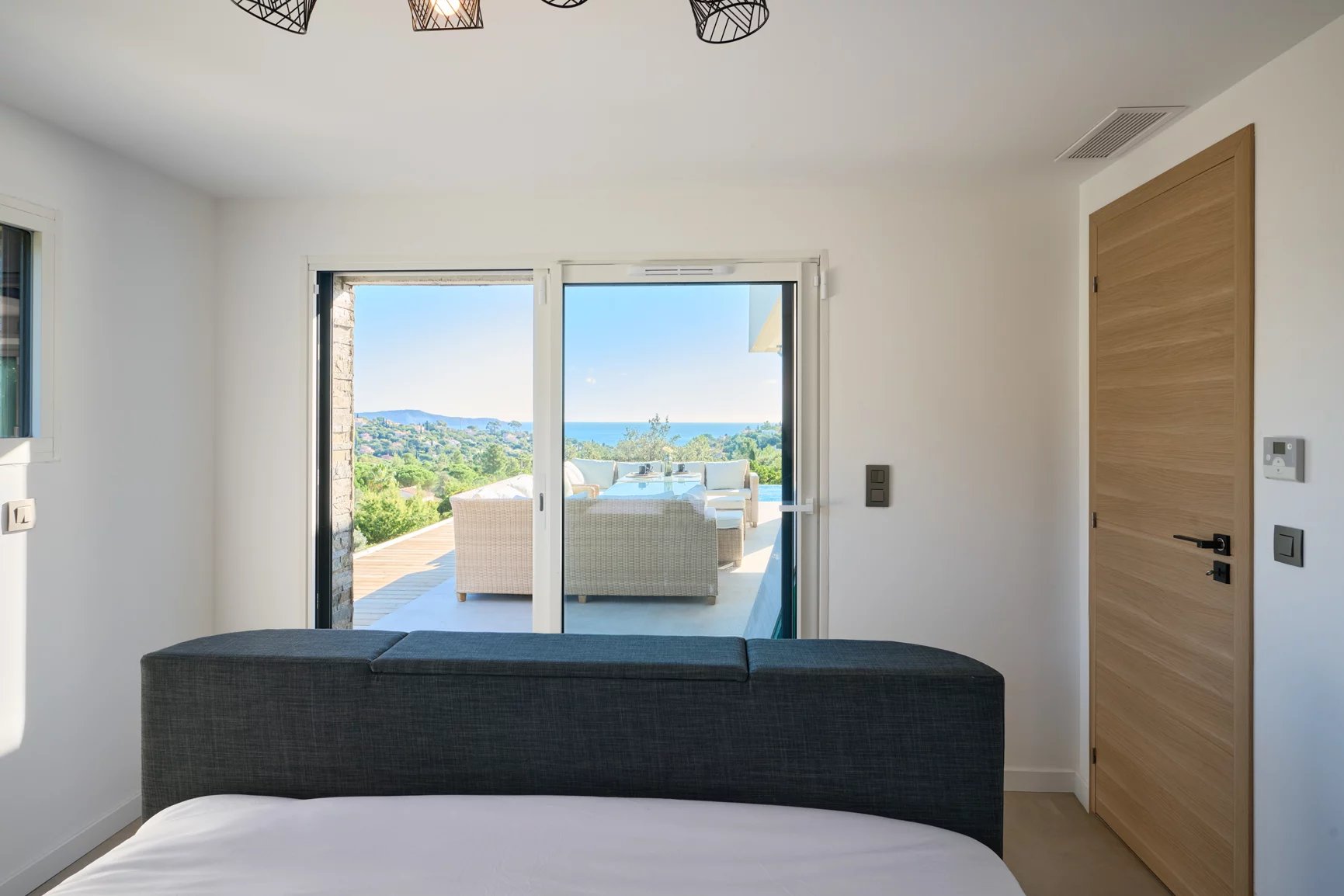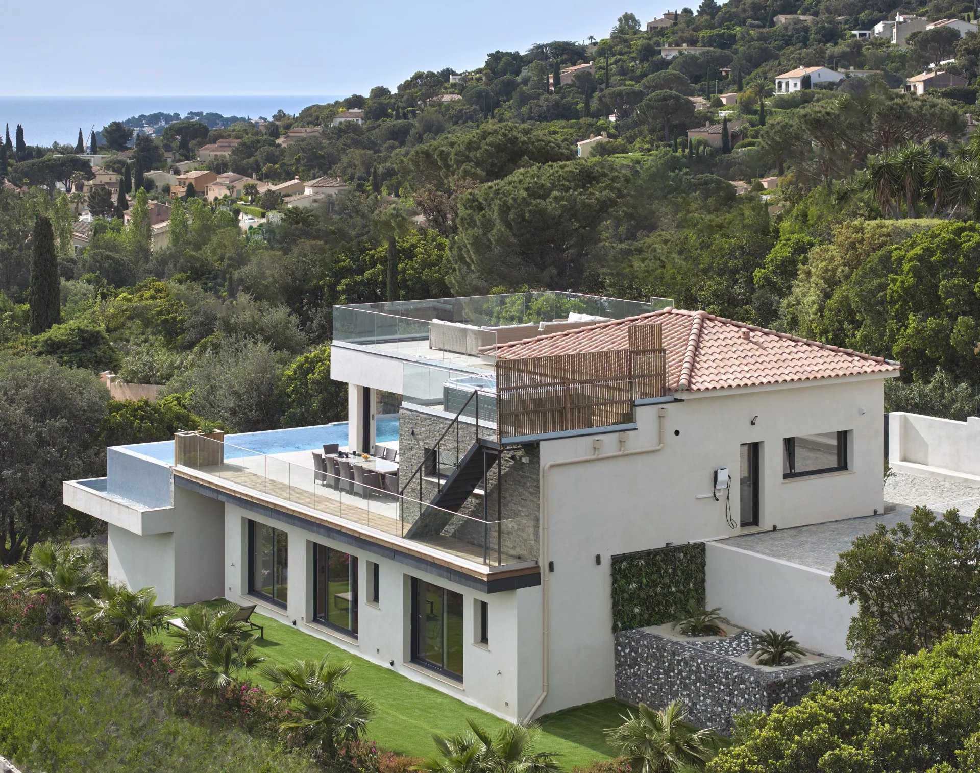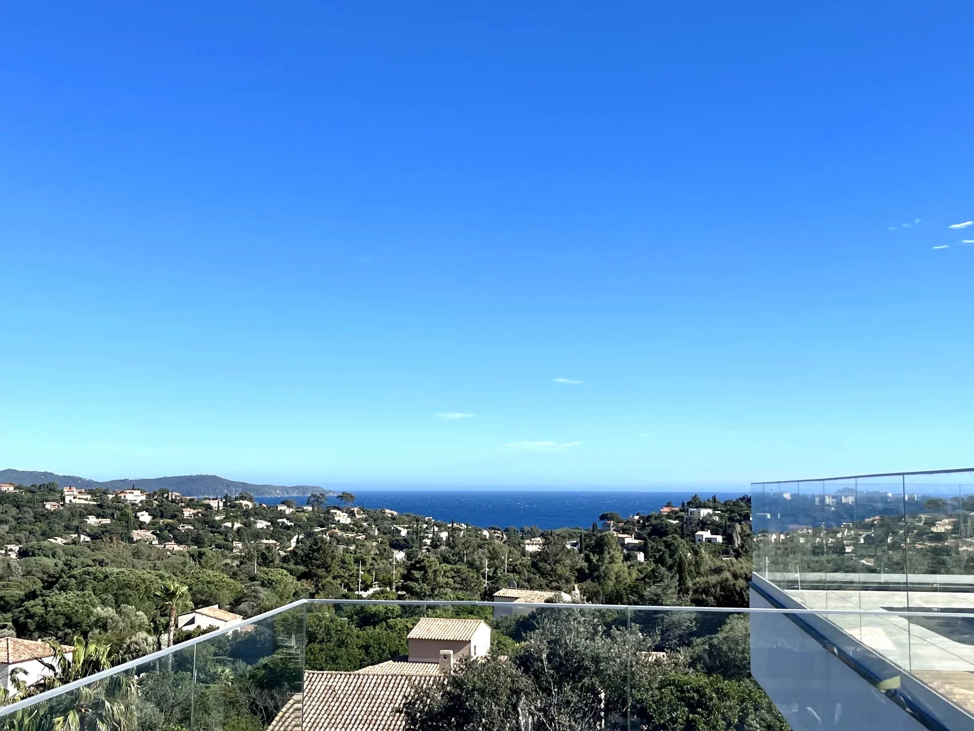 In a confidential, peaceful environment and close to a fine sandy beach, this villa built in 2023 enjoys an unobstructed view of the blue expanse of the sea, bordered by the green hills of the beautiful domains of Cavalaire-sur-Mer.