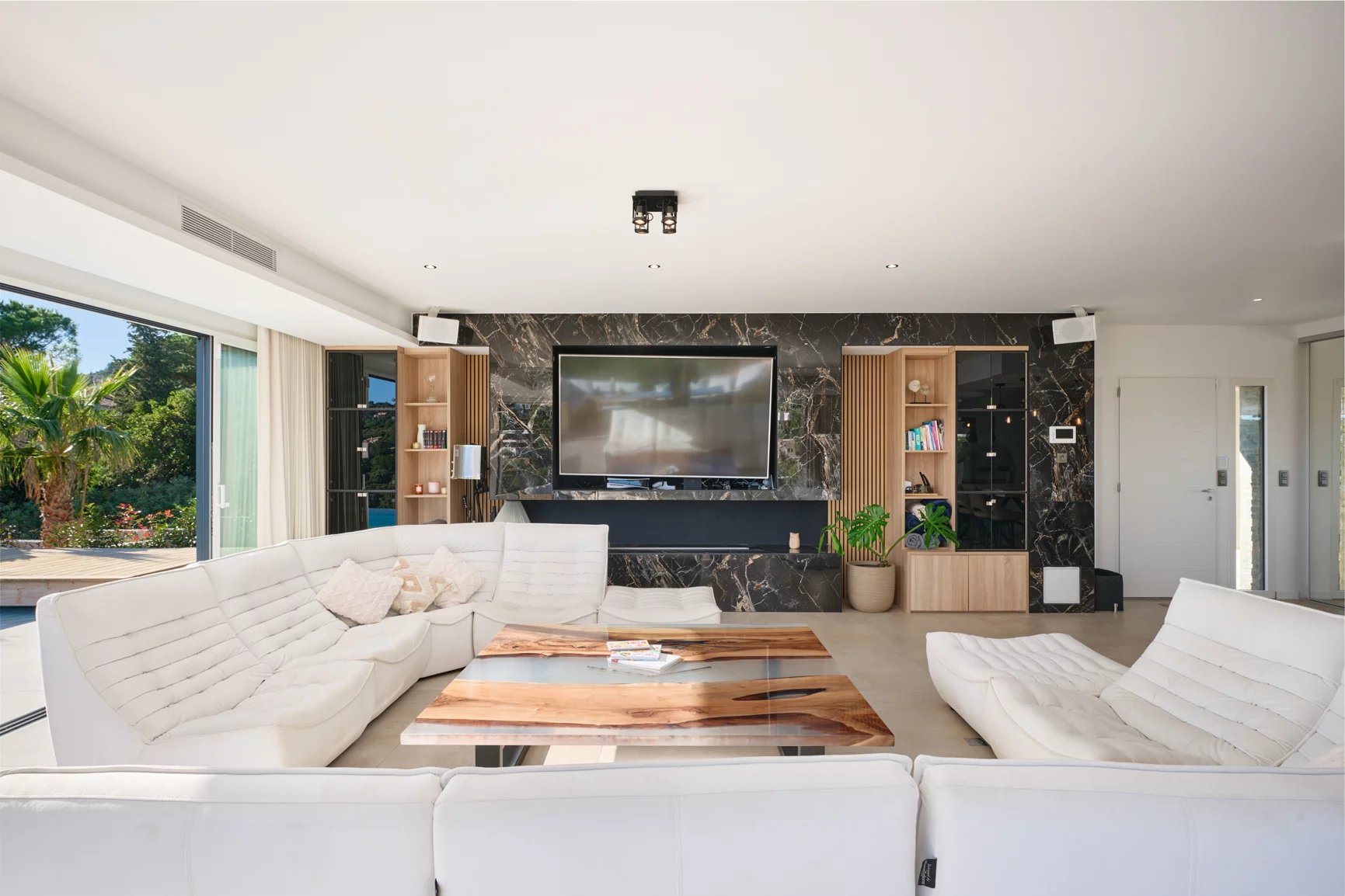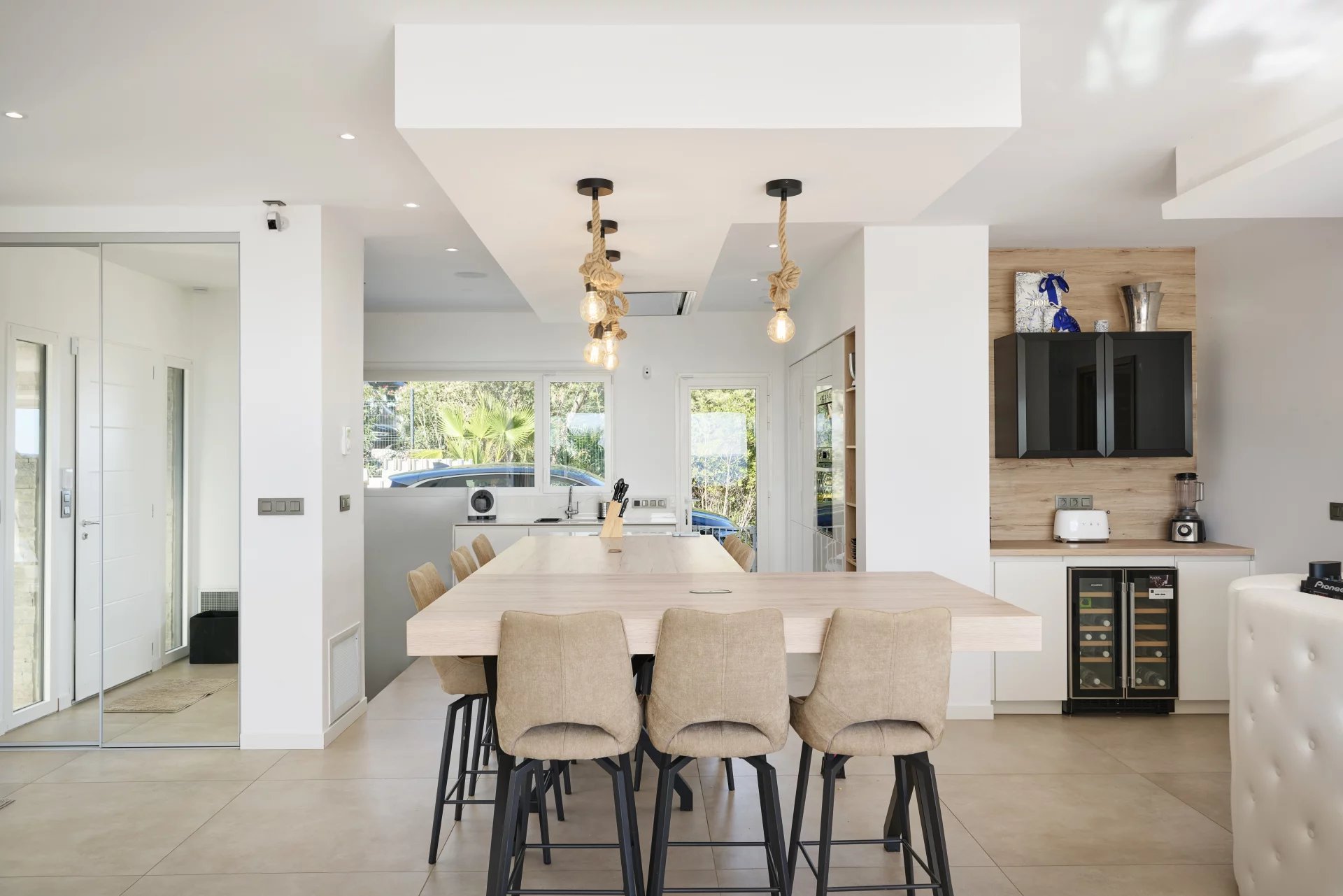 Facing East-Southeast, this high-end villa with an area of approximately 240m2 offers bright and spacious volumes, including a large high-ceiling living room with ducted air conditioning, open to the outside through large aluminum windows and a fully equipped American kitchen.