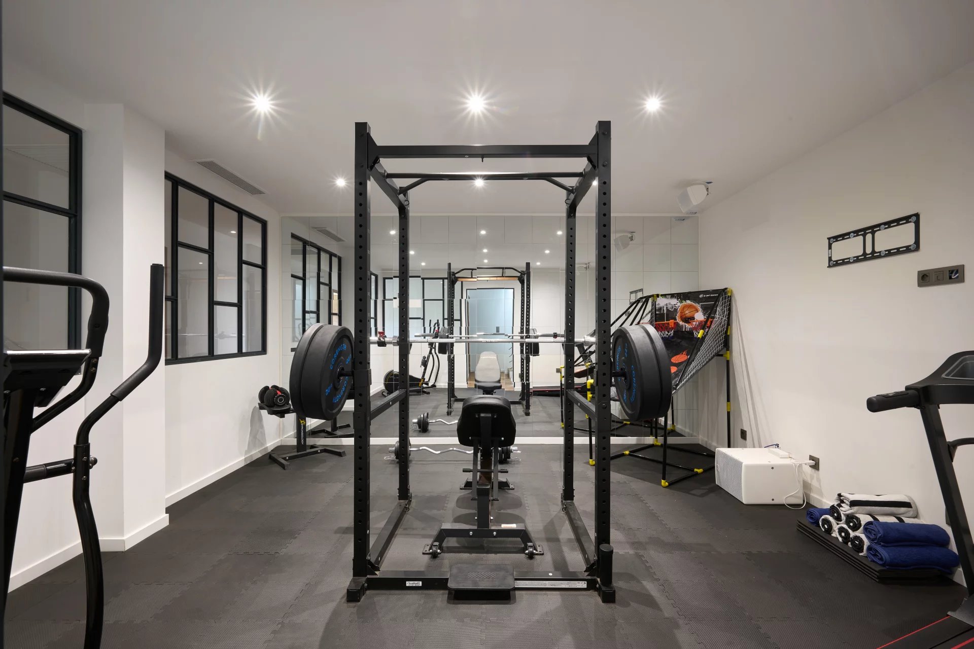 The sleeping area consists of 5 bedrooms, including 1 on the ground floor with a dressing room and shower room, 1 large master bedroom with shower room, balneo bath and storage, 2 other suites with private dressing rooms on the garden level, and 1 additional bedroom that can be converted into a cinema room. An equipped and air-conditioned gym, a laundry room and a storage room complete the set.