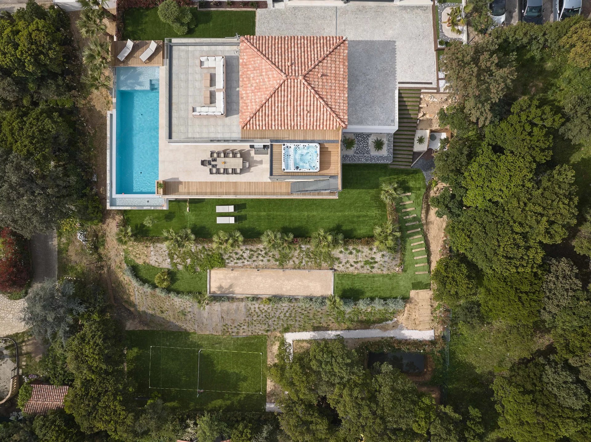 Beautiful and large terraces extend to a heated overflow pool of 12 x 5m surrounded by magnificent palm trees, olive trees and other fruit trees.
