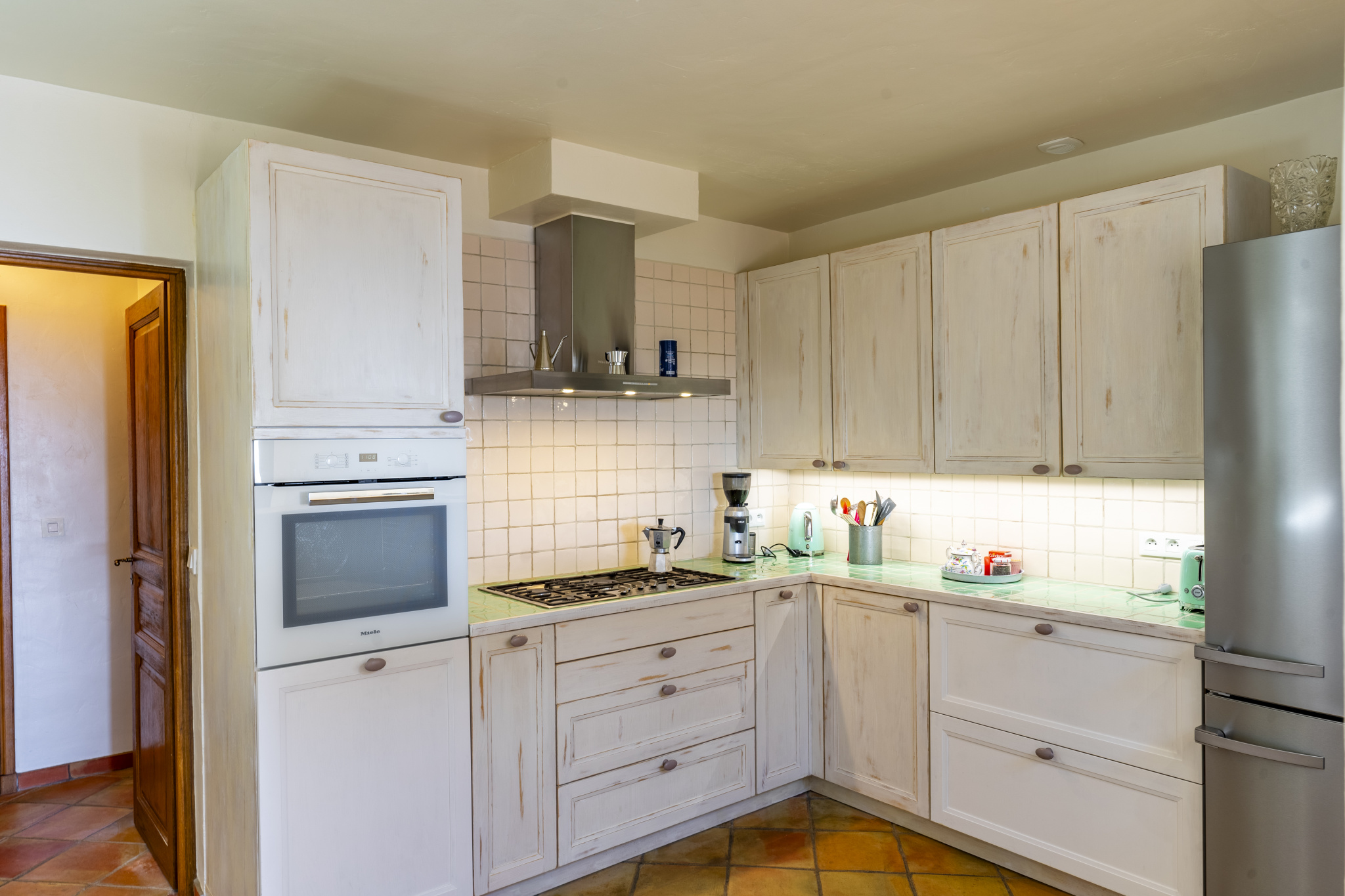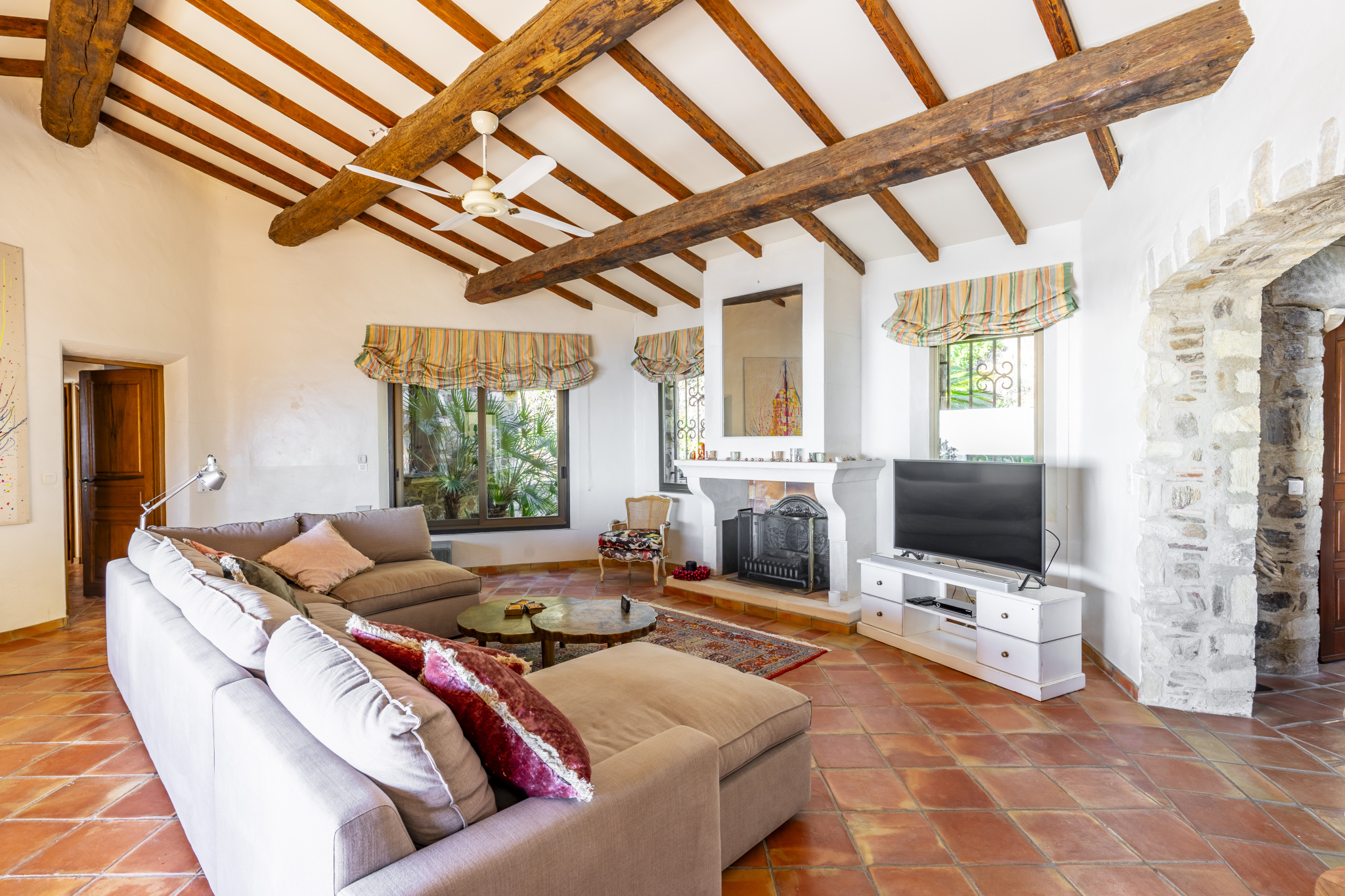 Entirely arranged on one level, the property features an entrance hall leading to a spacious living room with an elegant fireplace, a dining room, and a fully equipped independent kitchen. The night area includes a master bedroom with shower room, three additional suites, an extra bedroom, and a beautiful vaulted wine cellar.