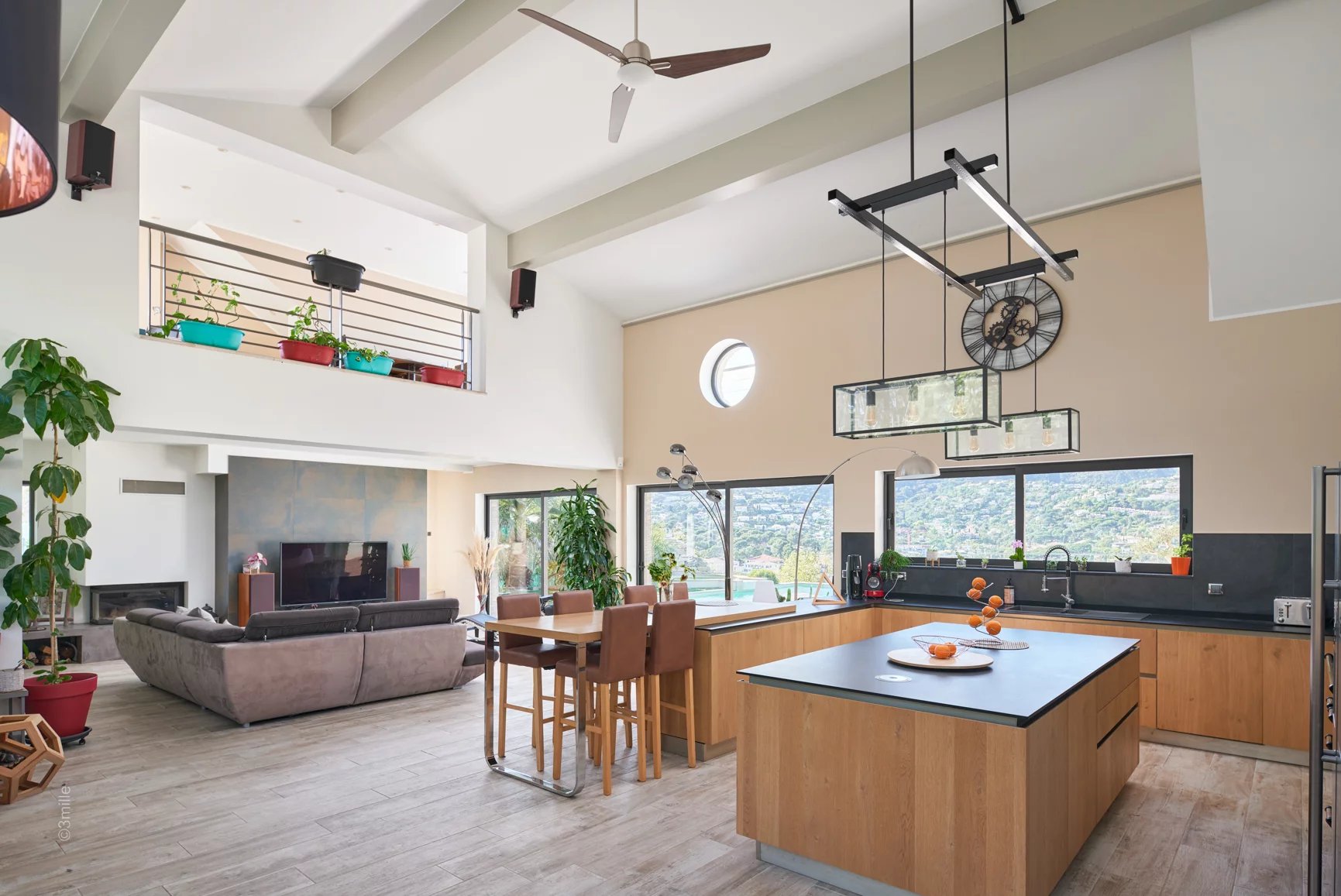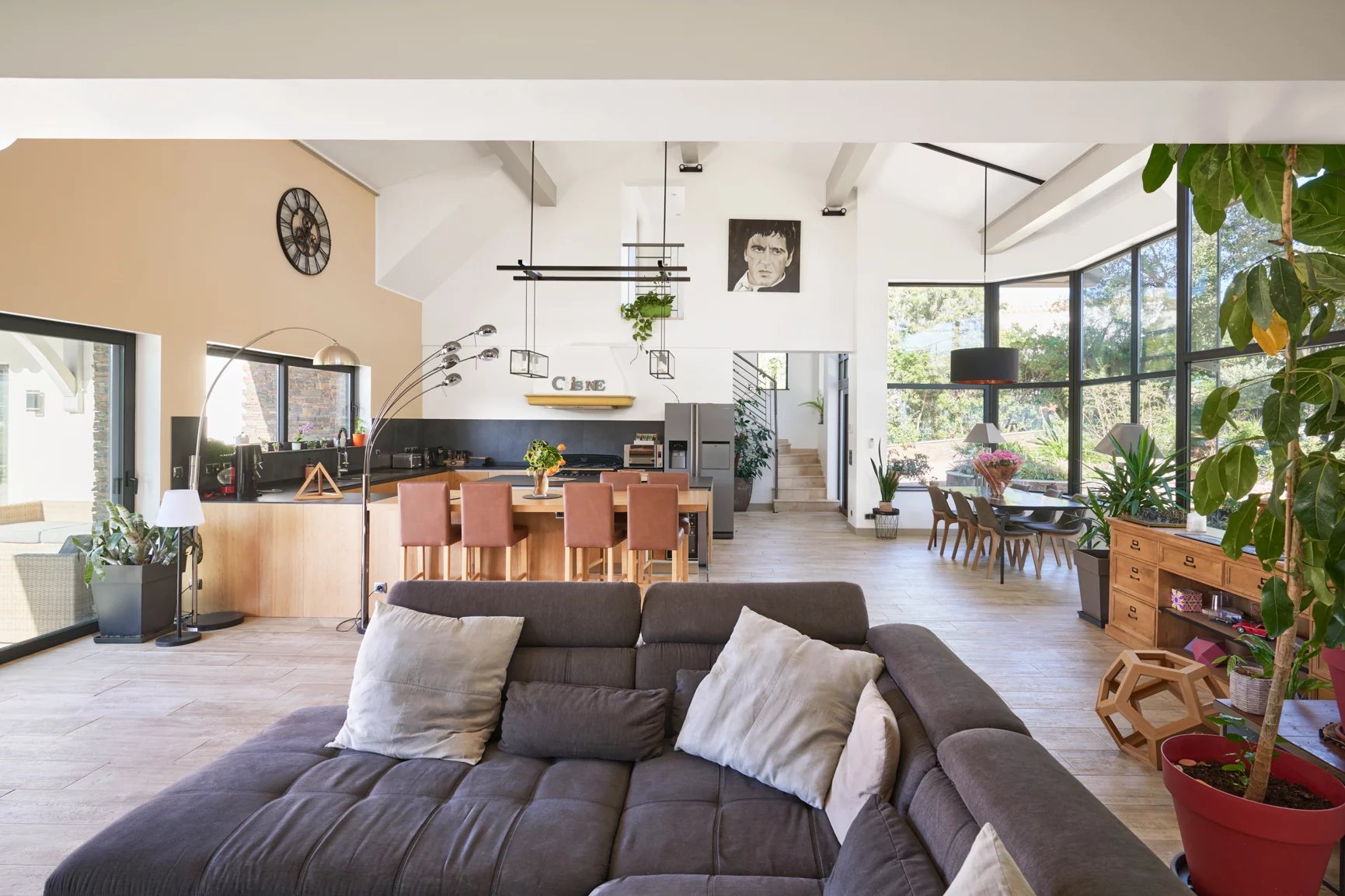 It develops 350 m2 of living space in beautiful volumes with bright rooms, open to the outside and a cathedral living room with large windows and beautiful ceiling heights, plunging the living spaces into nature.
