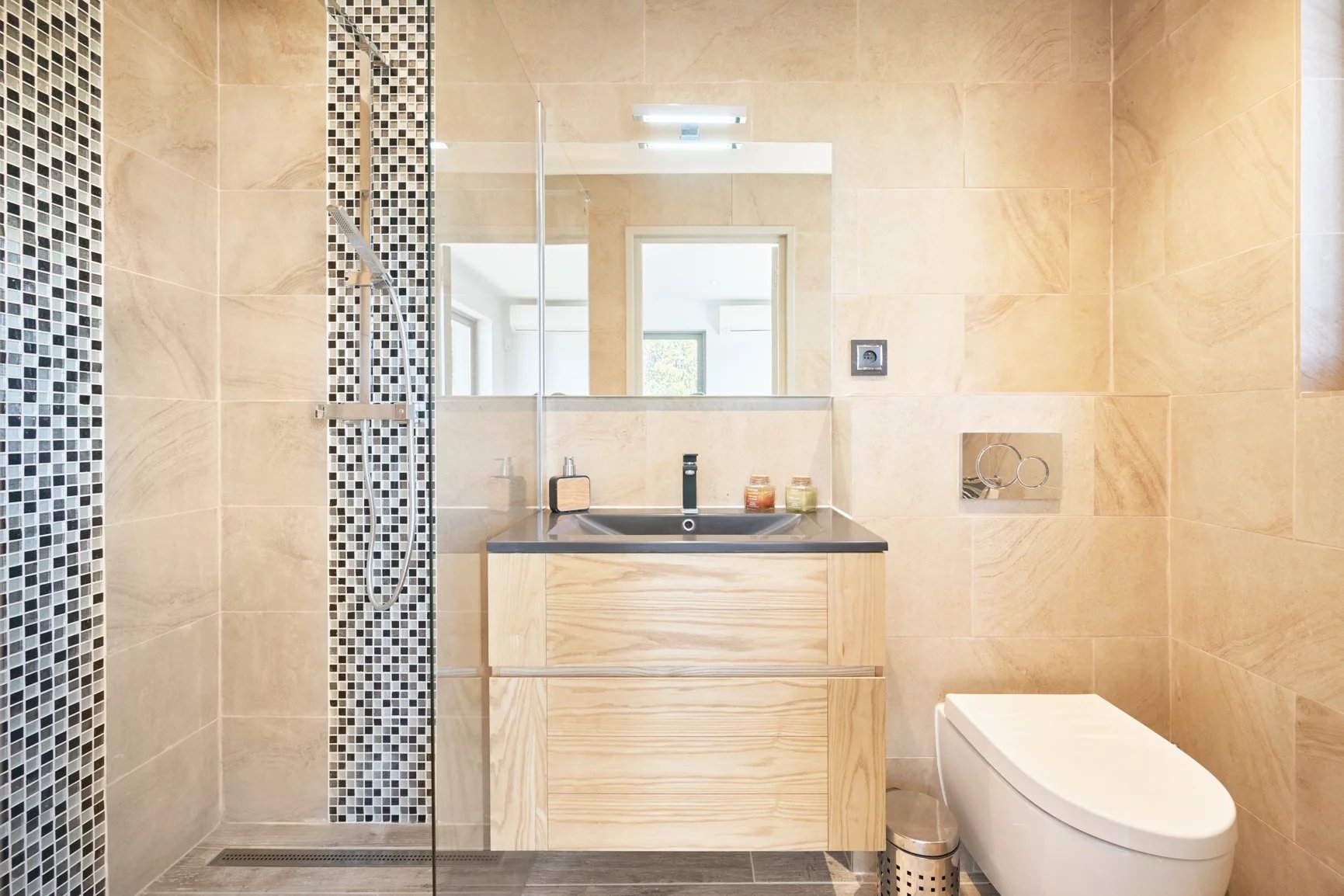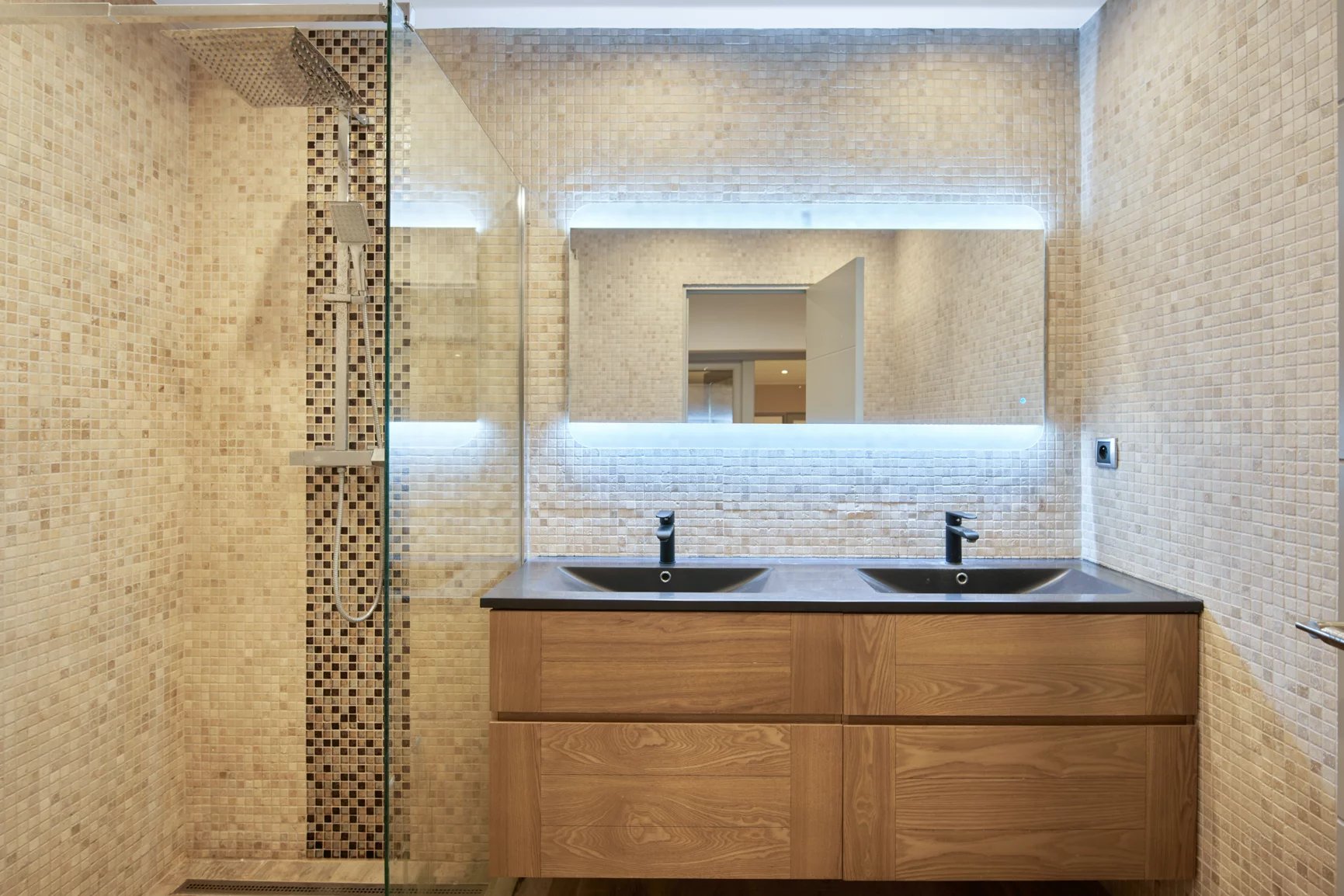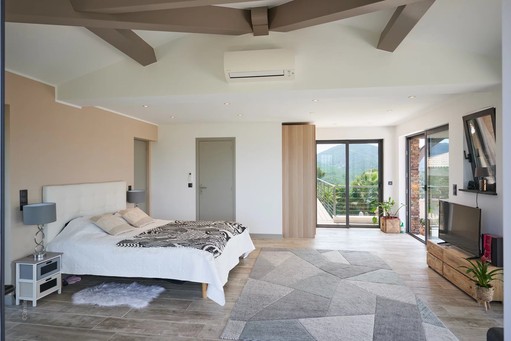 It offers 5 ensuite bedrooms, including a generous parental bedroom, a large living/dining/kitchen area, and a bright and spacious office. Two contemporary rooftop areas with sun loungers and a Jacuzzi are accessible, one from the parental bedroom terrace and the other from the office terrace.