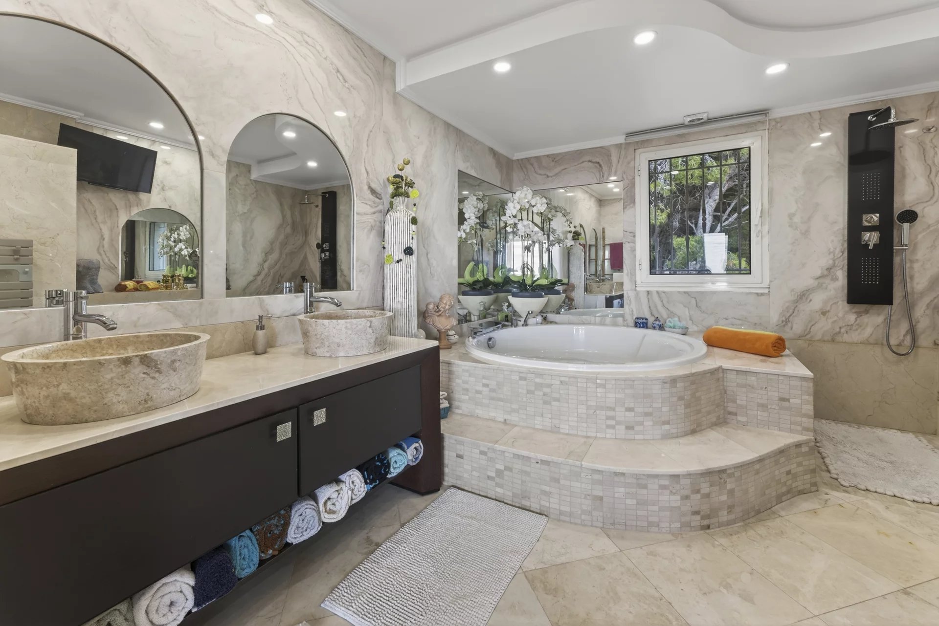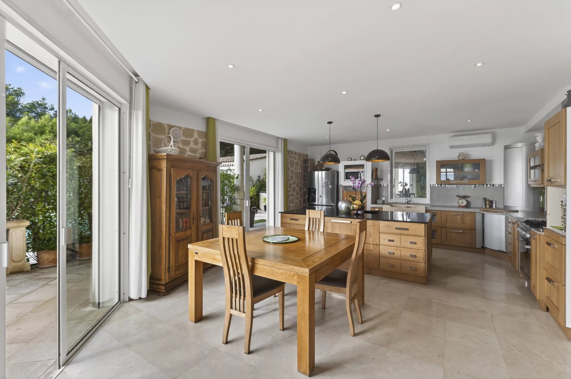 The house is organized around a bright living room of approx. 100m2 opening onto a very large south-facing terrace. Semi-open kitchen of 40m2 + utility room of over 30m2. From this space, you have direct access to the outdoor pool area and its large terrace.