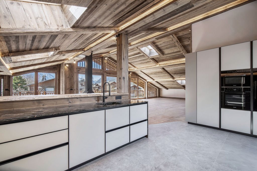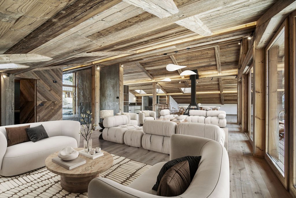 Located in the centre of Chamonix, this new chalet of more than 564 sqm combines exceptional spaciousness and a privileged location to offer breathtaking views of Mont Blanc. Its majestic living room, enhanced by a cathedral ceiling, central fireplace and large picture windows, opens onto a vast terrace, inviting you to contemplate.