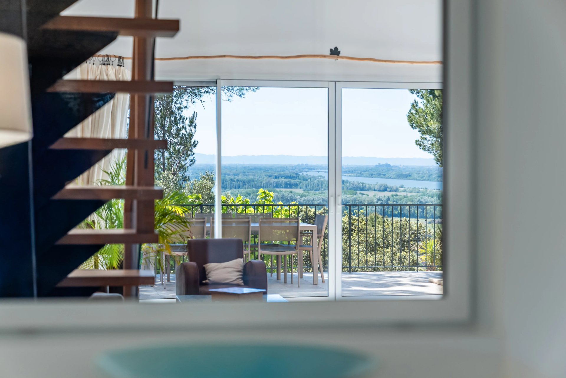 This house for sale in Chateauneuf-du-Pape boasts a breathtaking 360 degree panoramic view over the iconic landscapes of the Rhone Valley. The eye is drawn across the surrounding vineyards, the Rhone River, the Alpilles, the Cévennes, and even the Palais des Papes, offering a rare and spectacular living environment.