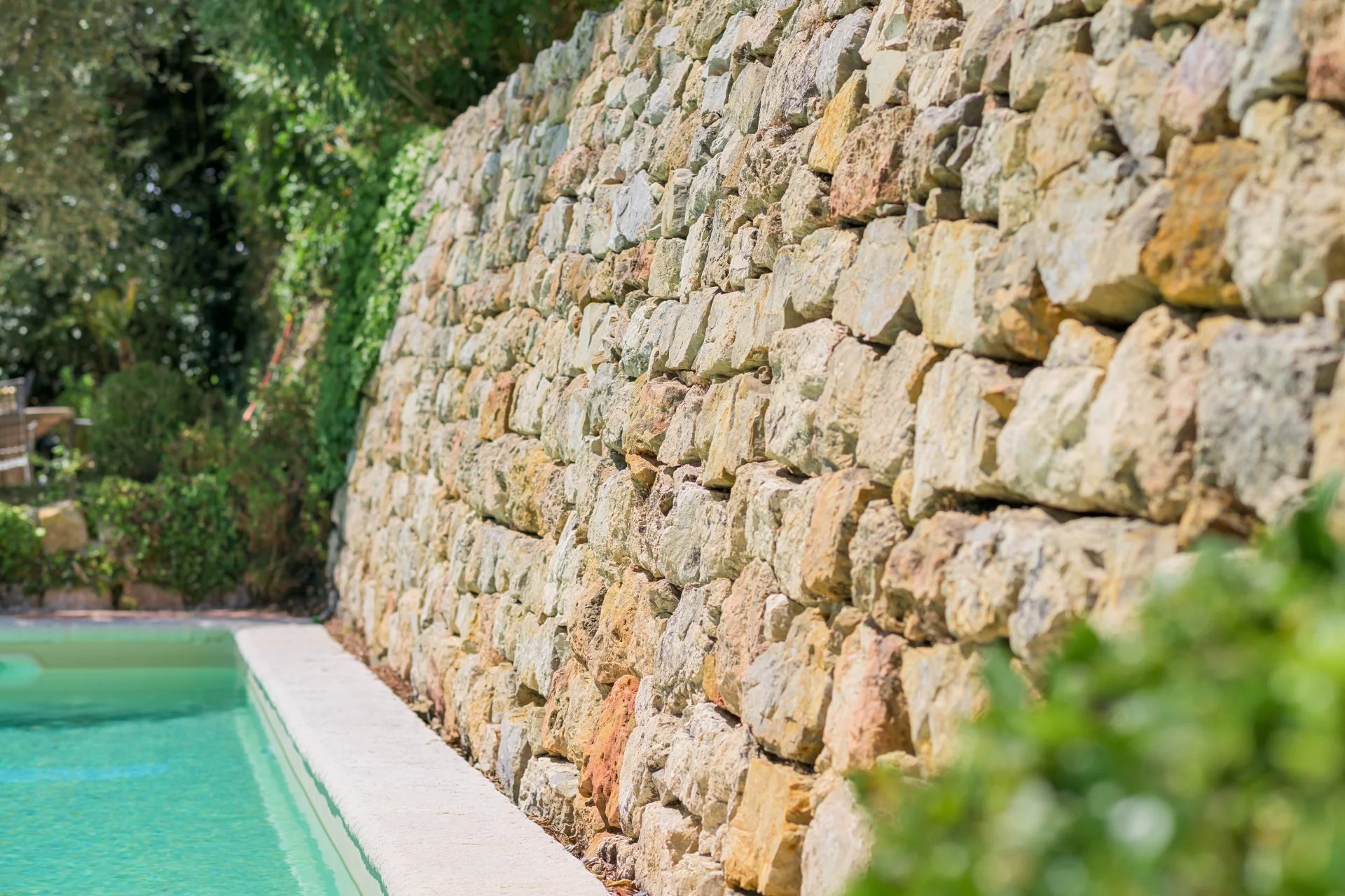 Set on south facing landscaped Mediterranean grounds of 1,485m2 with olive trees and stone walls, several terraces, and heated swimming pool.