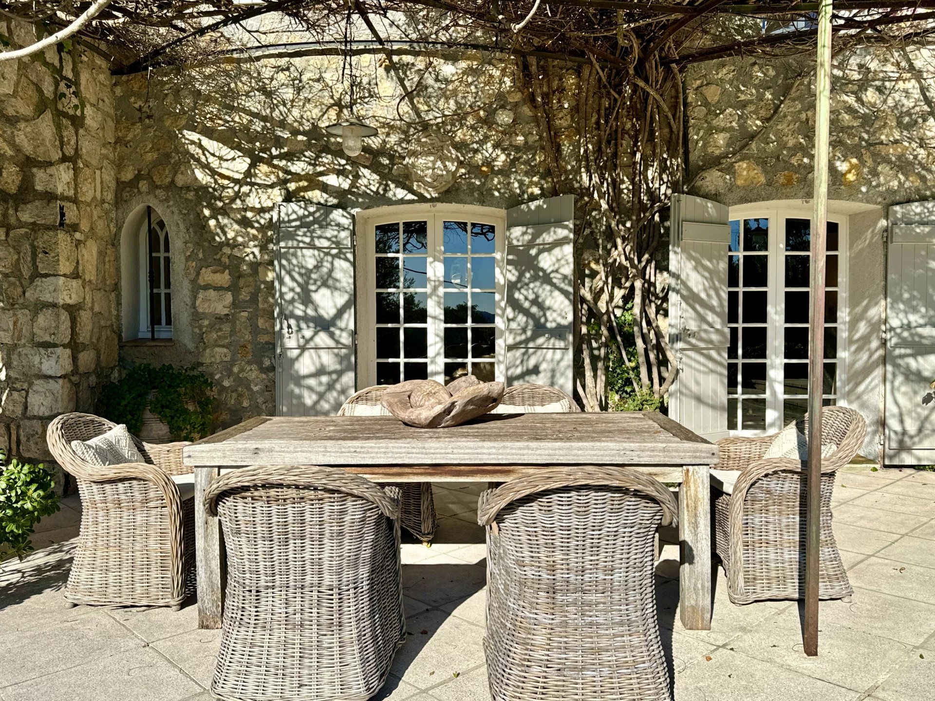Farmhouse for sale in Chateauneuf de Grasse – Discreetly elegant, this beautiful 19th century “Mas” is an original “Bergerie” with original thick stone walls, and beamed ceilings throughout.