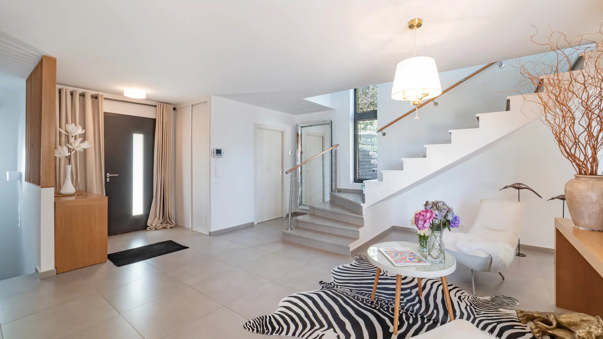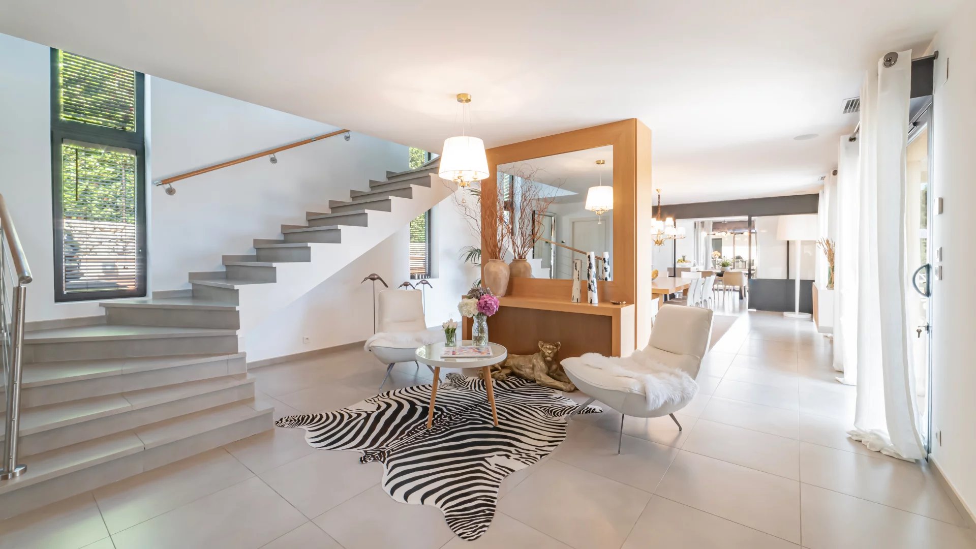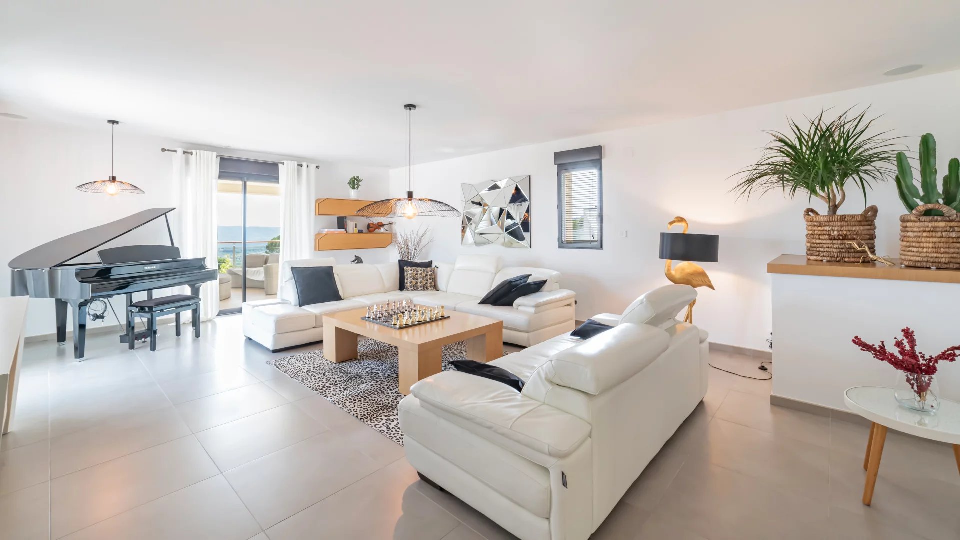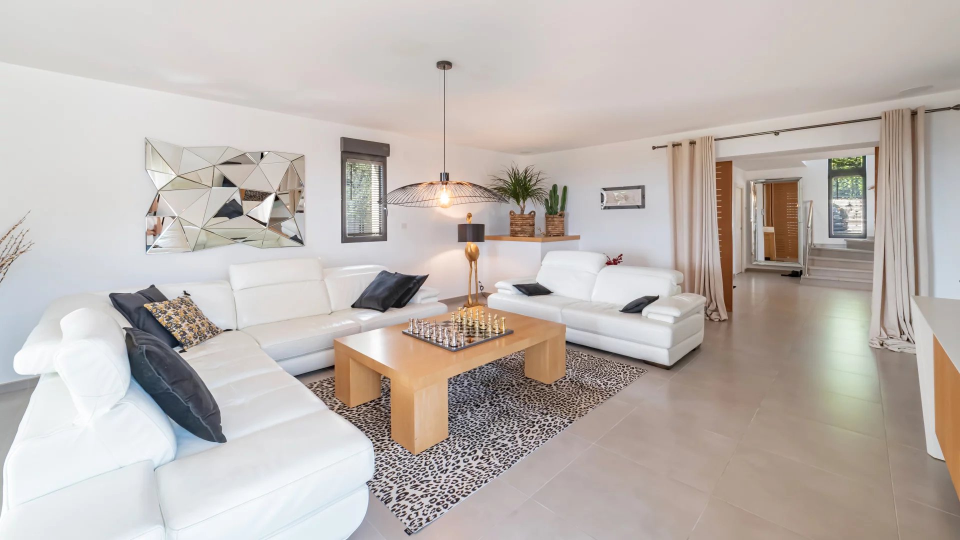 On a plot of approx. 1700 m2 with wonderful sea view, beautiful new contemporary villa of approx. 280 m2 living space on 3 levels with first floor: Entrance hall with toilet, large furnished living room, large dining room, fully equipped adjoining kitchen opening onto large terrace with pool and Jacuzzi. Pool House – Independent studio with toilet and shower room and outdoor shower and WC