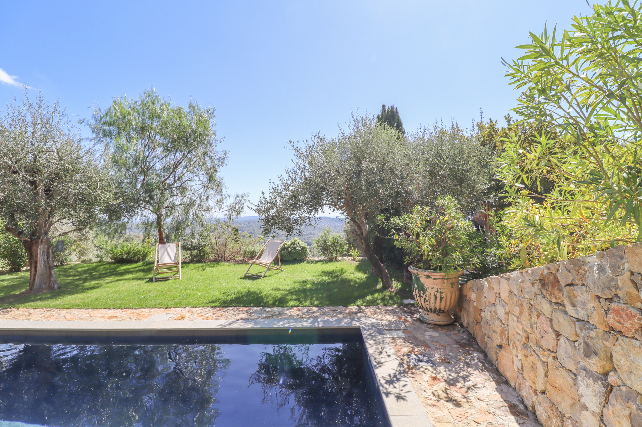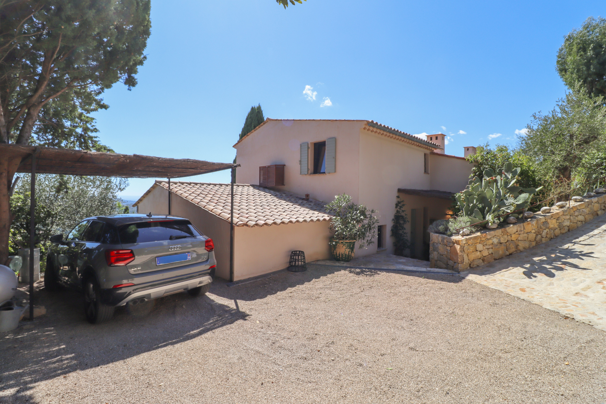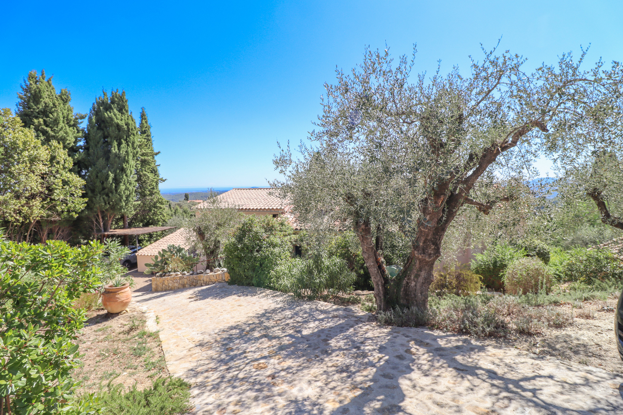 This property stands out for its panoramic sea view, the quality of its renovation carried out under the supervision of the French Heritage Authorities (*Batiments de France*), its generous volumes, and its refined finishes. It is set in a quiet and sought-after residential area, close to Valbonne, Opio, and all amenities.