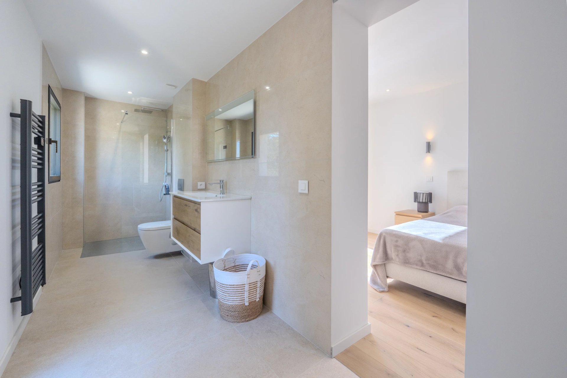 The property offers a remarkable master suite of about 60 m2, a true private space with generous volumes, as well as four en-suite bedrooms upstairs, ensuring optimal comfort for hosting family and guests. A laundry room discreetly completes this set with functionality.