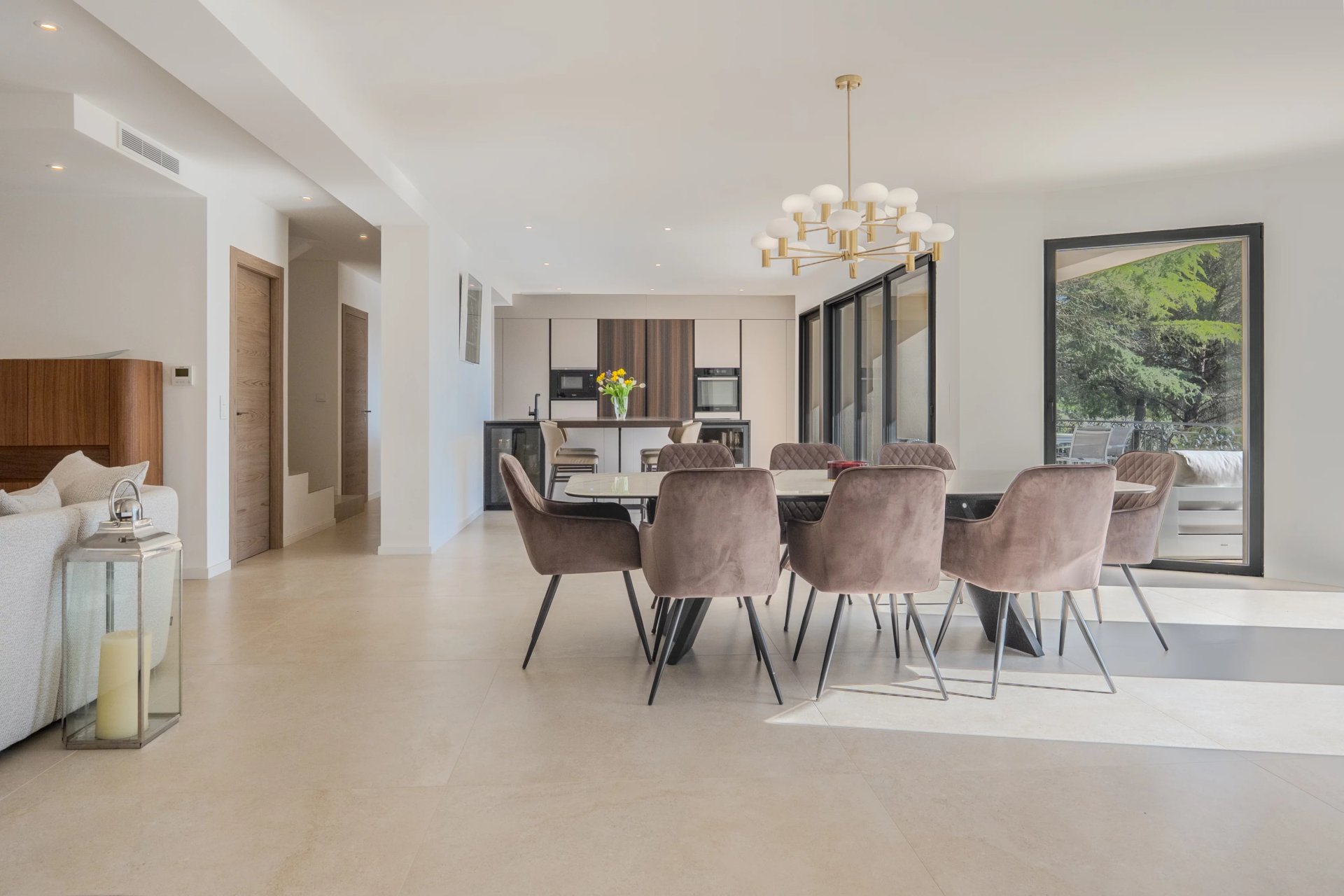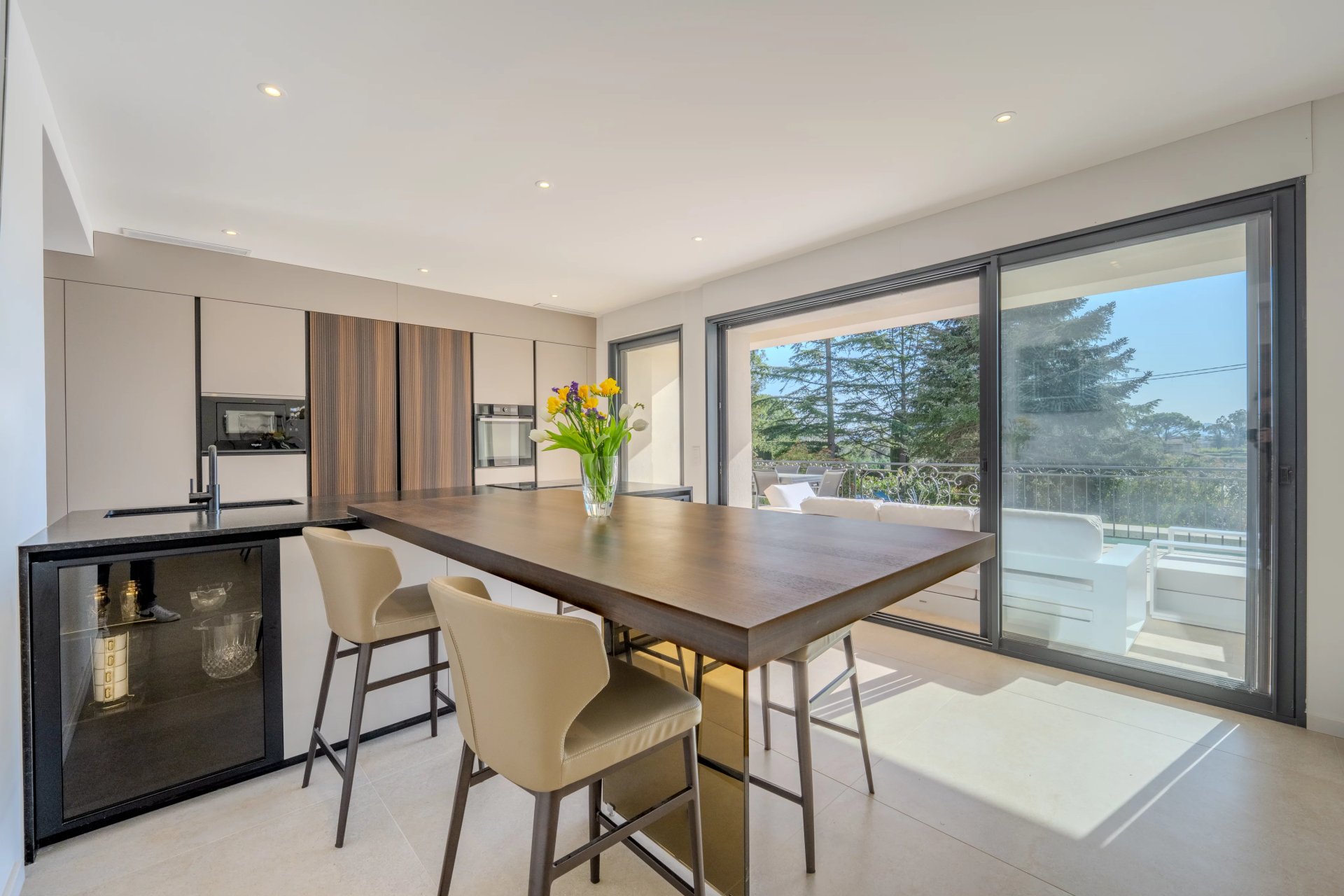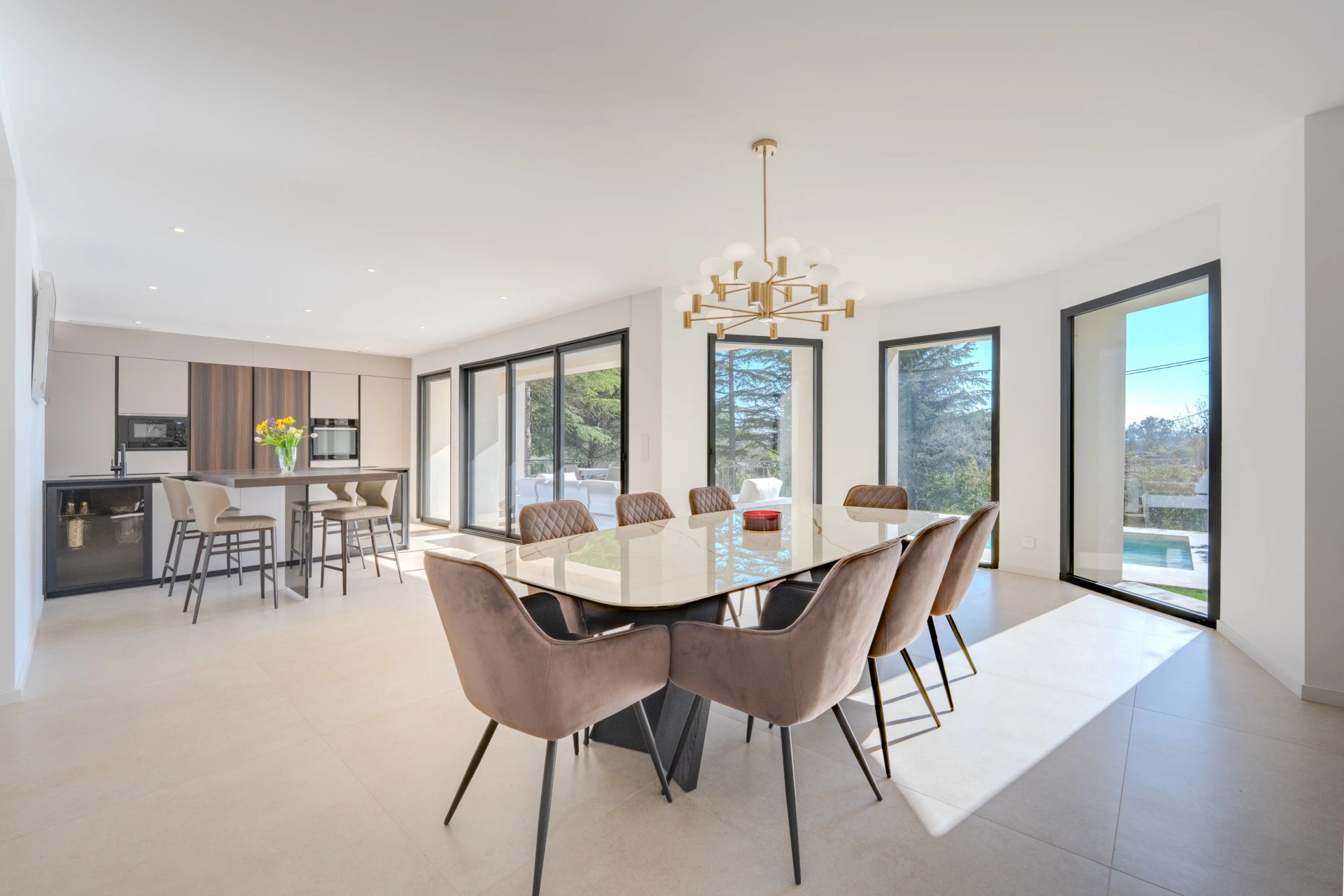 Developing about 320 m2 (260 m2 + 60 m2 semi-basement converted), the villa has undergone a complete renovation with particularly meticulous finishes. The reception areas, flooded with light, open onto a large living room with a fully equipped contemporary kitchen, in natural continuity with the terraces and landscaped garden.