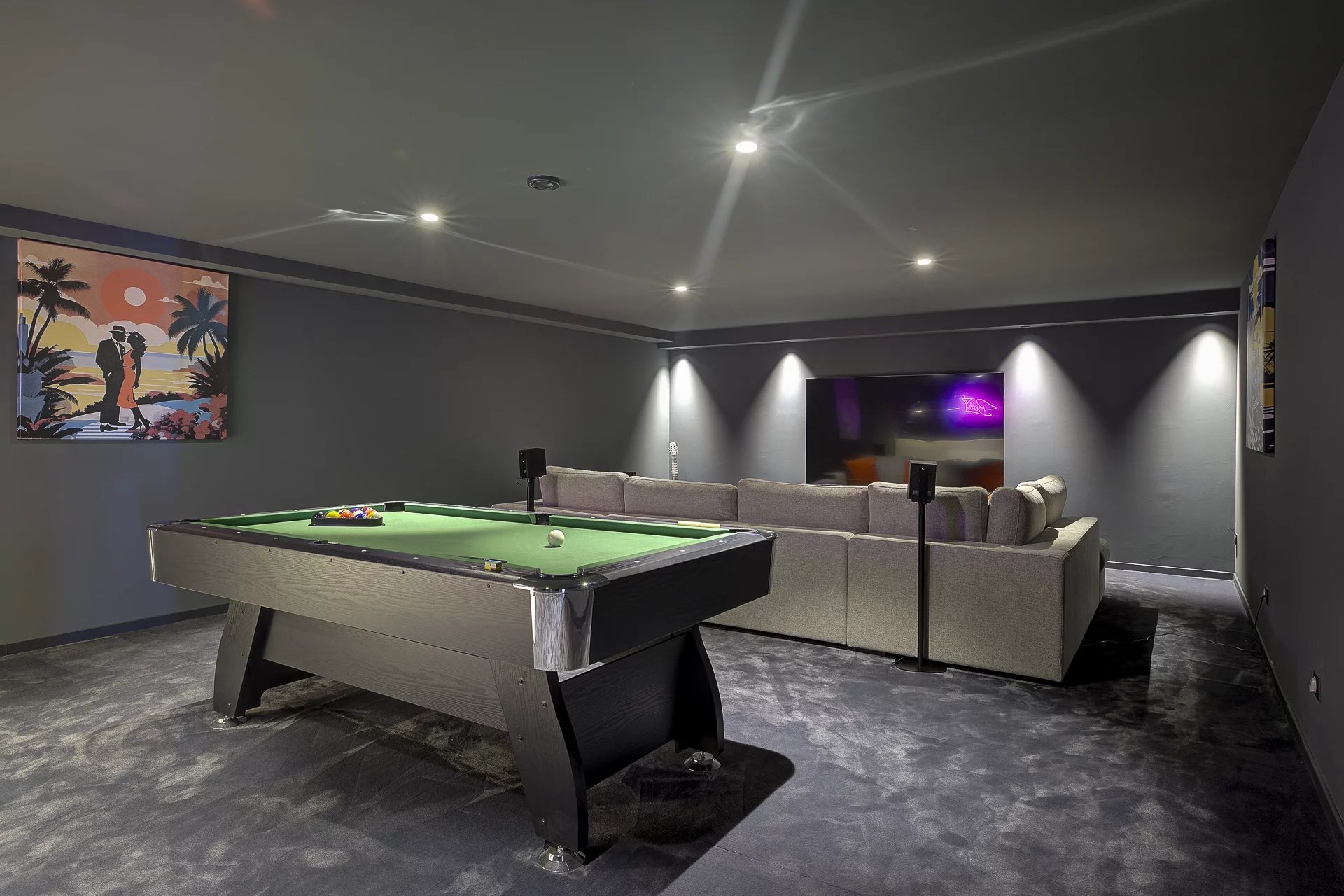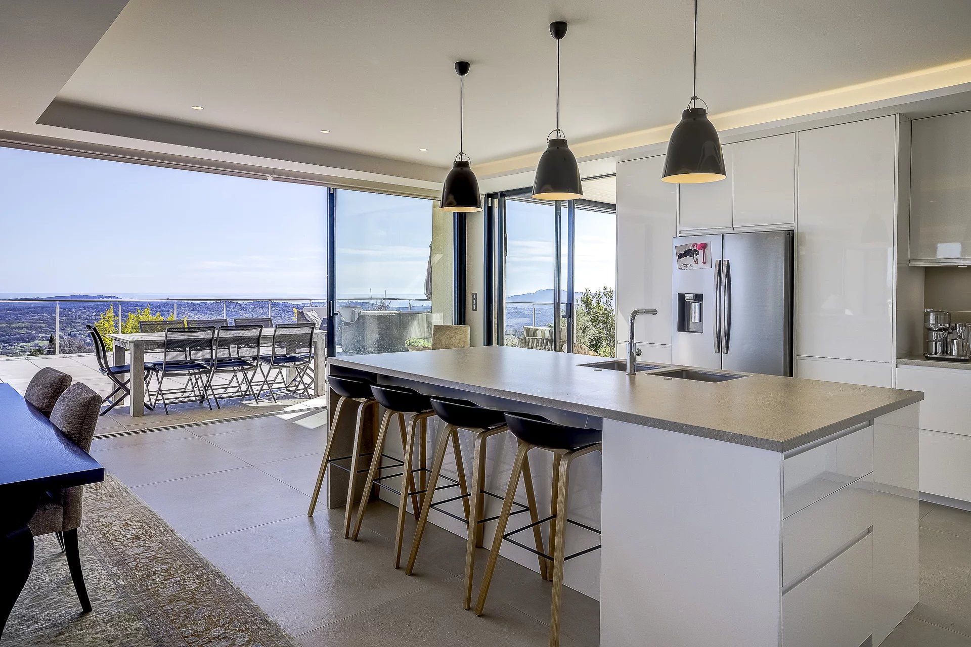Offering around 540 m2 of living space, the villa features an open plan living/dining room and fully equipped kitchen – large floor-to-ceiling windows open onto the terraces and fantastic views – 5 air-conditioned bedrooms with en suite bathrooms, a 50 m2 movie lounge, a 40 m2 study or additional bedroom.